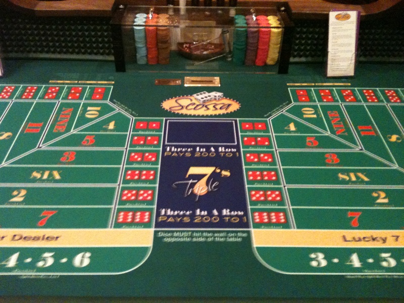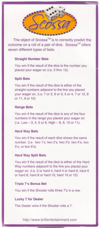 Scossa 是一款骰子游戏,我于 2011 年 5 月 17 日在拉斯维加斯红岩赌场酒店 (Red Rock) 注意到了它。当时赌桌已经关门了,但他们恰好提供了规则卡。如果我没记错的话,“scossa”在意大利语中是“掷”的意思,就像掷骰子一样。