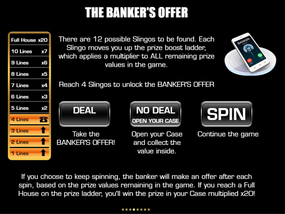 - 在第二阶段的每一轮之后,如果玩家已经覆盖了至少四条线,那么支付额外旋转的替代方案是接受银行家的提议,出售他的箱子并退出或打开他的箱子并保留里面的金额。
