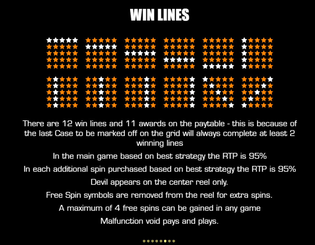 帮助屏幕上显示,所有投注的玩家回报率 (RTP) 为 95%。这包括初始投注、接受庄家出价以及额外旋转的费用。我相信这是真的。如果不知道百搭牌、魔鬼牌和免费旋转的概率,我几乎无法自己分析游戏。