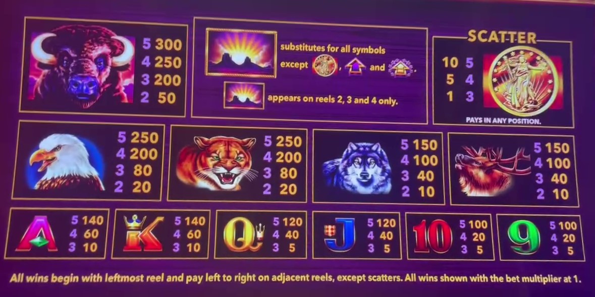 - 线支付符号包括水牛、鹰、美洲狮、狼、雨鹿、A、K、Q、J、10 和 9。