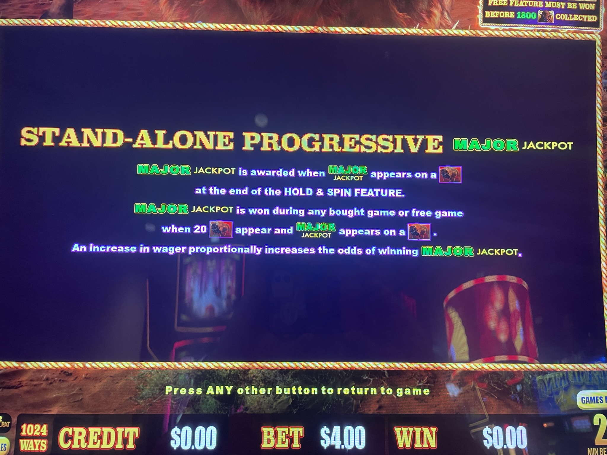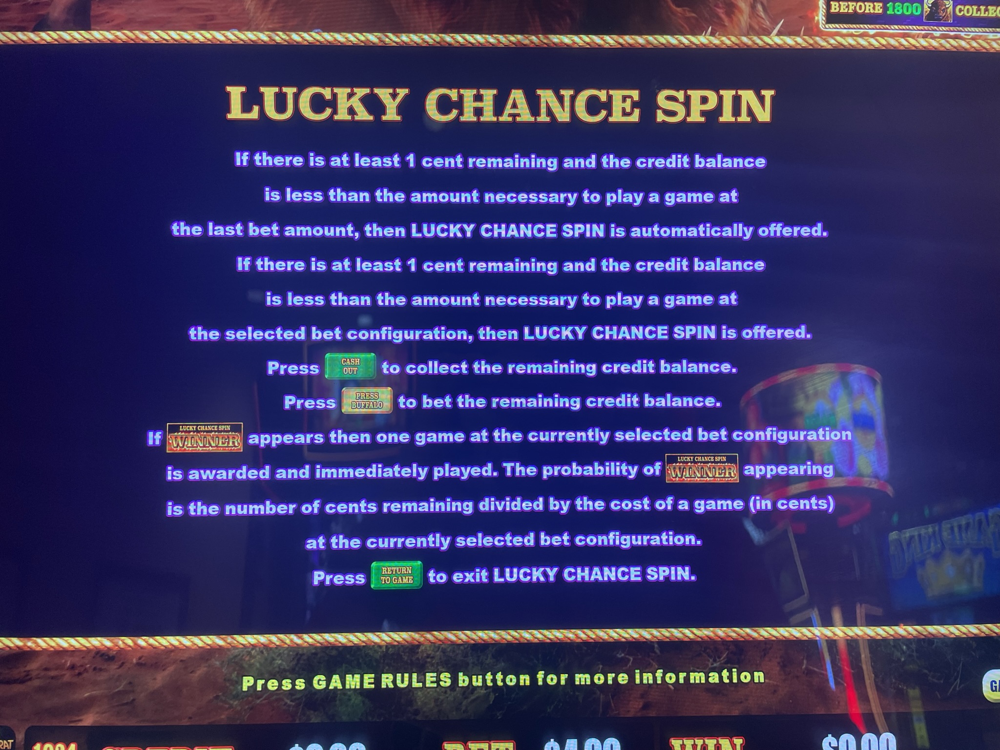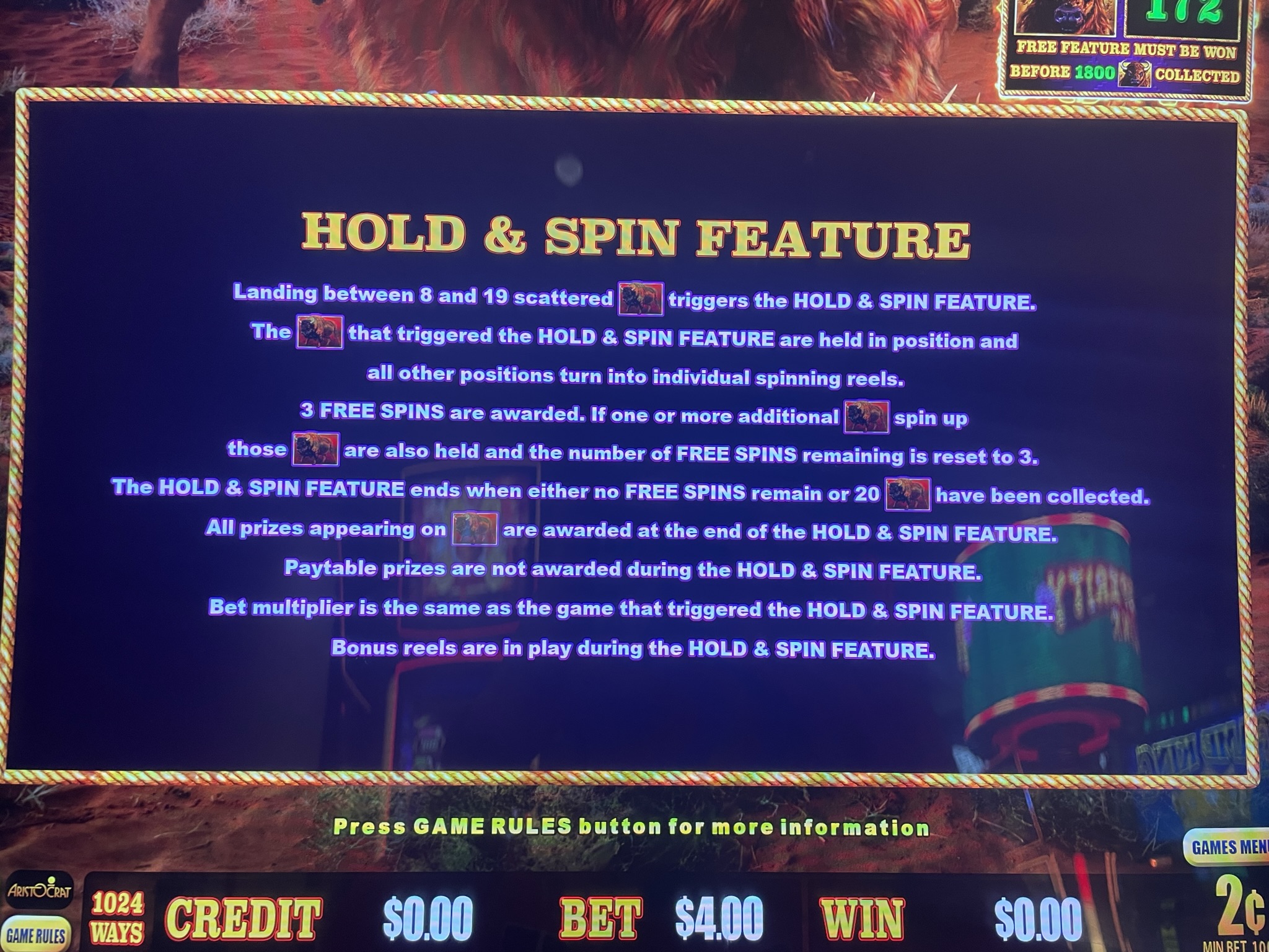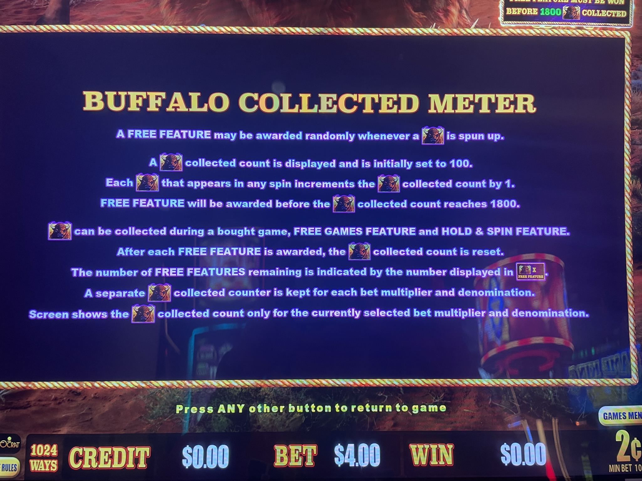 正如规则中提到的,每次收集到水牛头,它都会被存入我称之为“免费功能”的银行。这个银行会重置为100,并且必须达到1800才能击中。如果游戏接近1800个水牛头,那么赔率就会转向对玩家有利。