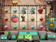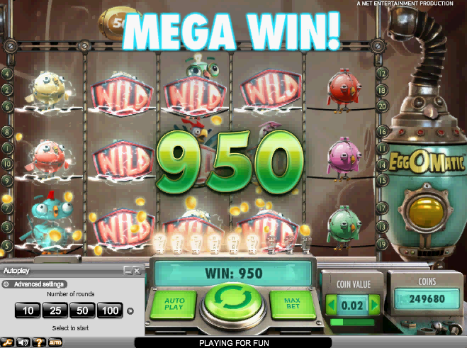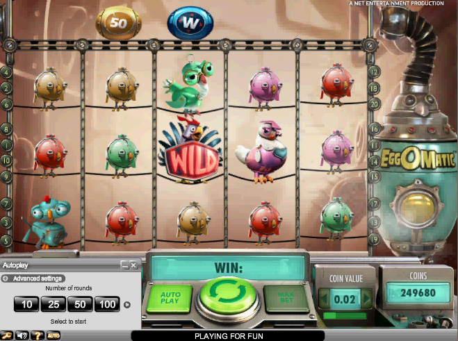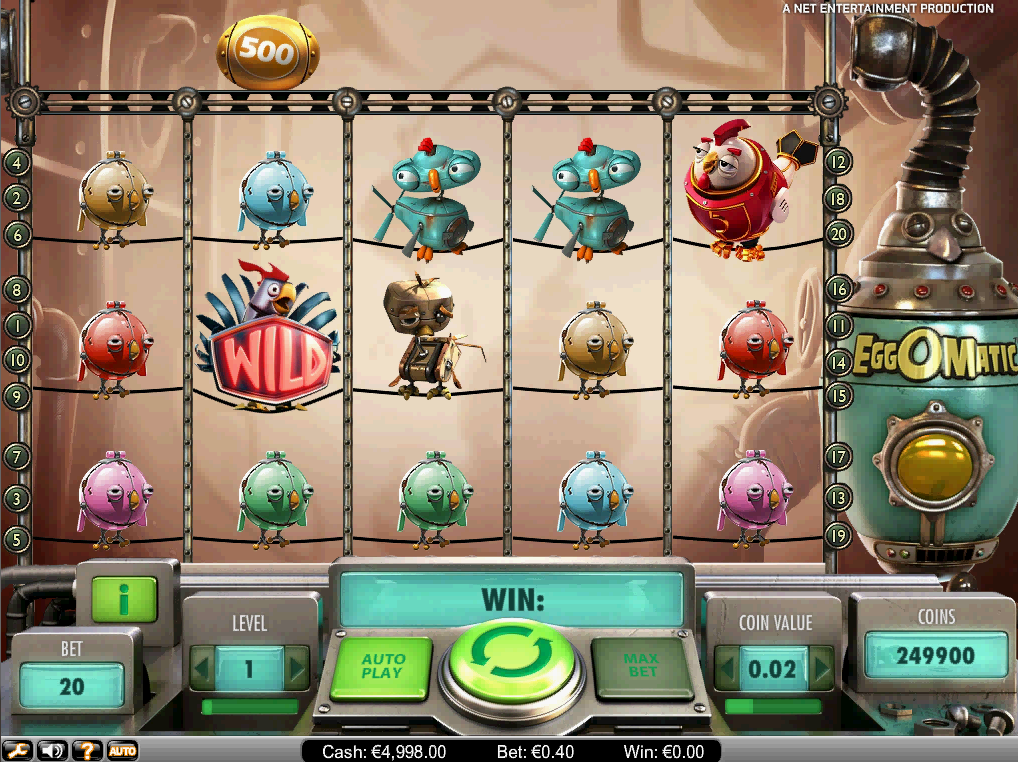 EggOMatic 的主题是会下金蛋的机械鸡。其蒸汽朋克风格非常出色。设计亮点在于卷轴上方的传送带,它会随机传送奖品鸡蛋。如果鸡蛋正下方出现百搭符号,它会掉落打开,并显示积分(50 到 2500)、免费旋转奖励或向四周扩展的百搭符号。