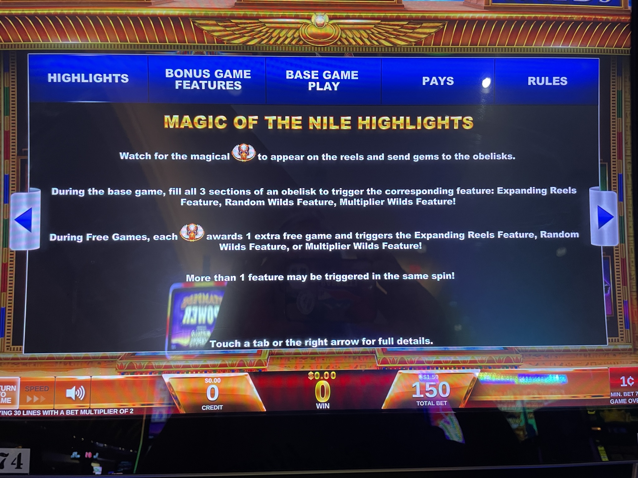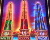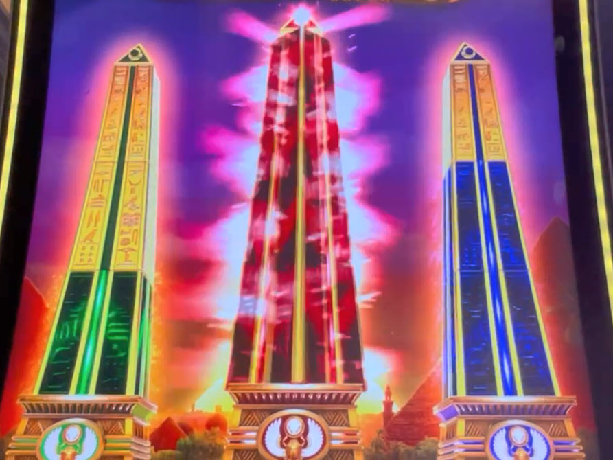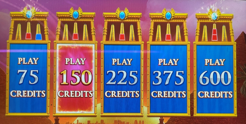 游戏提供五个不同的投注级别。每个级别都像一个独立的游戏,处于不同的状态。对于老虎机爱好者来说,幸运的是,投注面板会显示五个级别中每个方尖碑亮起的碎片数量。如果至少有两块碎片亮起,方尖碑上方的宝石就会像钻石一样闪闪发光,这让操作更加简单。例如,下图中,0.75 美元和 6.00 美元的投注级别分别亮起两块碎片,而方尖碑上方的宝石也闪闪发光。