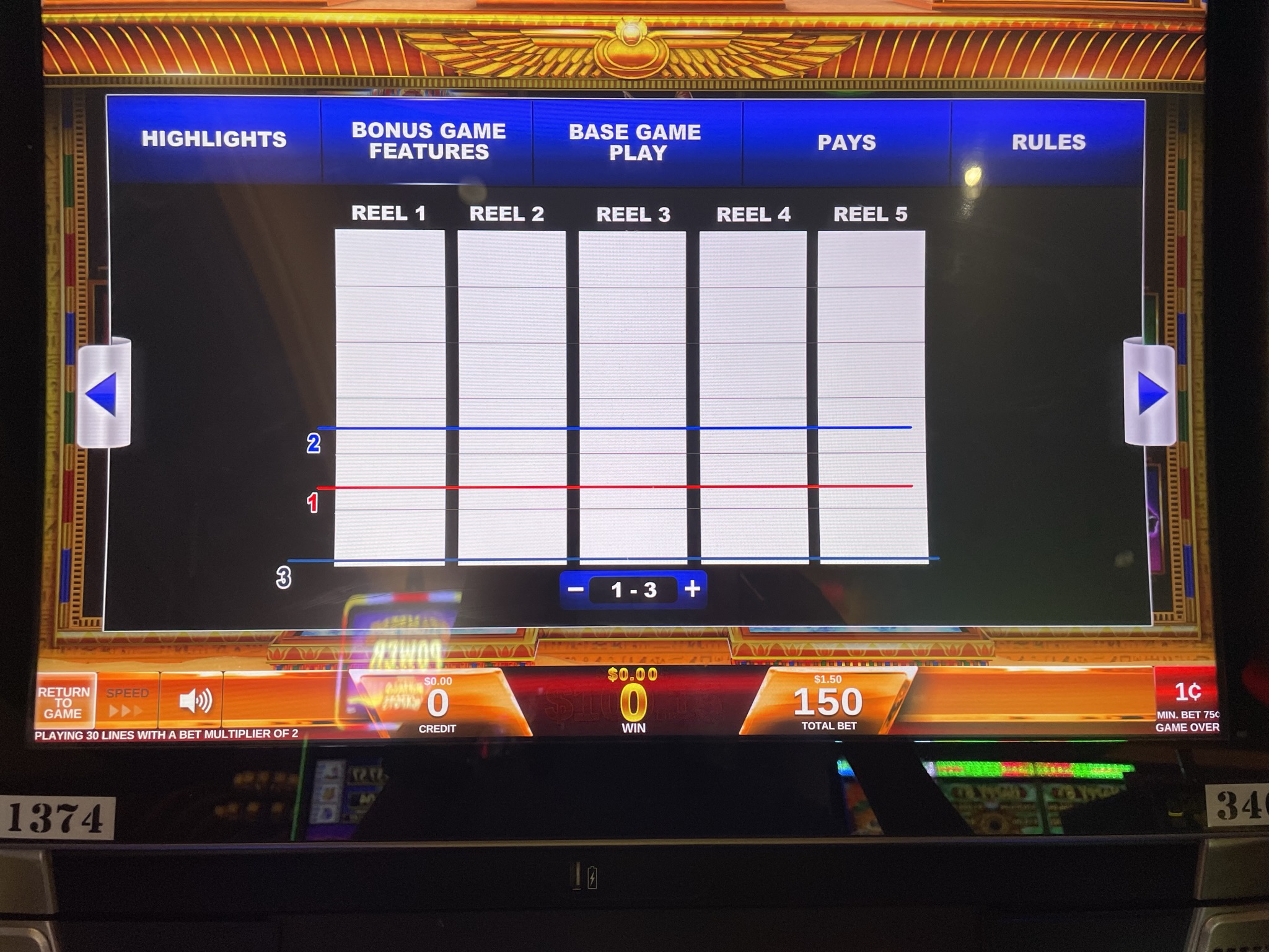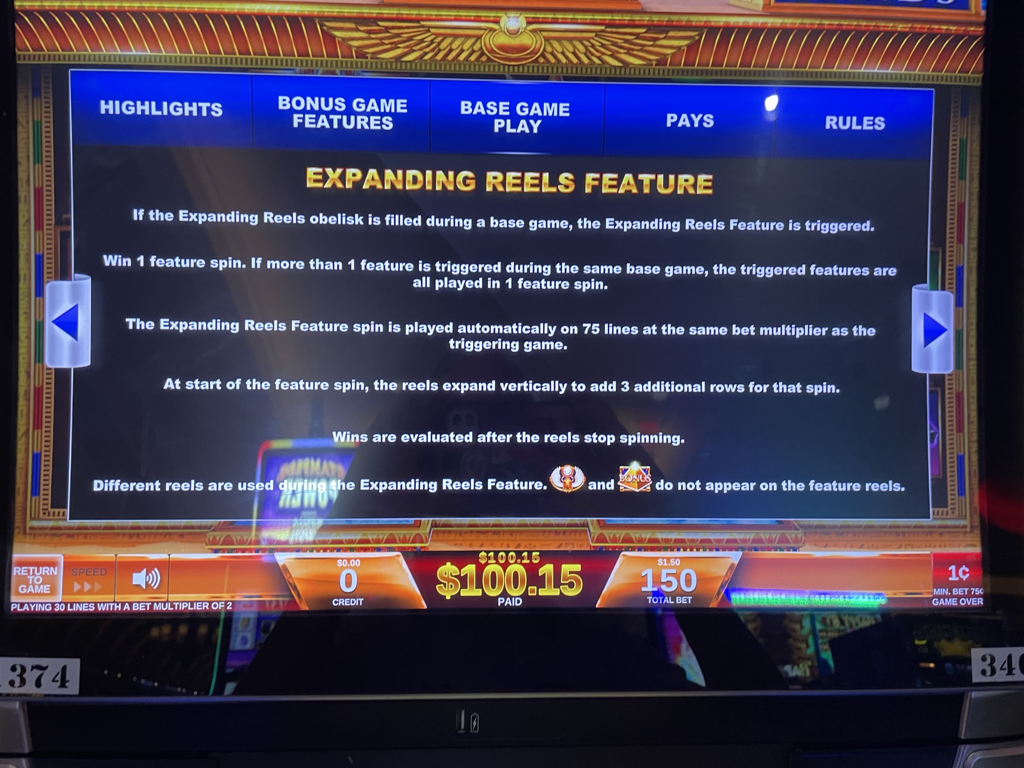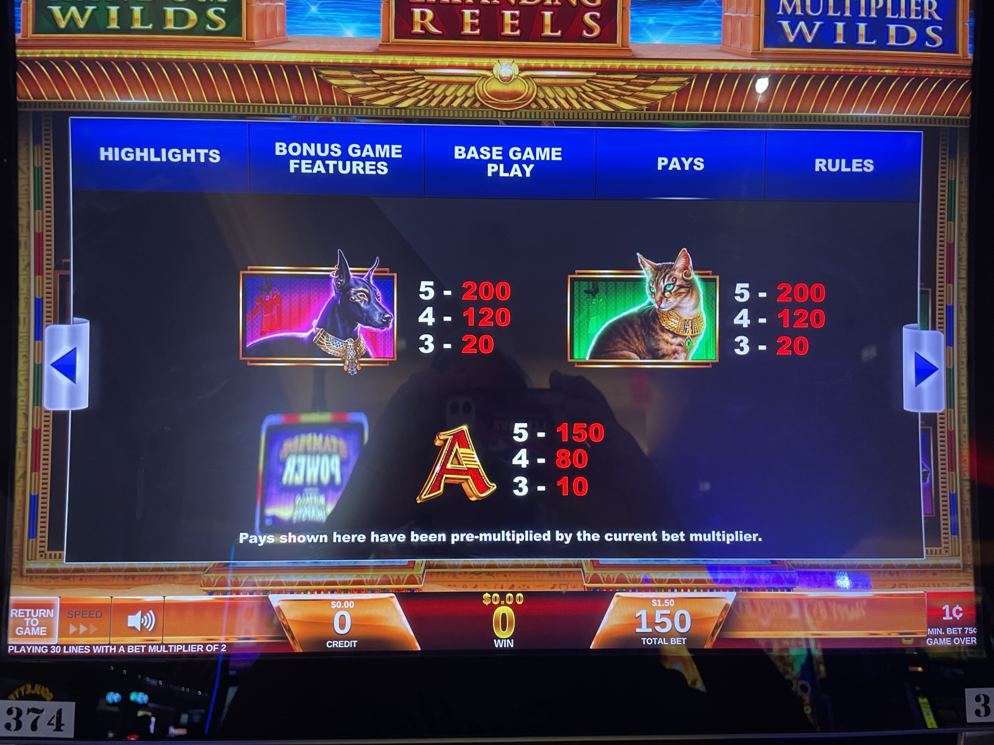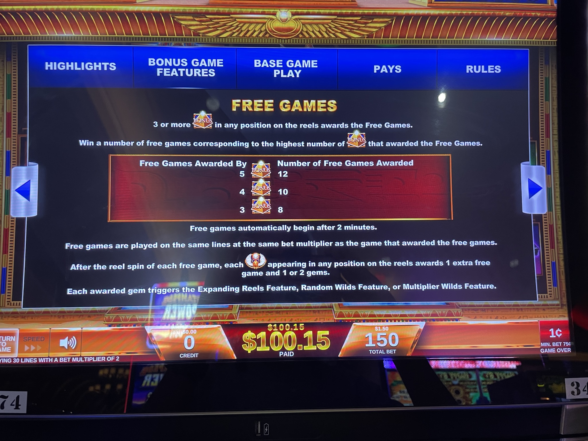 - 每次下注需要 75、150、225、375 或 600 个积分。我见过的所有游戏,每个积分价值 0.01 美元。因此,下注金额可以是 0.75 美元、1.50 美元、2.25 美元、3.75 美元或 6.00 美元。所有下注级别的游戏玩法相同。奖金与下注金额成正比。例如,如果玩家下注 6.00 美元,那么同样的奖金将是下注 0.75 美元玩家的 8 倍。