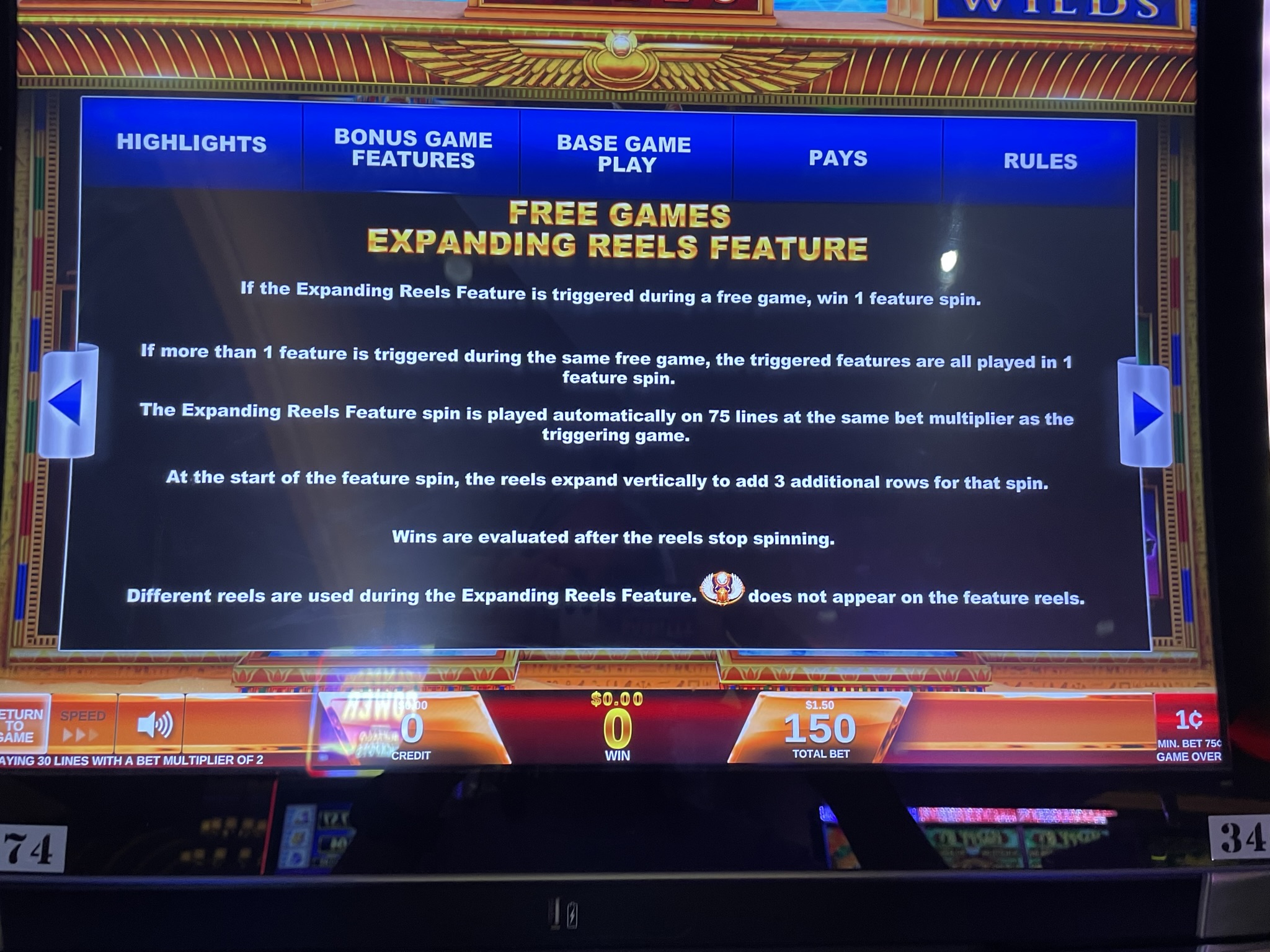 在下面的例子中,您可以看到转轴扩展到六行。我的总奖金为18美元,基于0.75美元的投注,相当于初始投注金额的24倍。