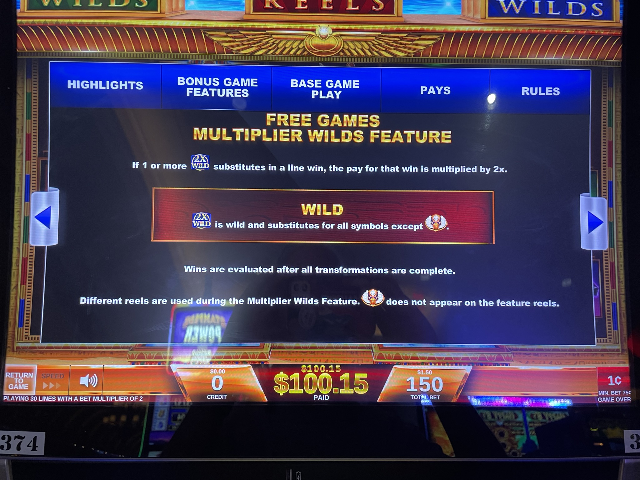 在下面的例子中,你可以看到我自然获得的百搭符号上出现了2倍的赔付。最终赢了27.50美元。根据我在初始旋转中下注的0.75美元计算,这相当于我投注金额的36.7倍。
