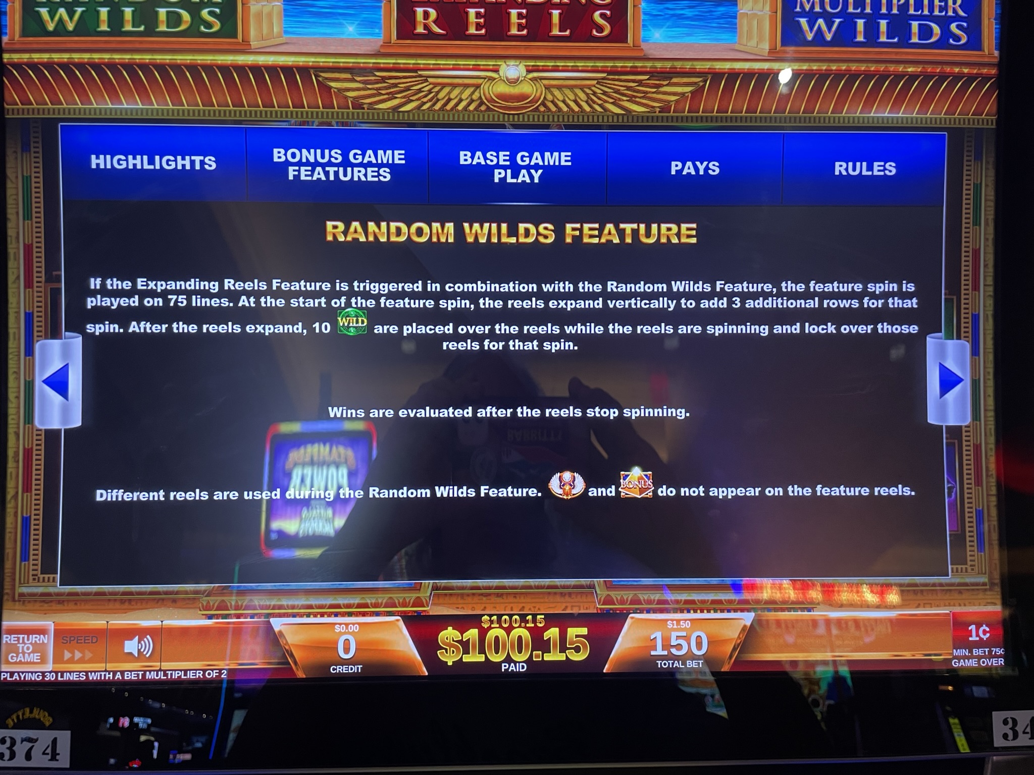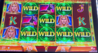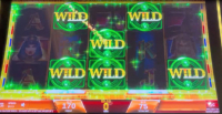 在下面的例子中,游戏奖励了我六个粘性百搭符号。转轴停止后,第七个百搭符号停在了第四转轴的下方。我的总奖金是10.45美元,相当于初始旋转投注金额的13.93倍。