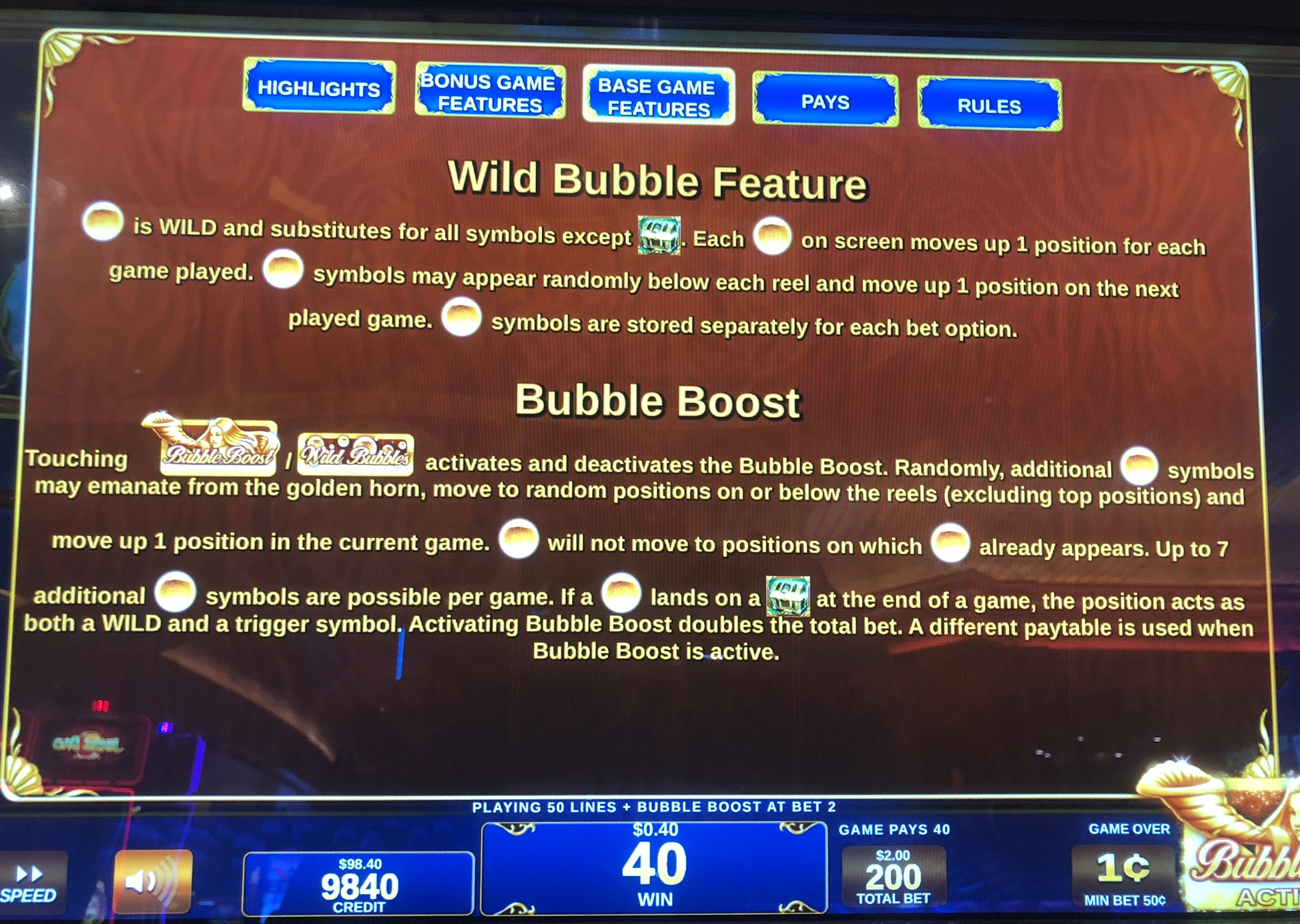 论坛上有些人不同意我关于在左上角或第四卷轴中间放置泡泡的观点。我认为这些反对意见来自那些通常玩“泡泡爆破”模式的玩家,在这种模式下,多一个泡泡意义不大。记住,与“泡泡爆破”模式相比,“狂野泡泡”模式的赔付线是“泡泡爆破”模式的两倍(相对于投注金额而言)。这意味着单个泡泡的价值大约是“泡泡爆破”模式的两倍。