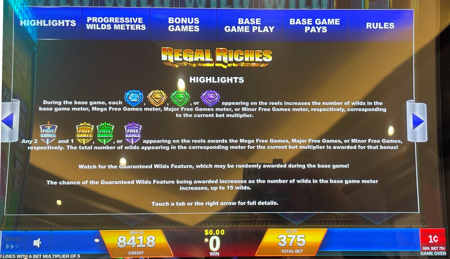 - Regal Riches:更复杂的 IGT 游戏,带有奖励计量器文章,请参阅“了解您的老虎机”。
