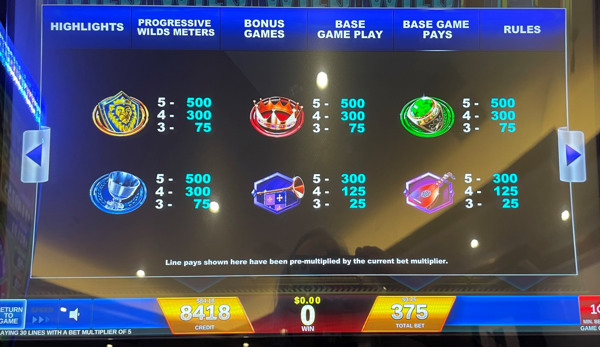 Regal Riches 和 Prosperity Pearl 老虎机除了名称和符号外,其他功能完全相同。它们由 Unity(IGT 的一个部门或子公司)制造。换句话说,它们就像彼此的外壳。这些游戏的特别之处在于,玩家获得百搭符号后,不仅可以在当轮中使用,还可以将其存入下次旋转或奖励中。如果存入的百搭符号足够多,那么胜率就会对玩家有利。精明的玩家会抓住这种有利时机,一直玩到用完所有存入的百搭符号为止。