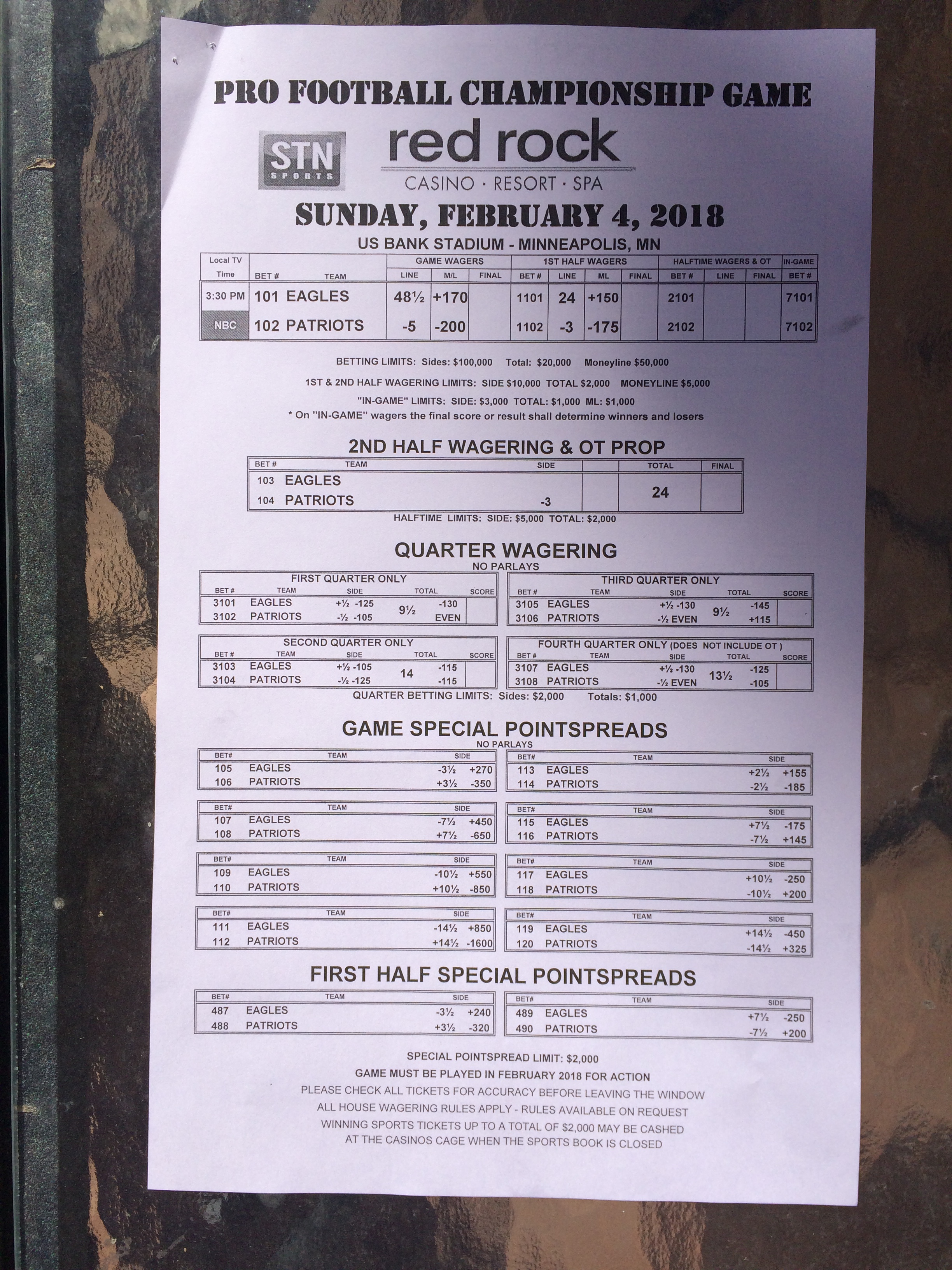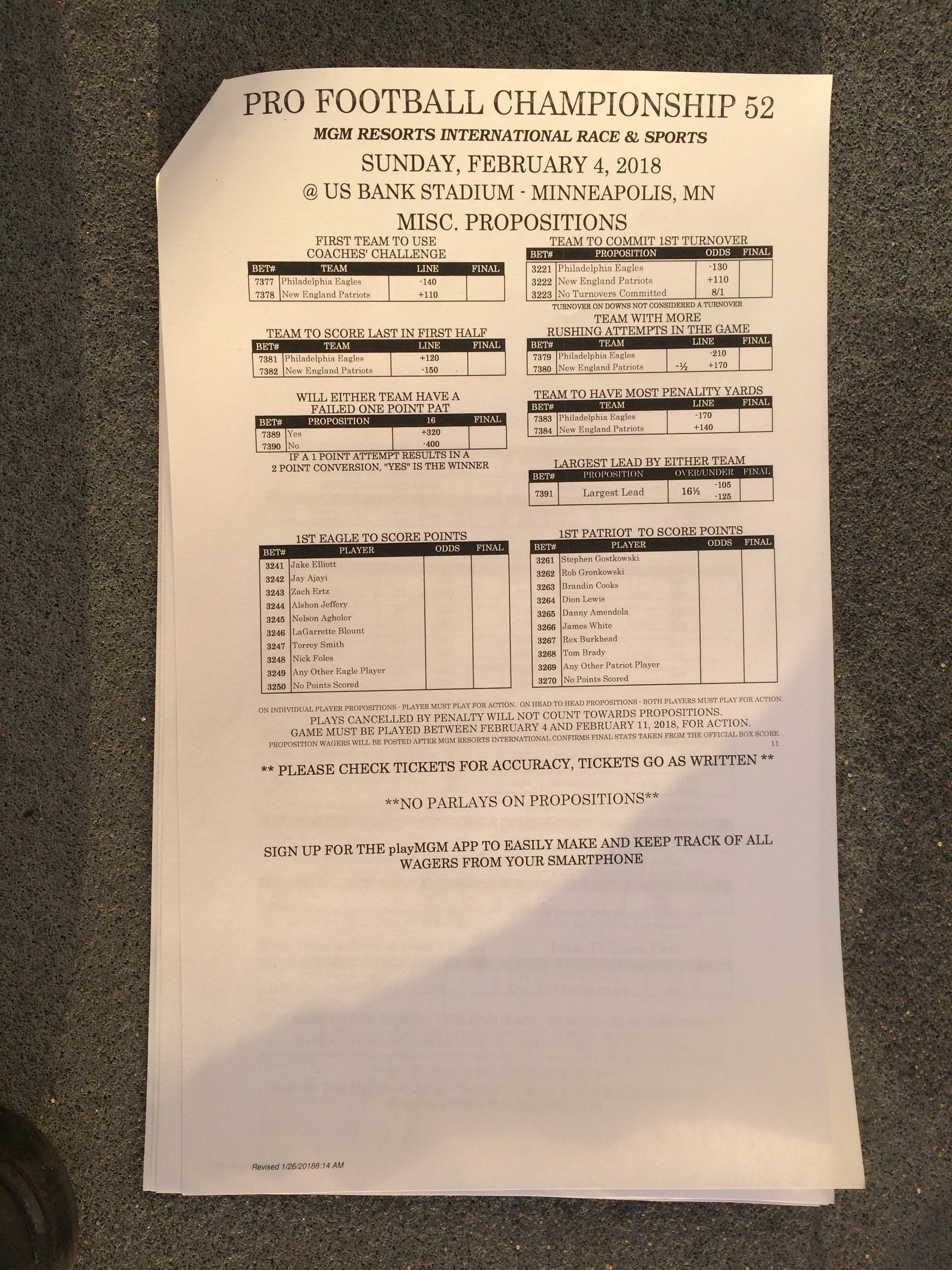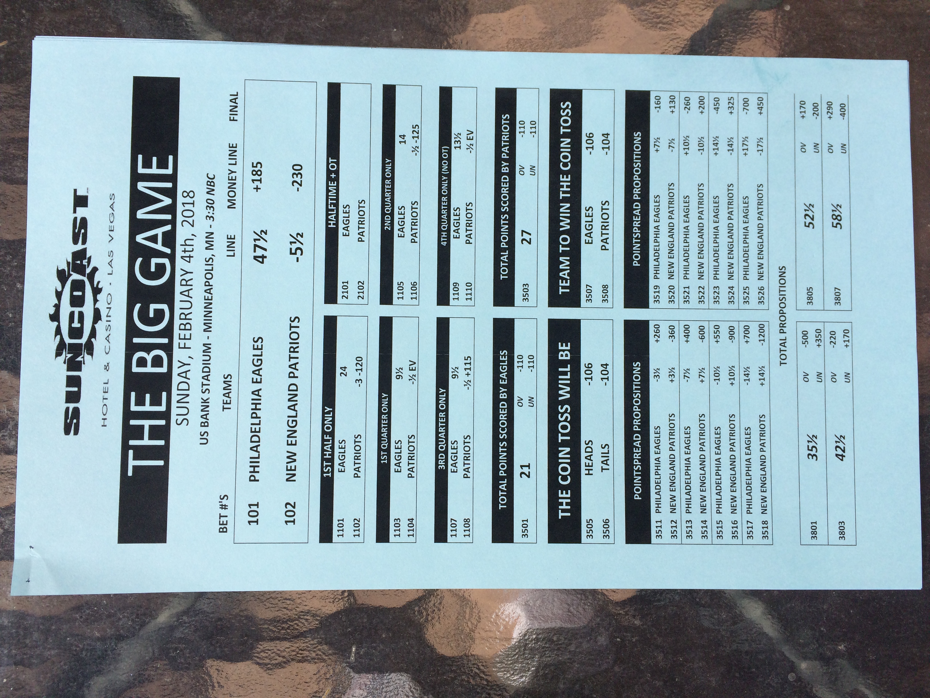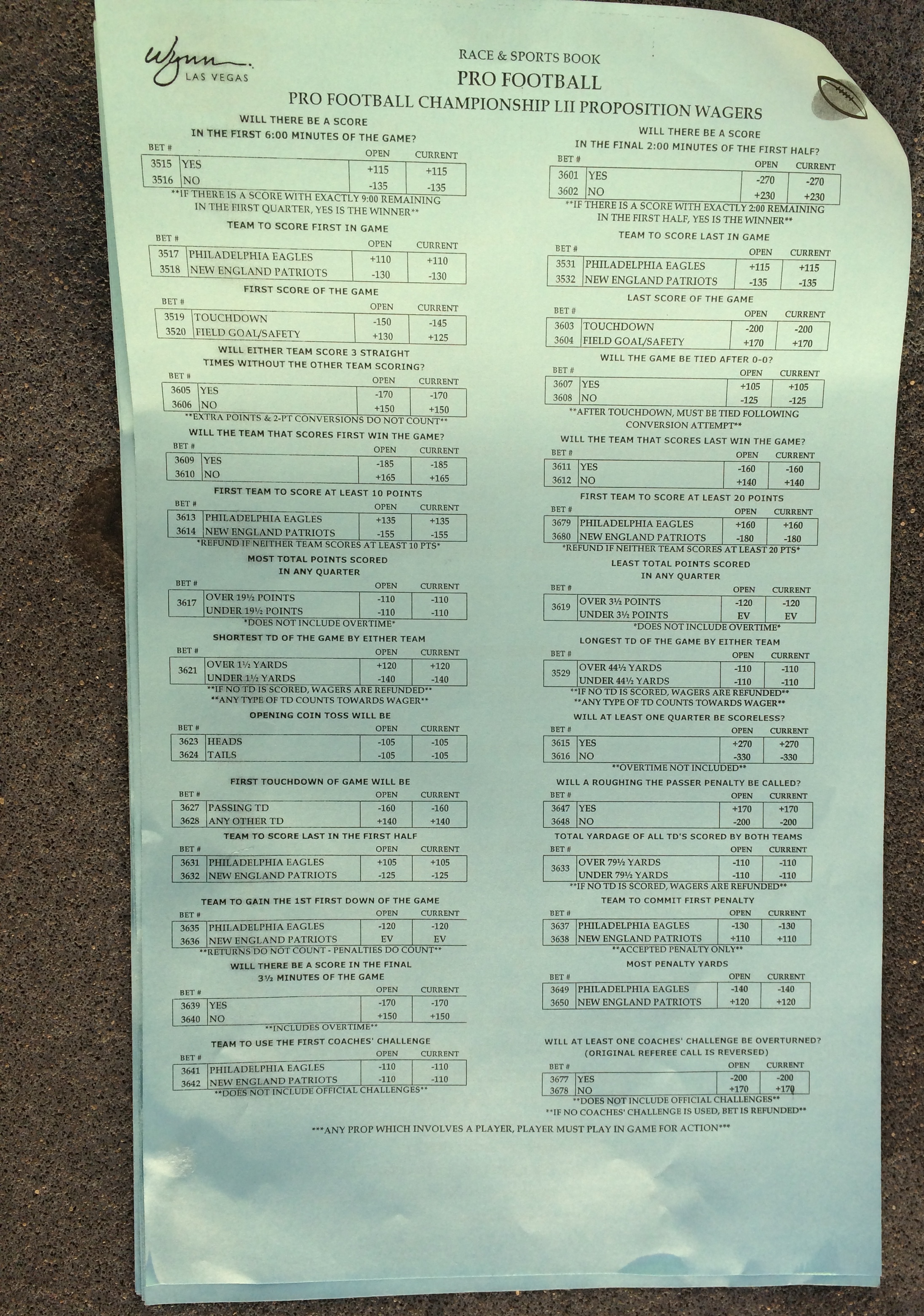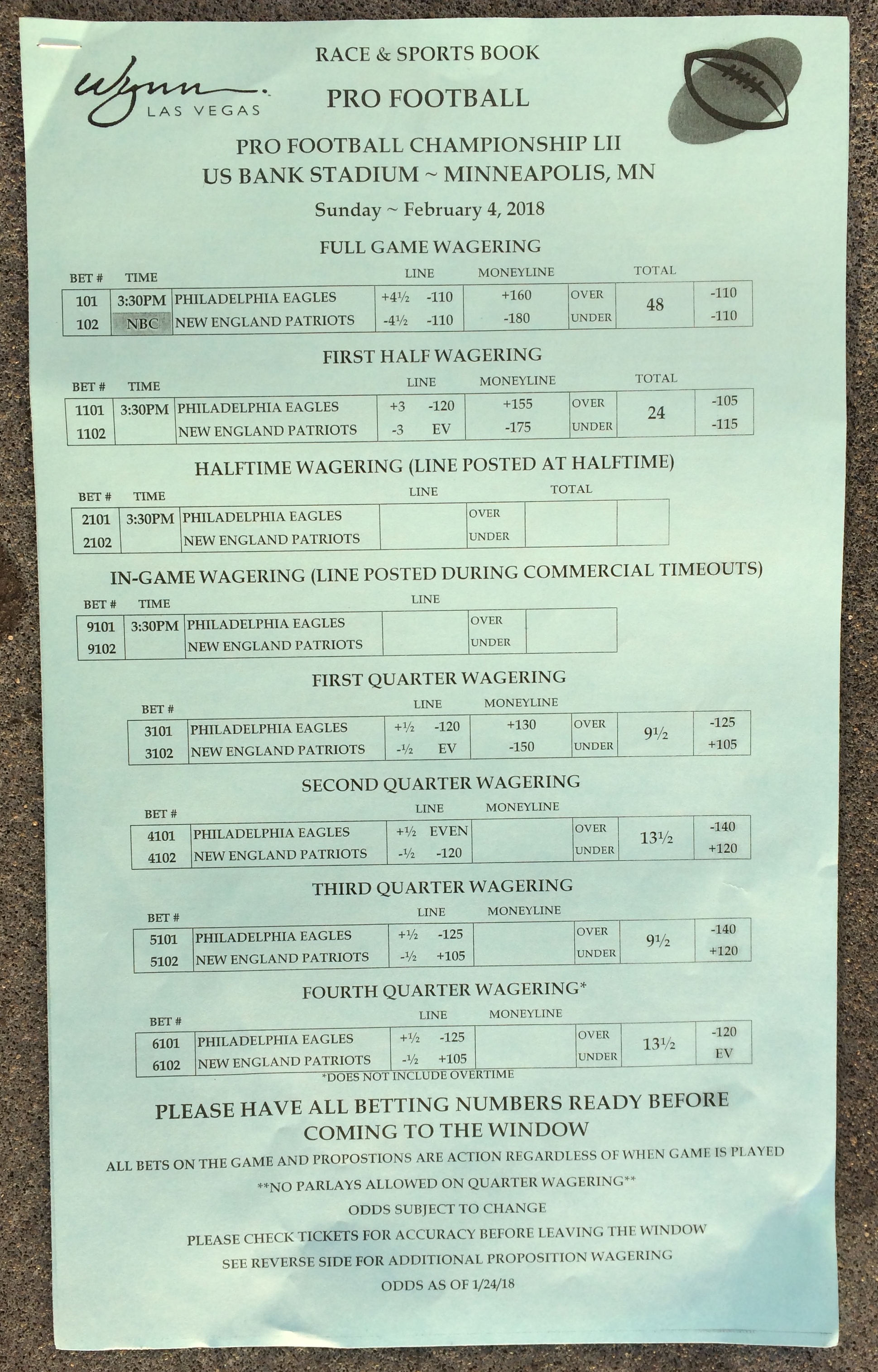 以下是拉斯维加斯几家体育博彩公司每页投注单的图片。这些表格收集于2018年1月27日,即比赛开始前八天。