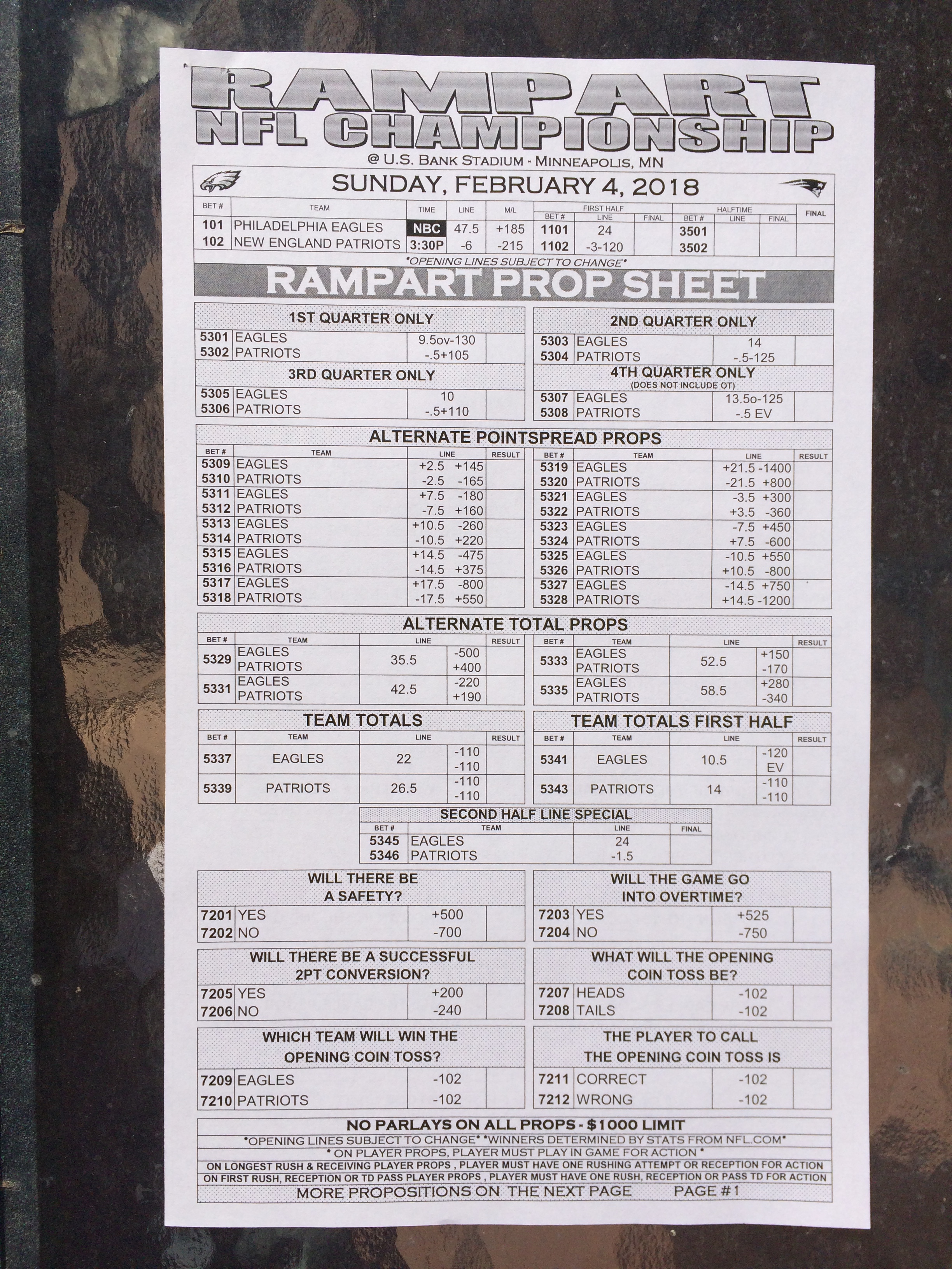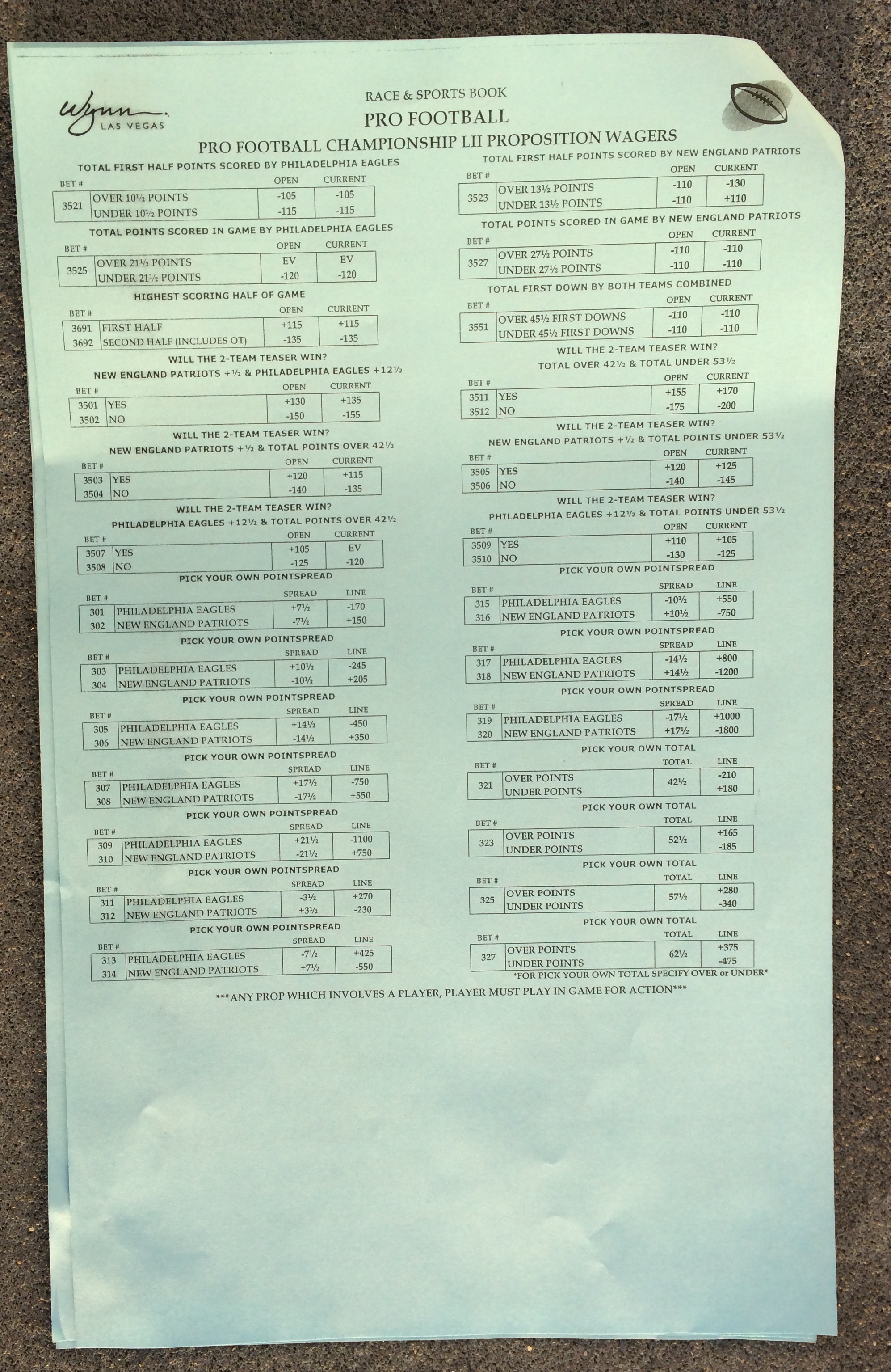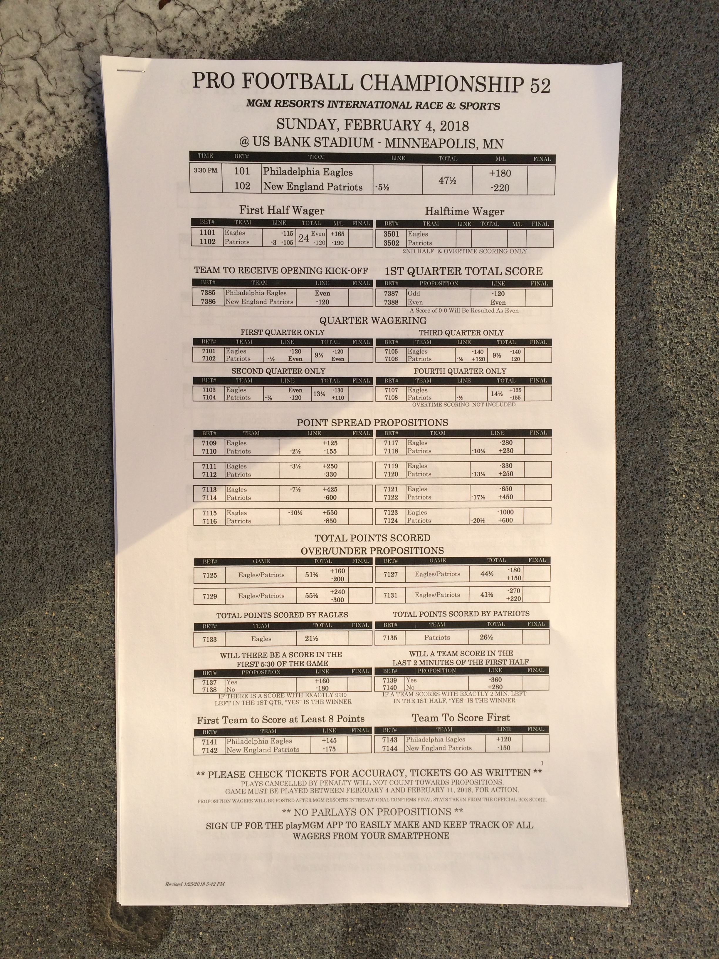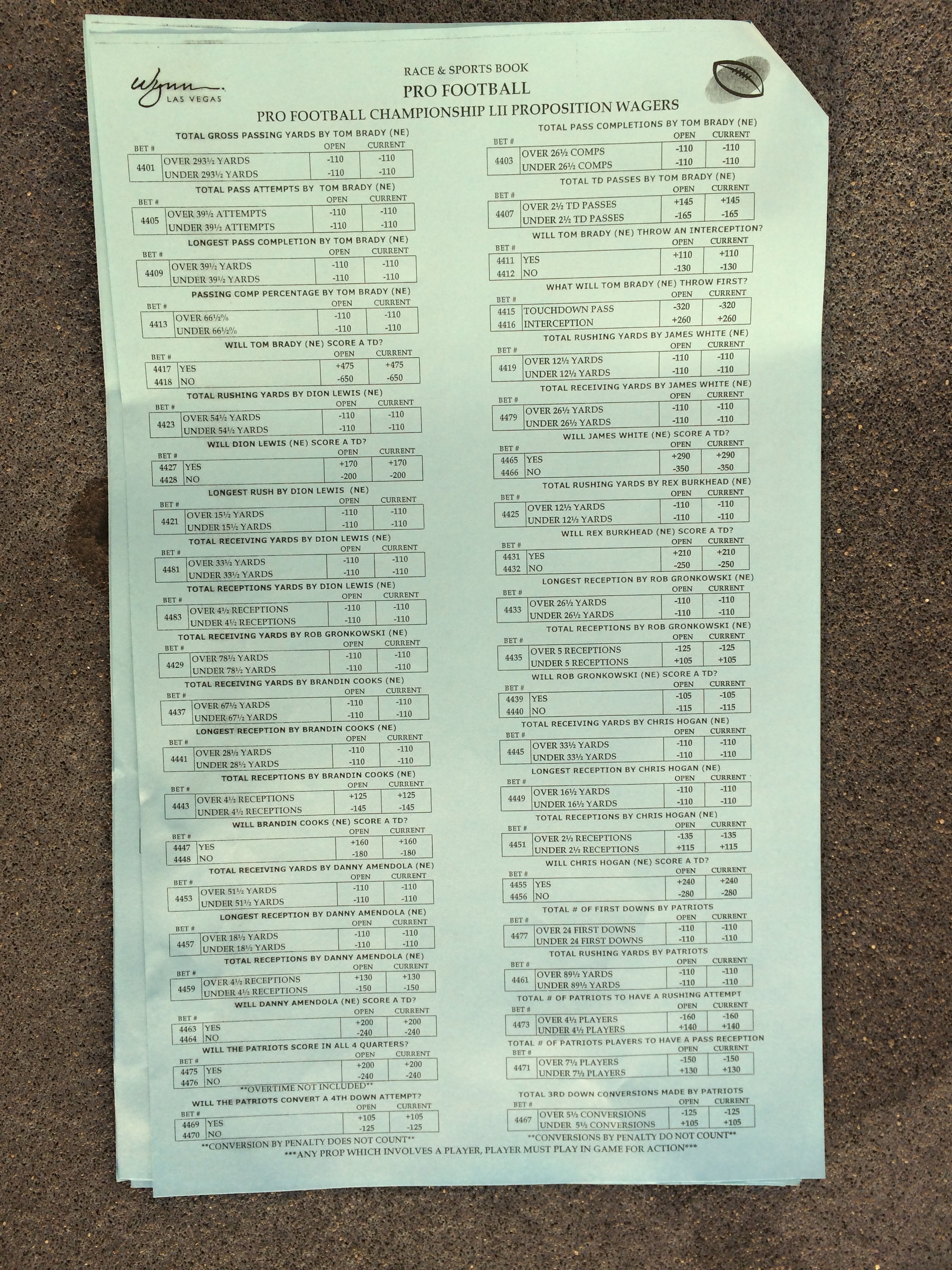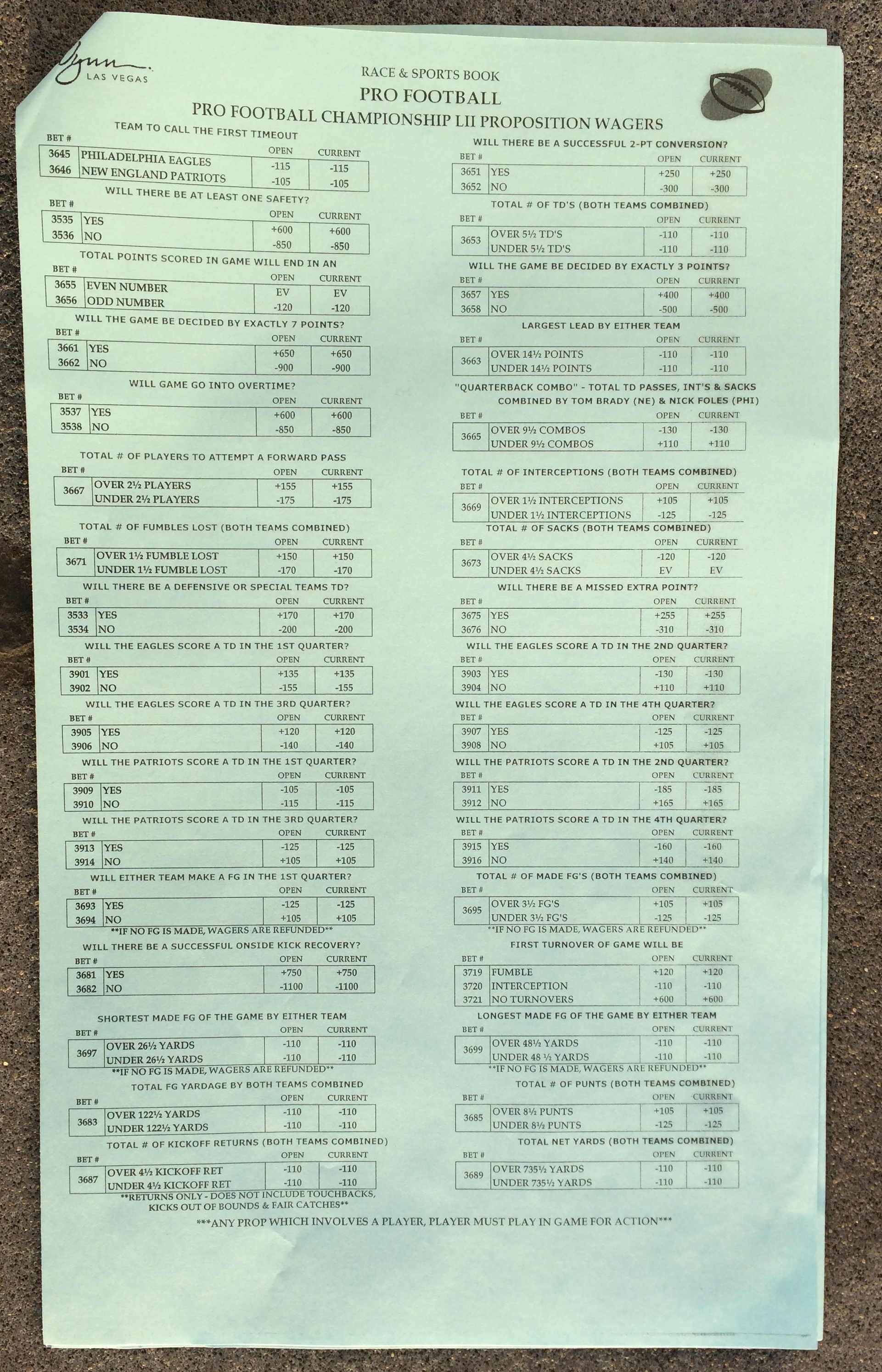 以下是拉斯维加斯几家体育博彩公司每页投注单的图片。这些表格收集于2018年1月27日,即比赛开始前八天。