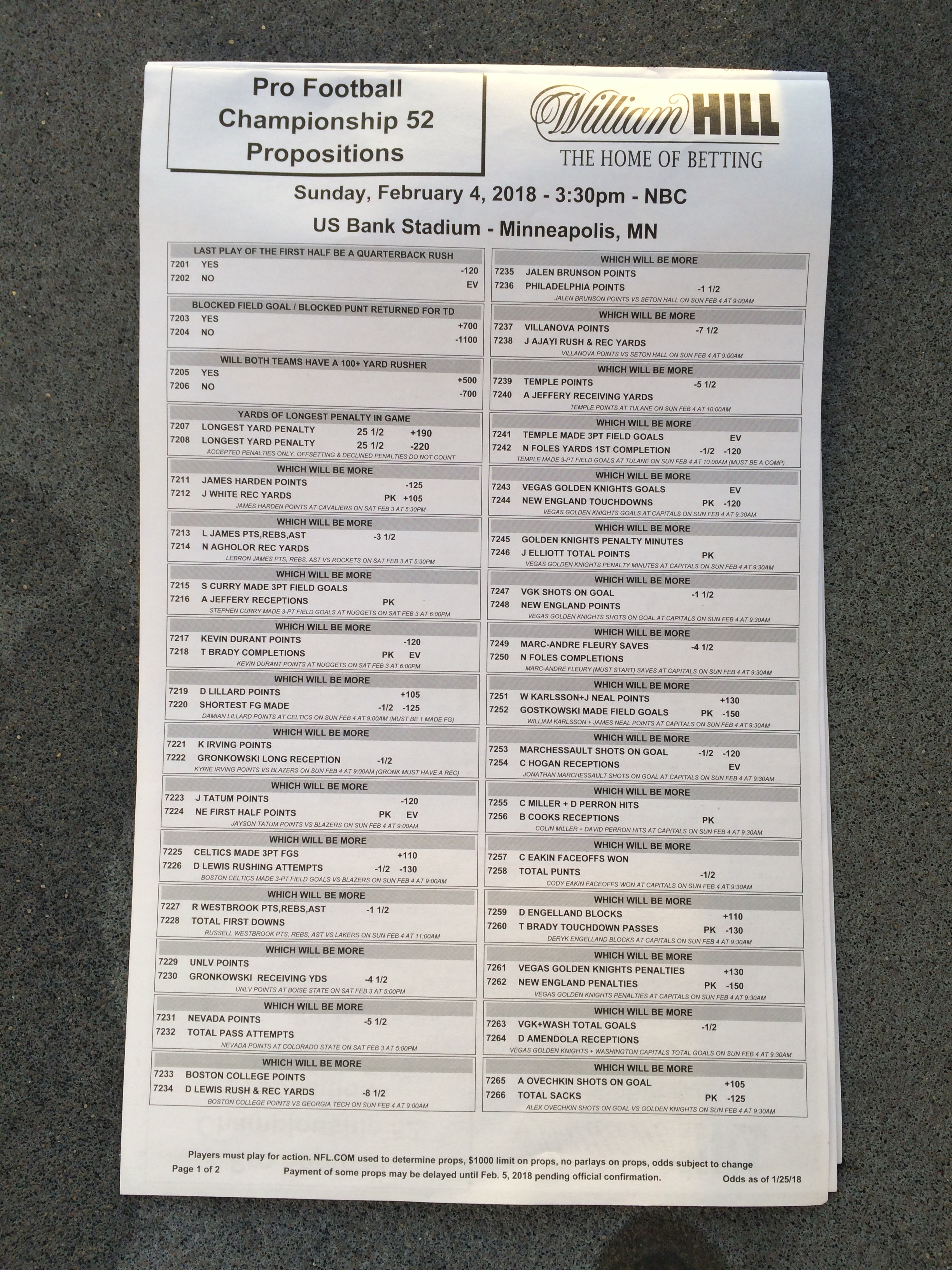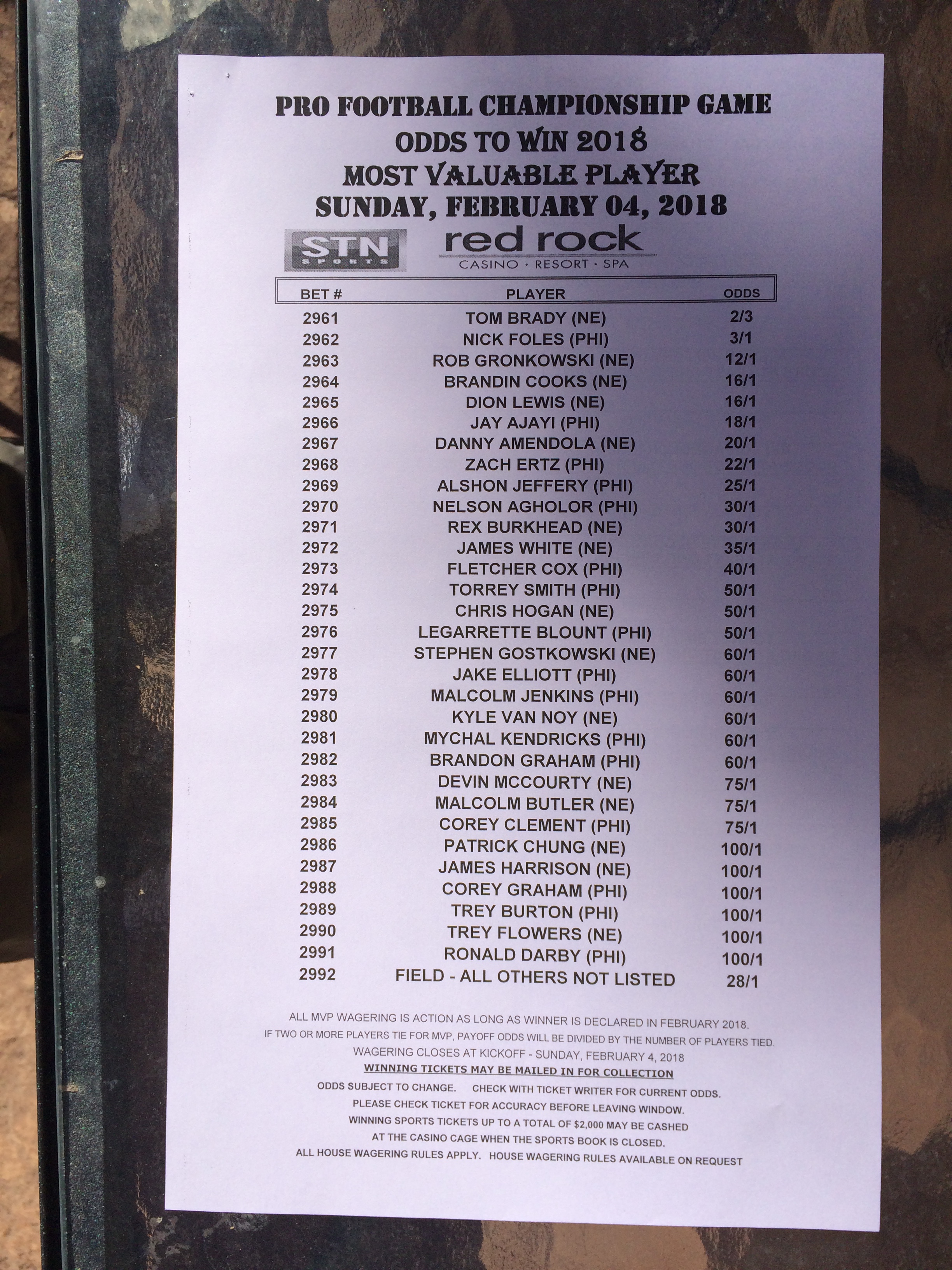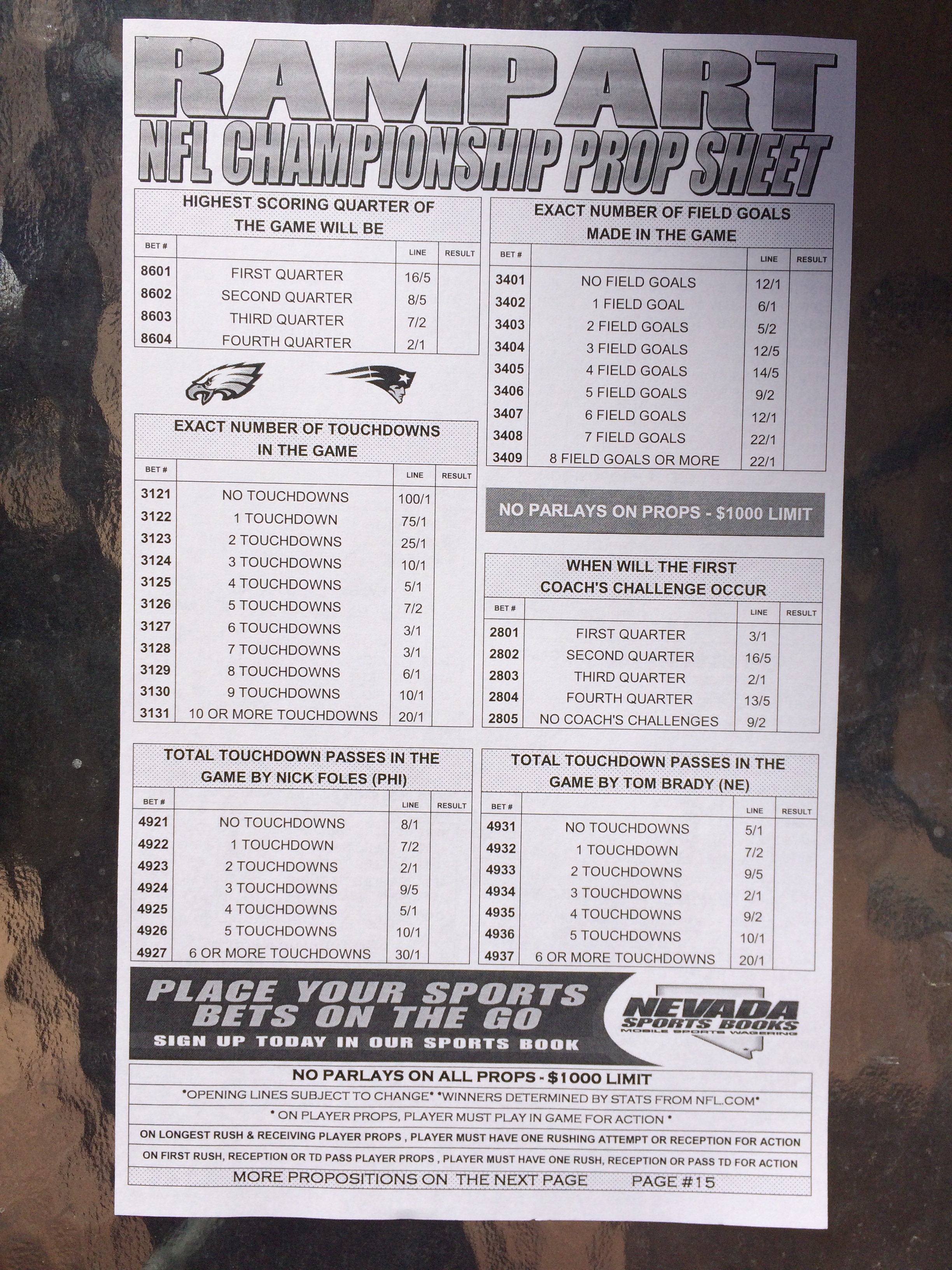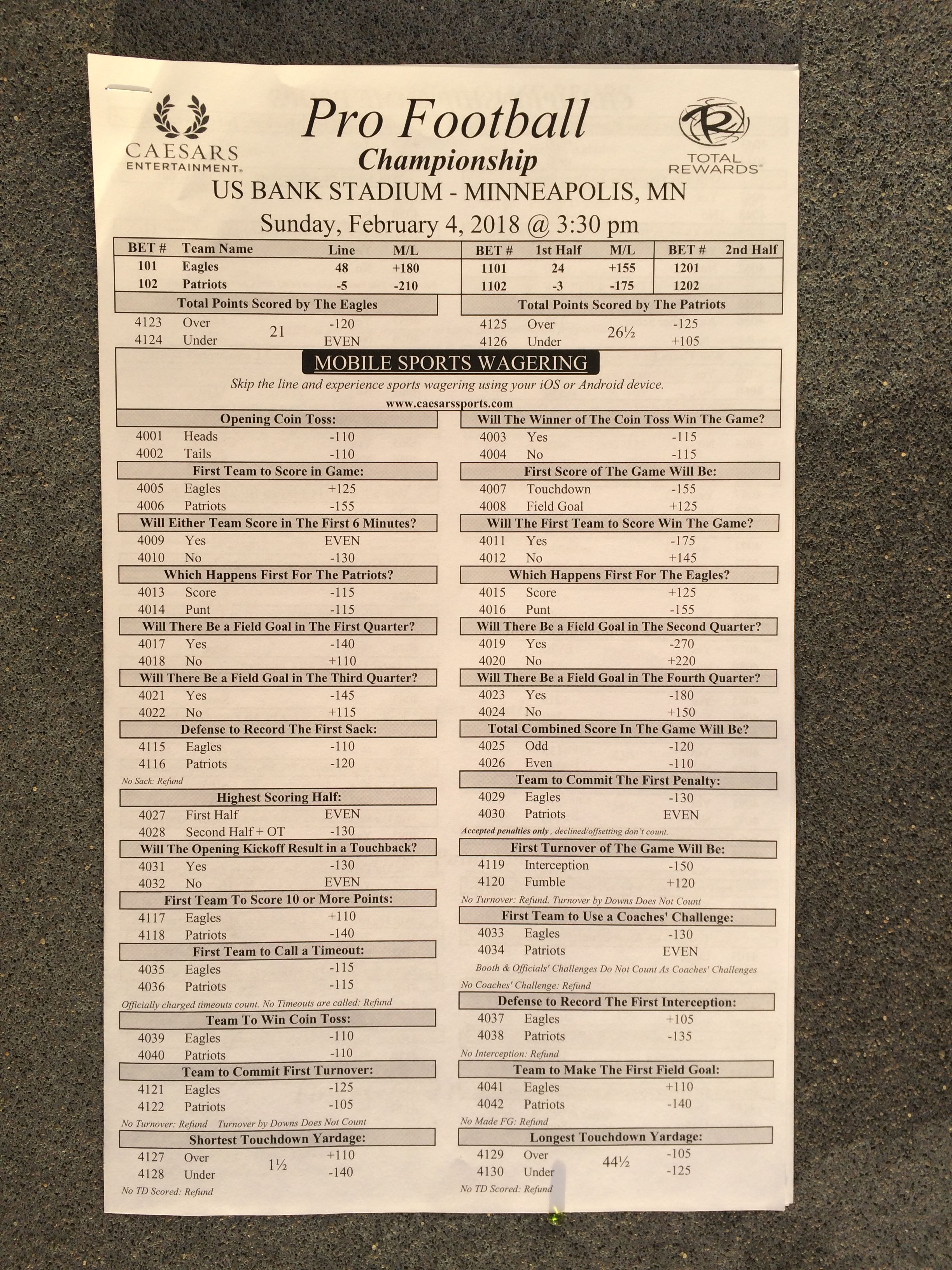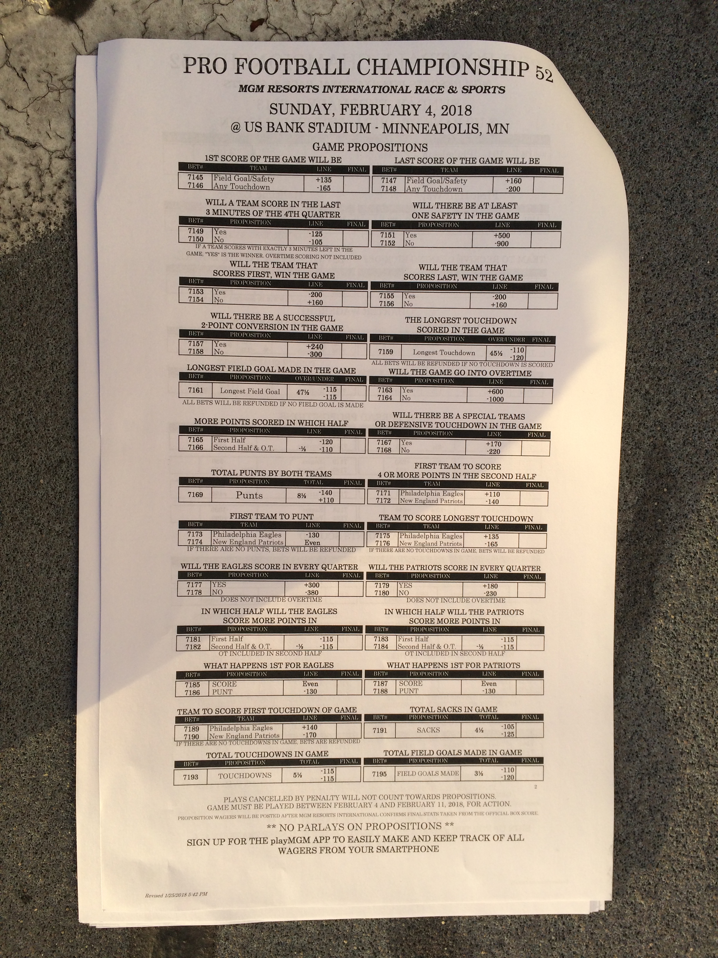 以下是拉斯维加斯几家体育博彩公司每页投注单的图片。这些表格收集于2018年1月27日,即比赛开始前八天。