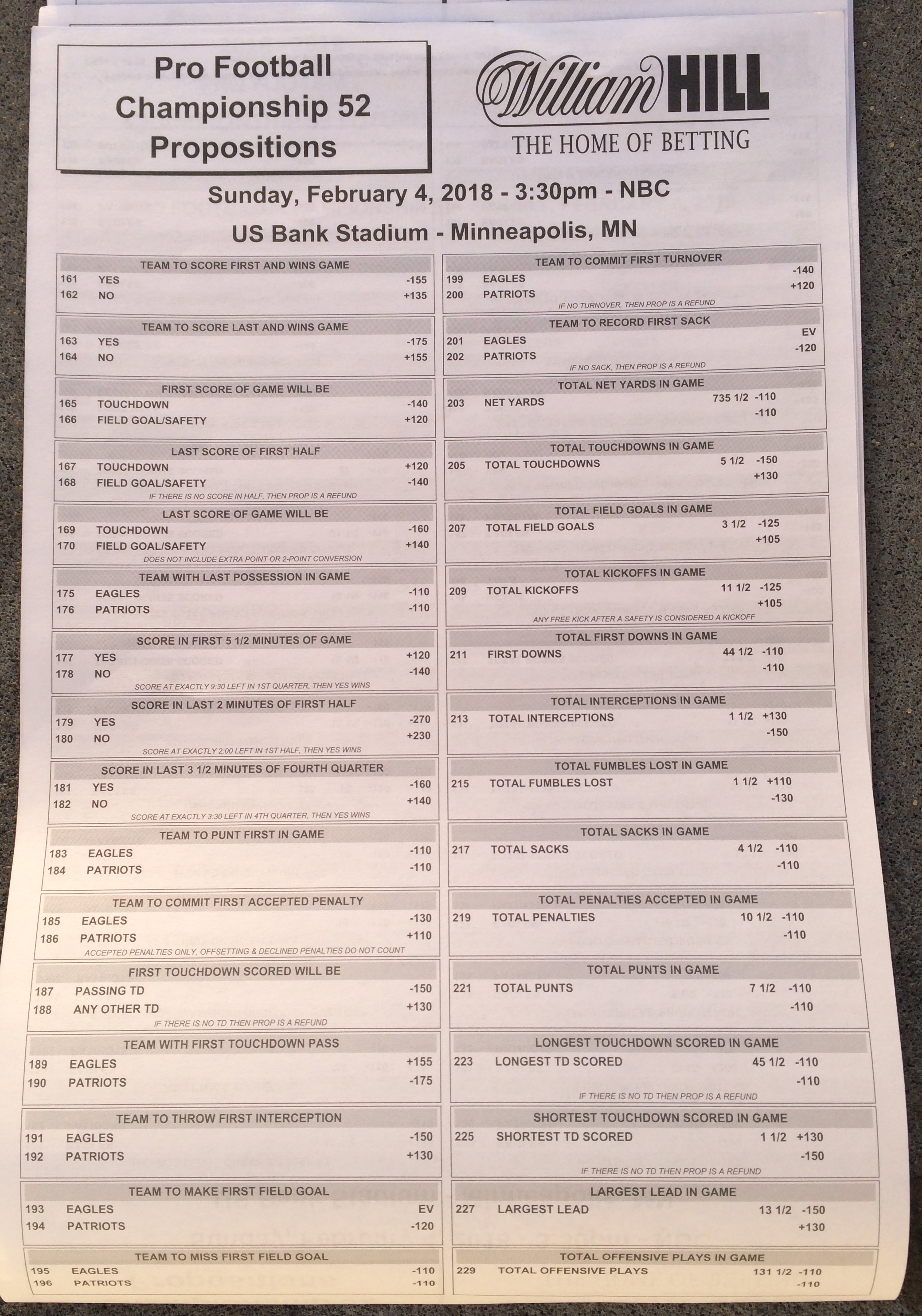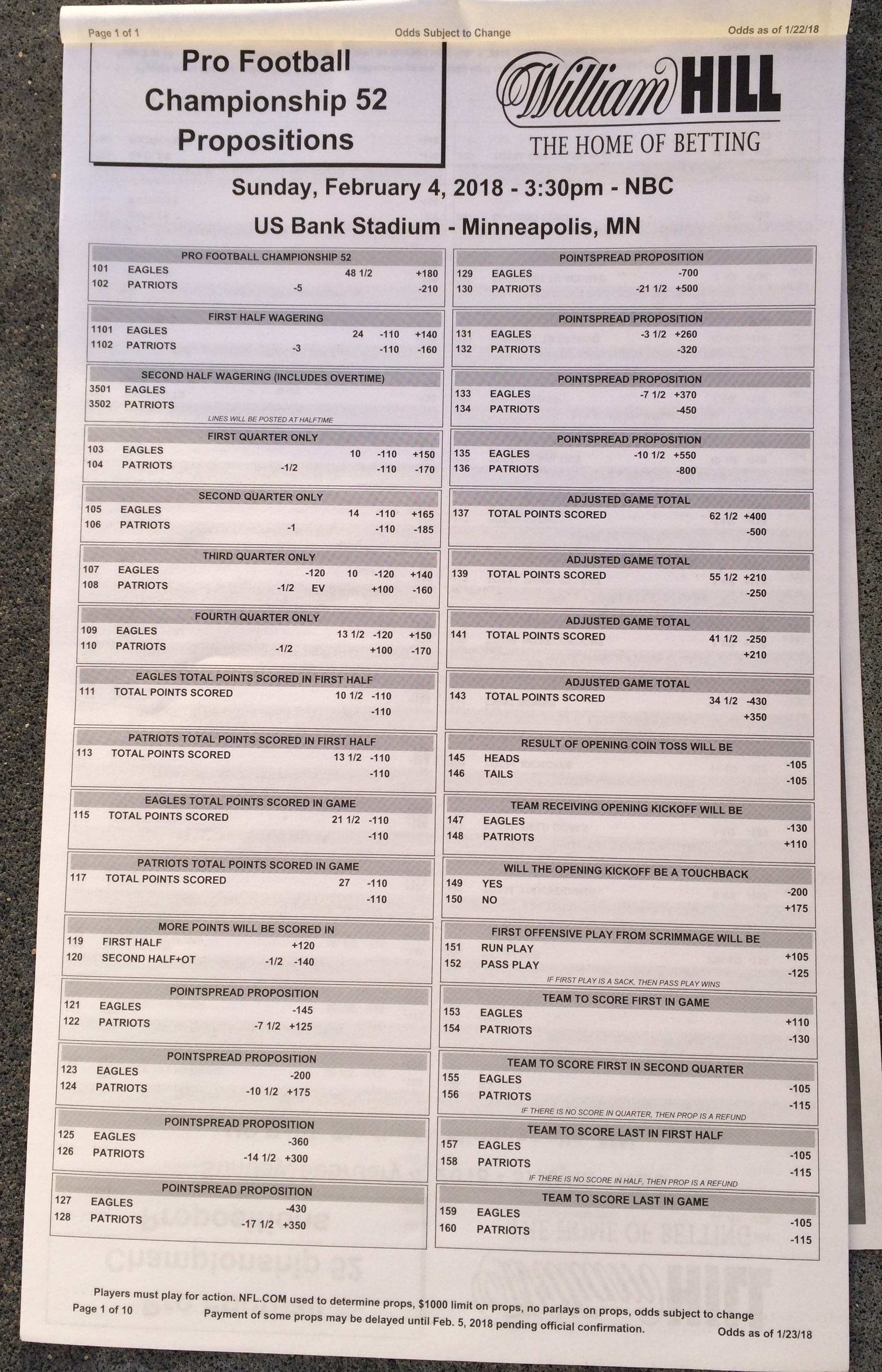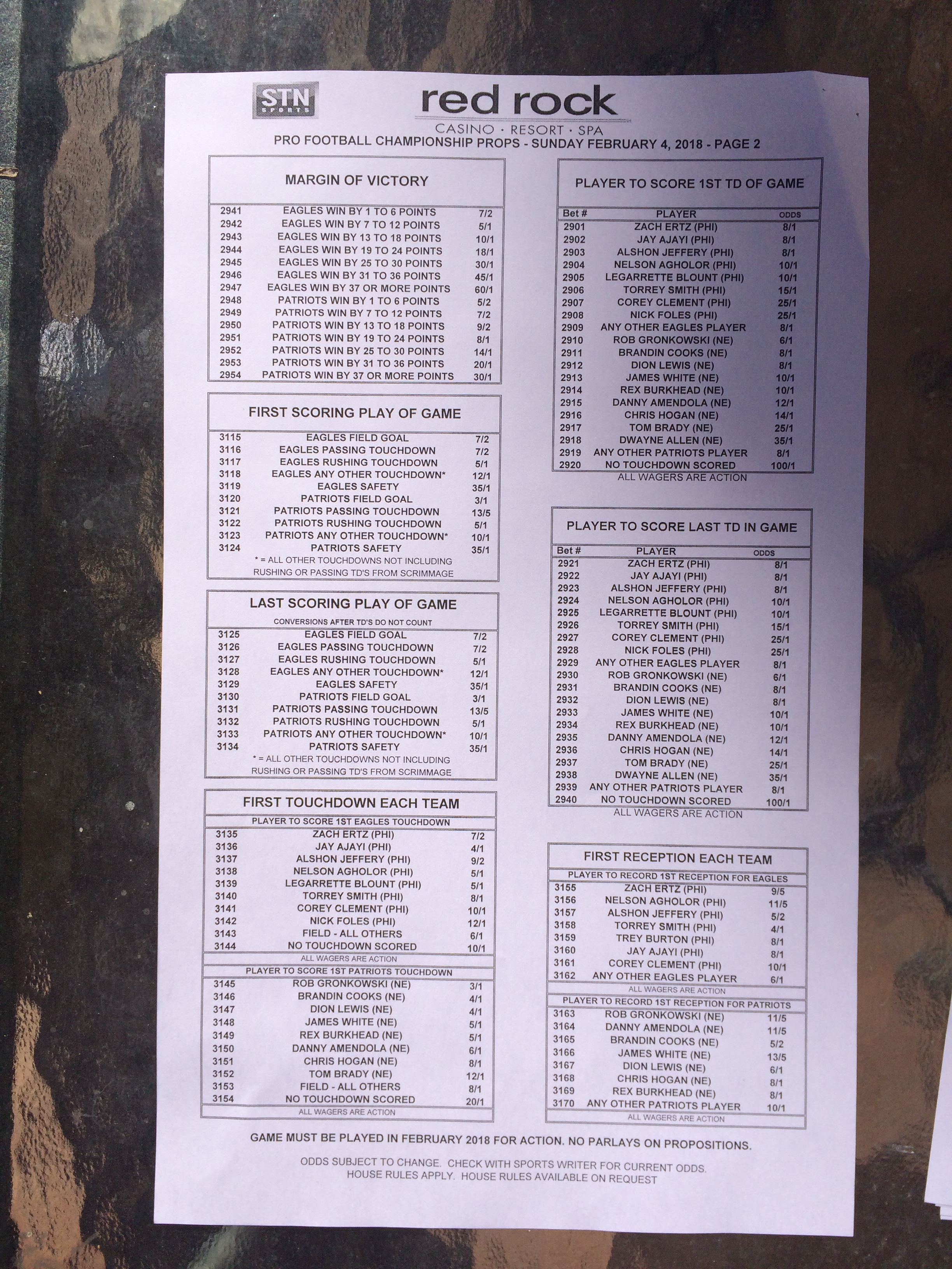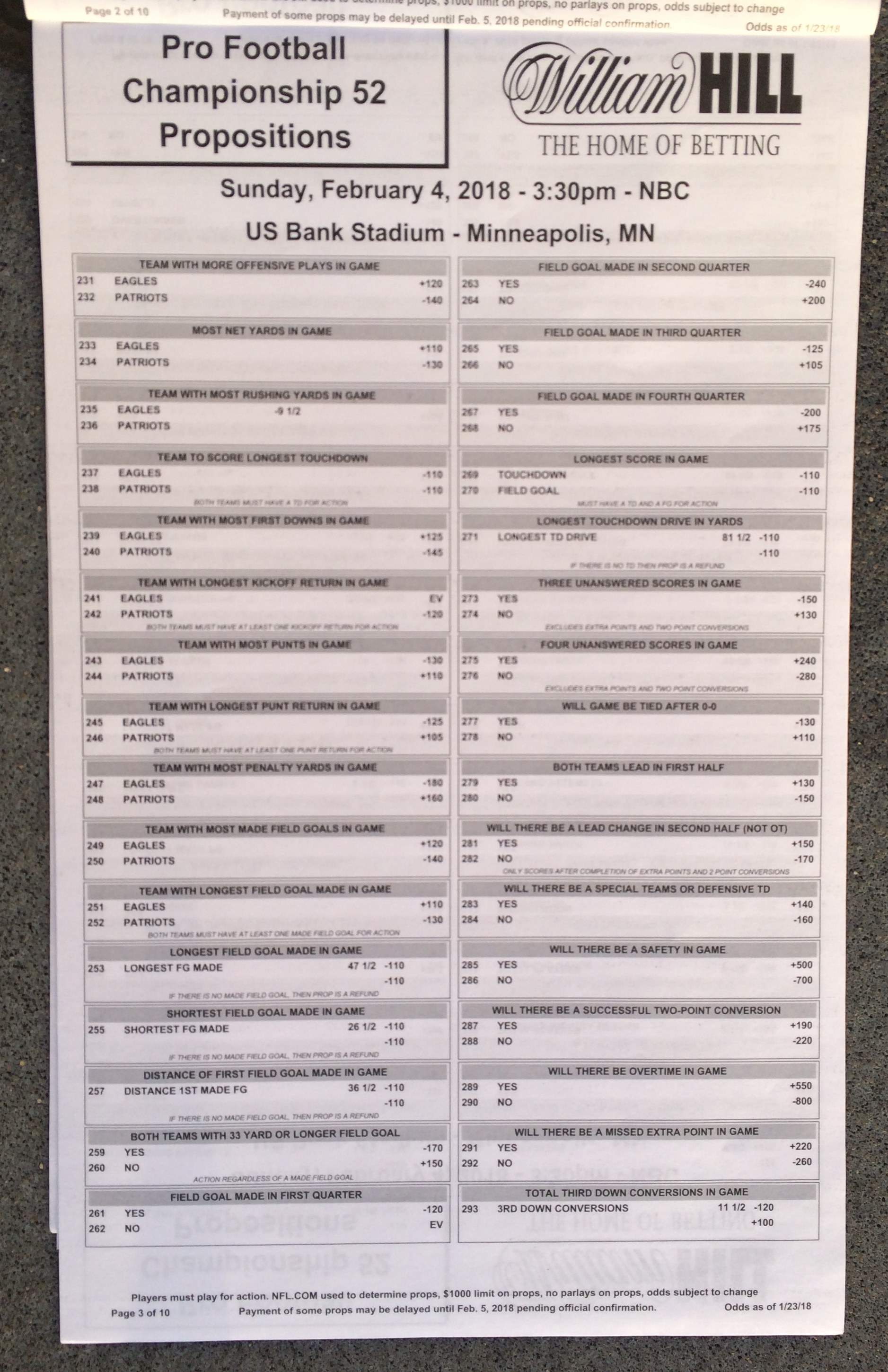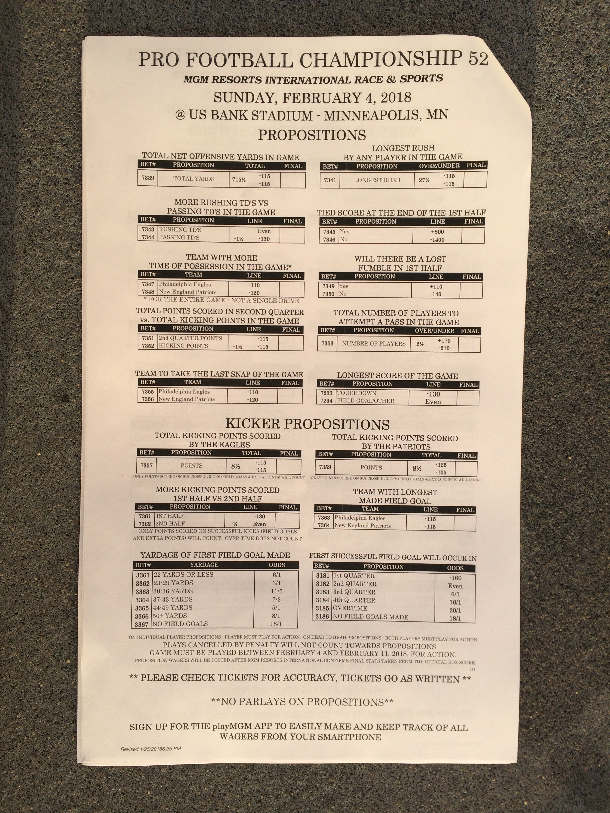 以下是拉斯维加斯几家体育博彩公司每页投注单的图片。这些表格收集于2018年1月27日,即比赛开始前八天。