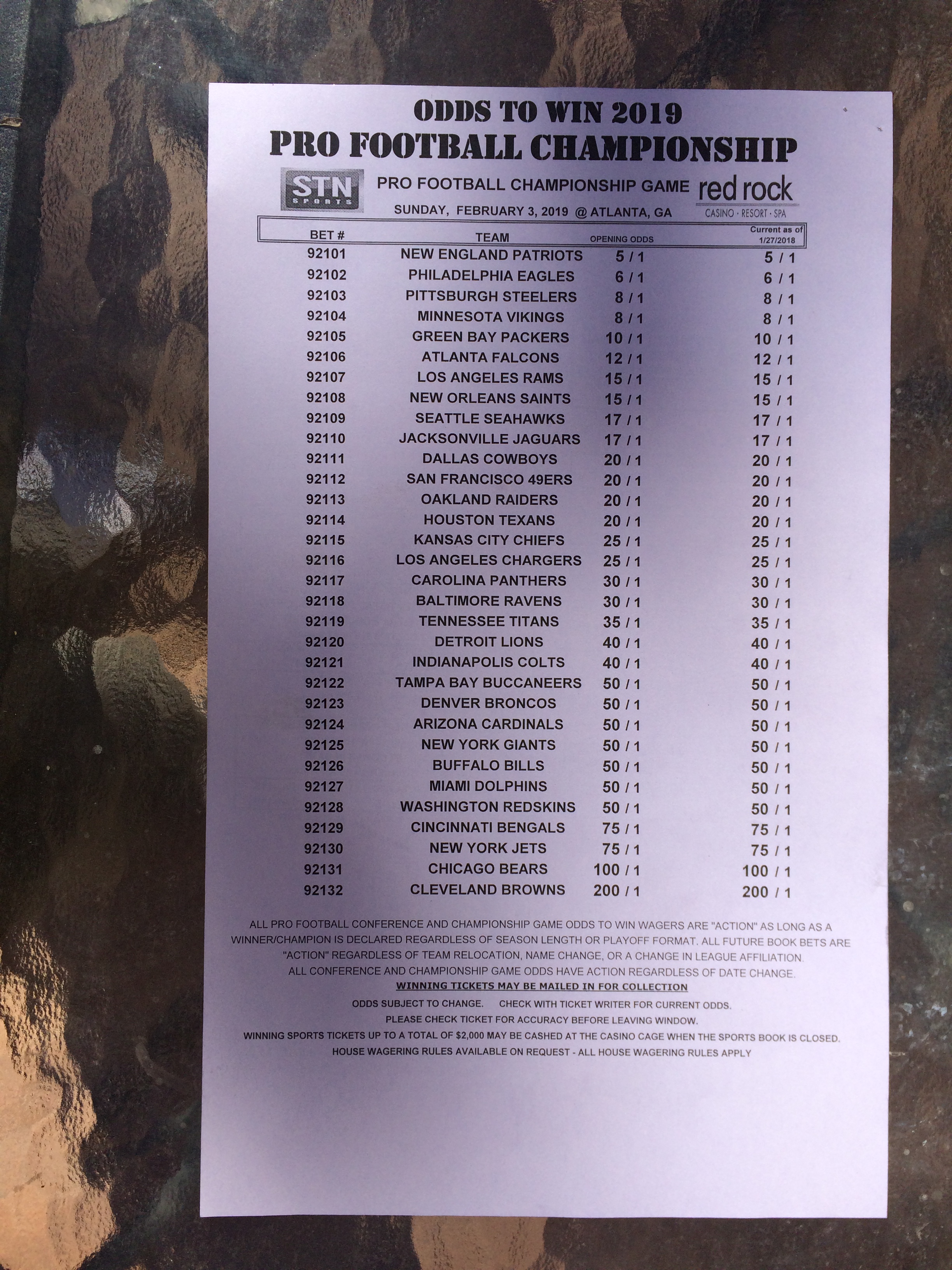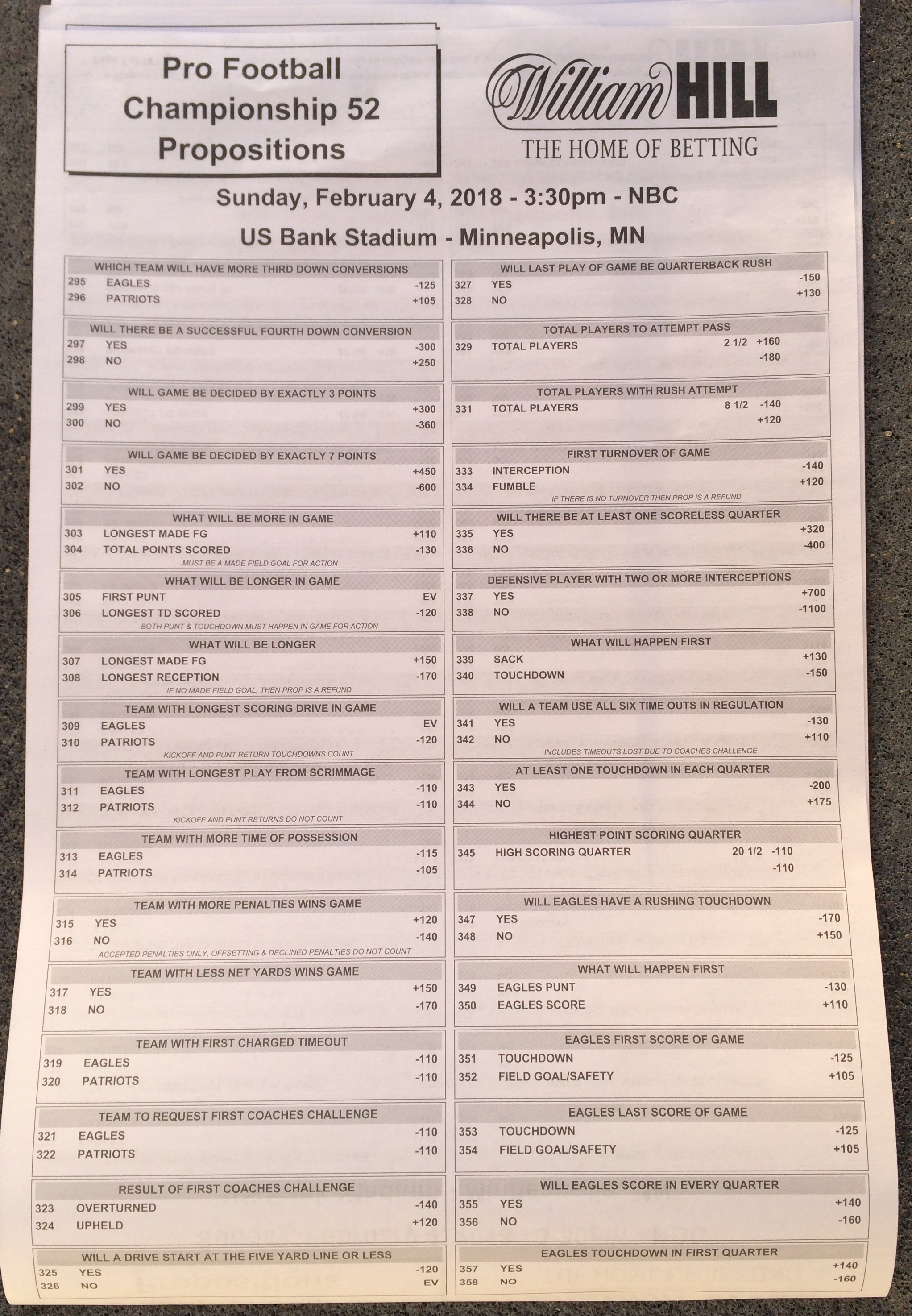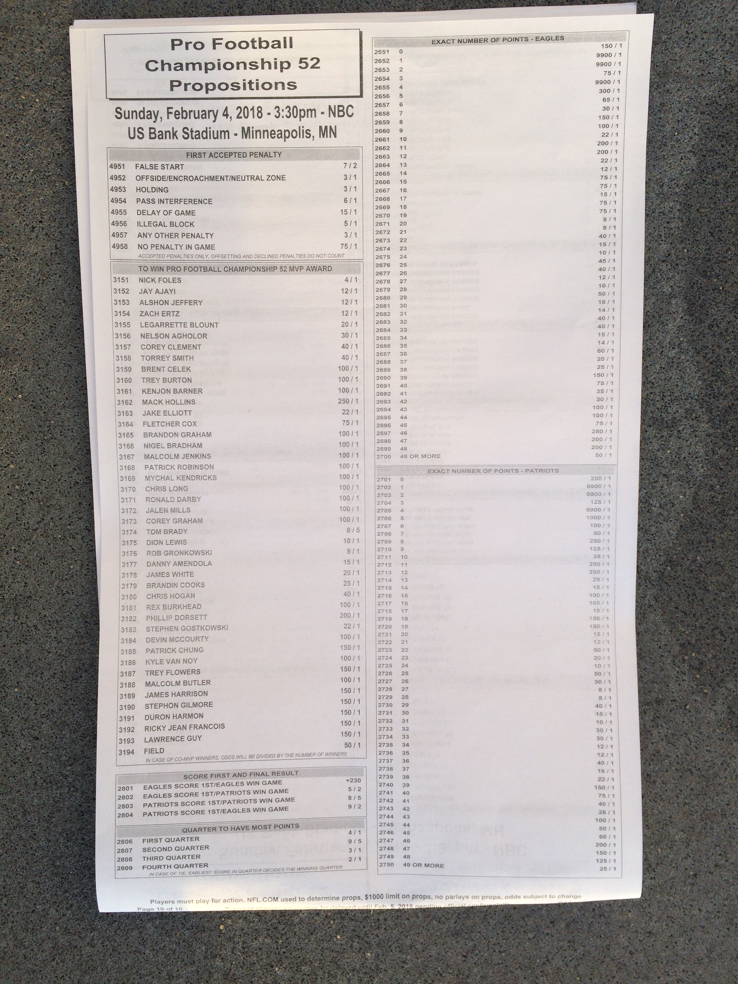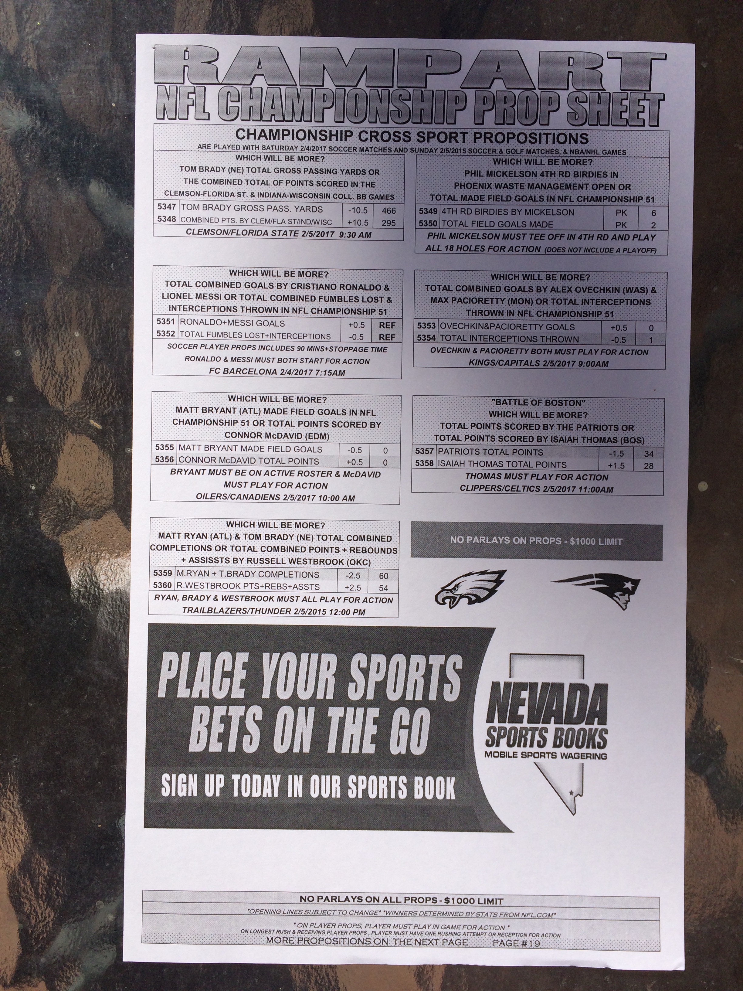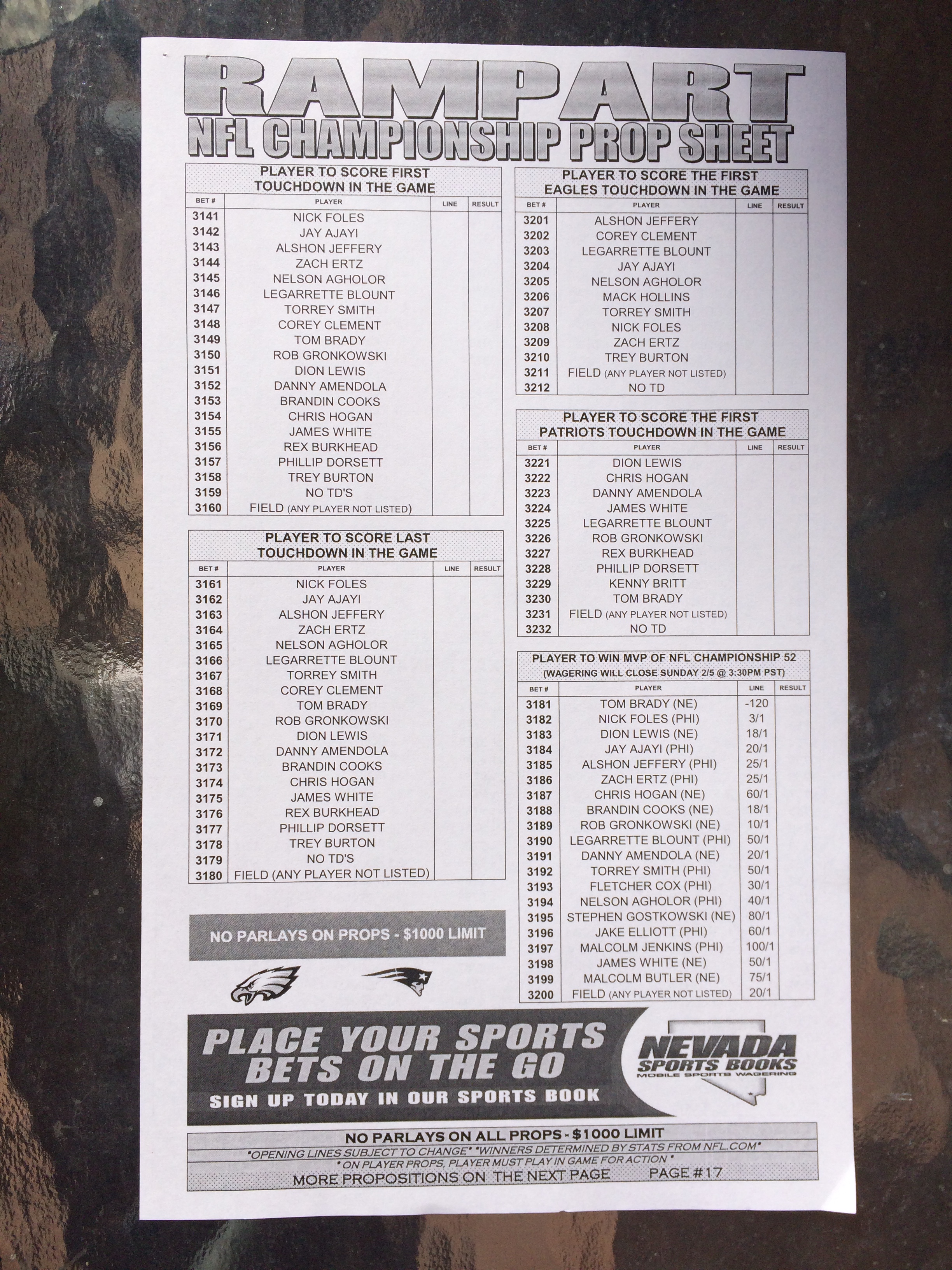 以下是拉斯维加斯几家体育博彩公司每页投注单的图片。这些表格收集于2018年1月27日,即比赛开始前八天。