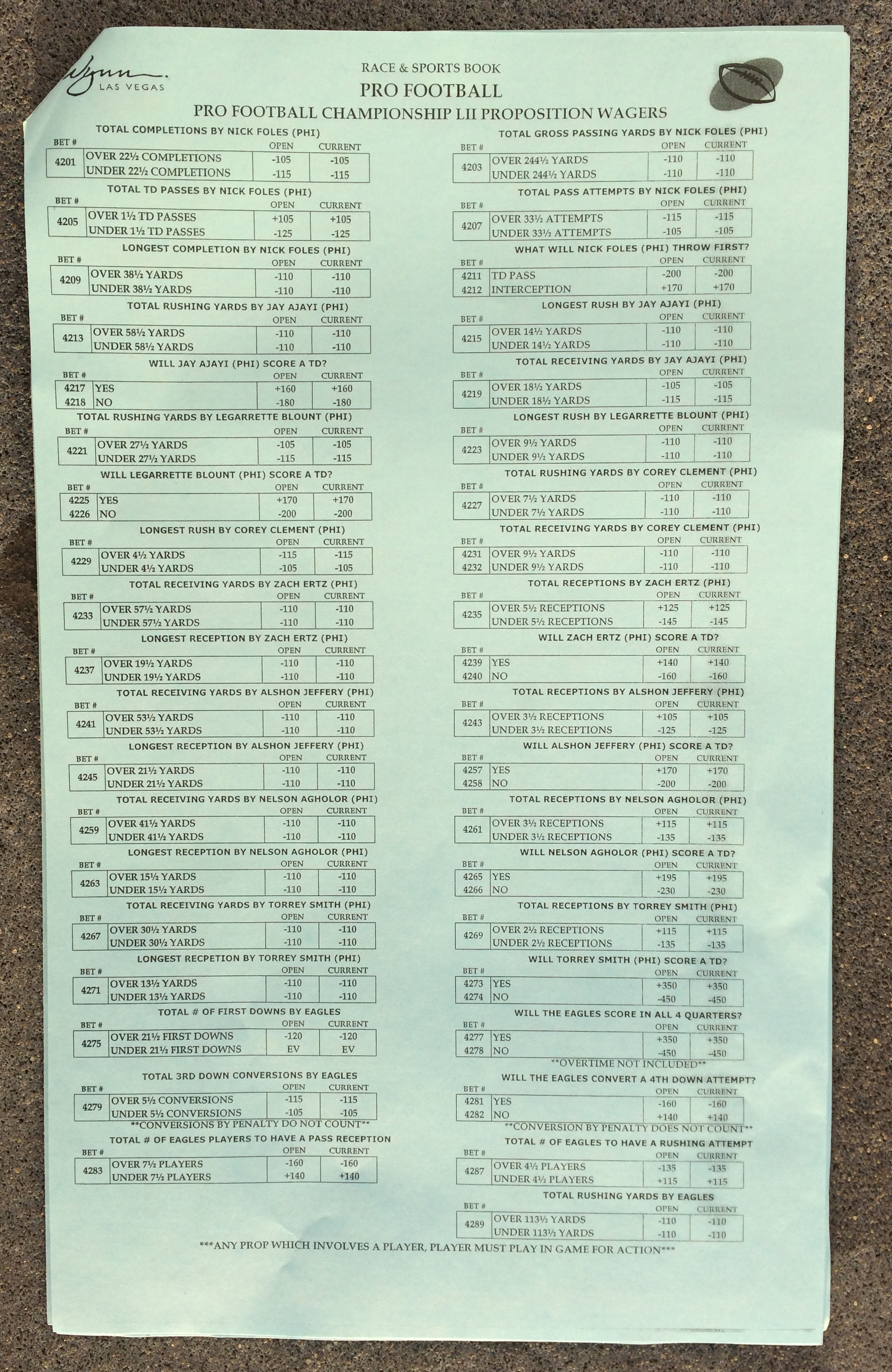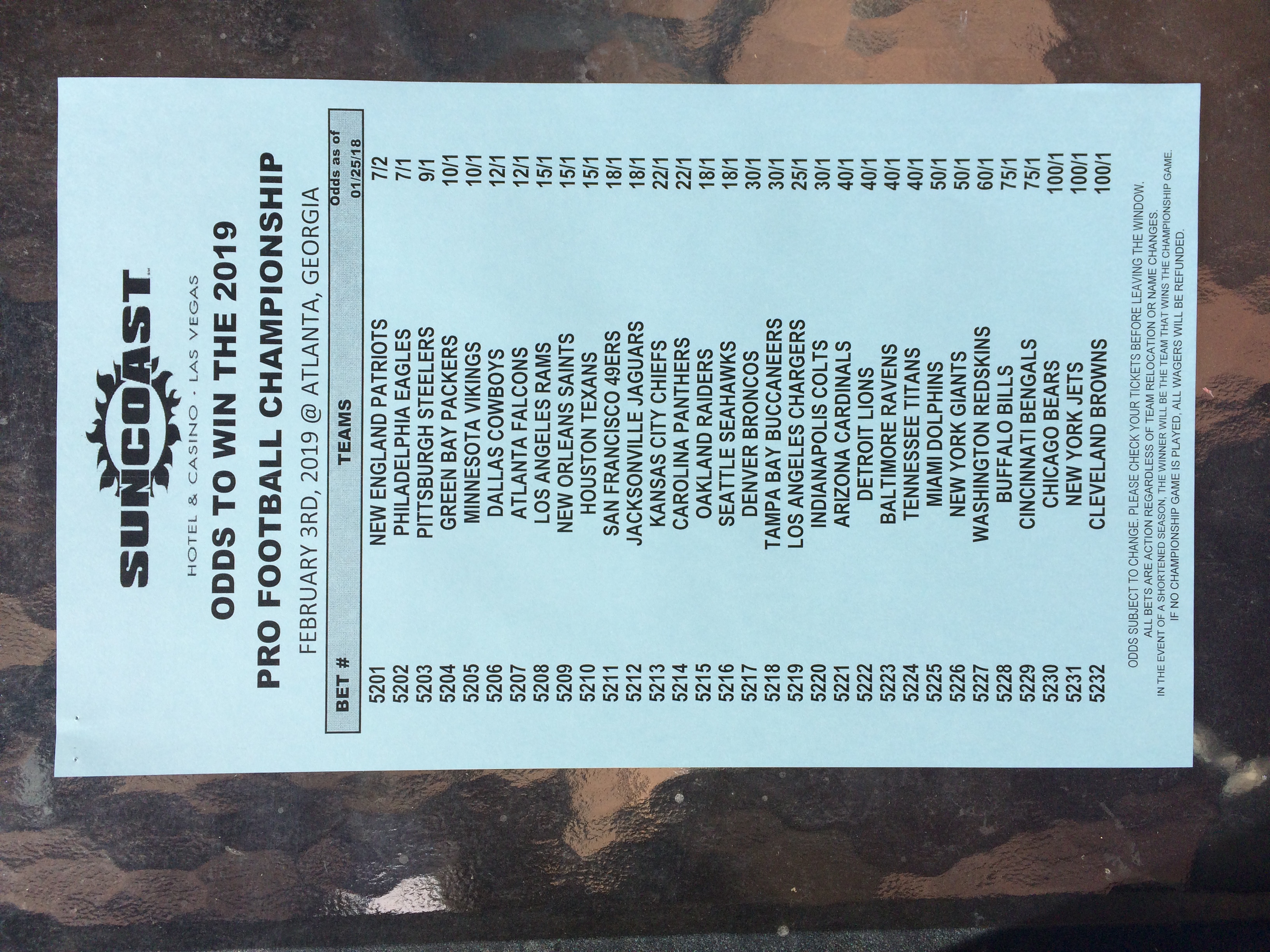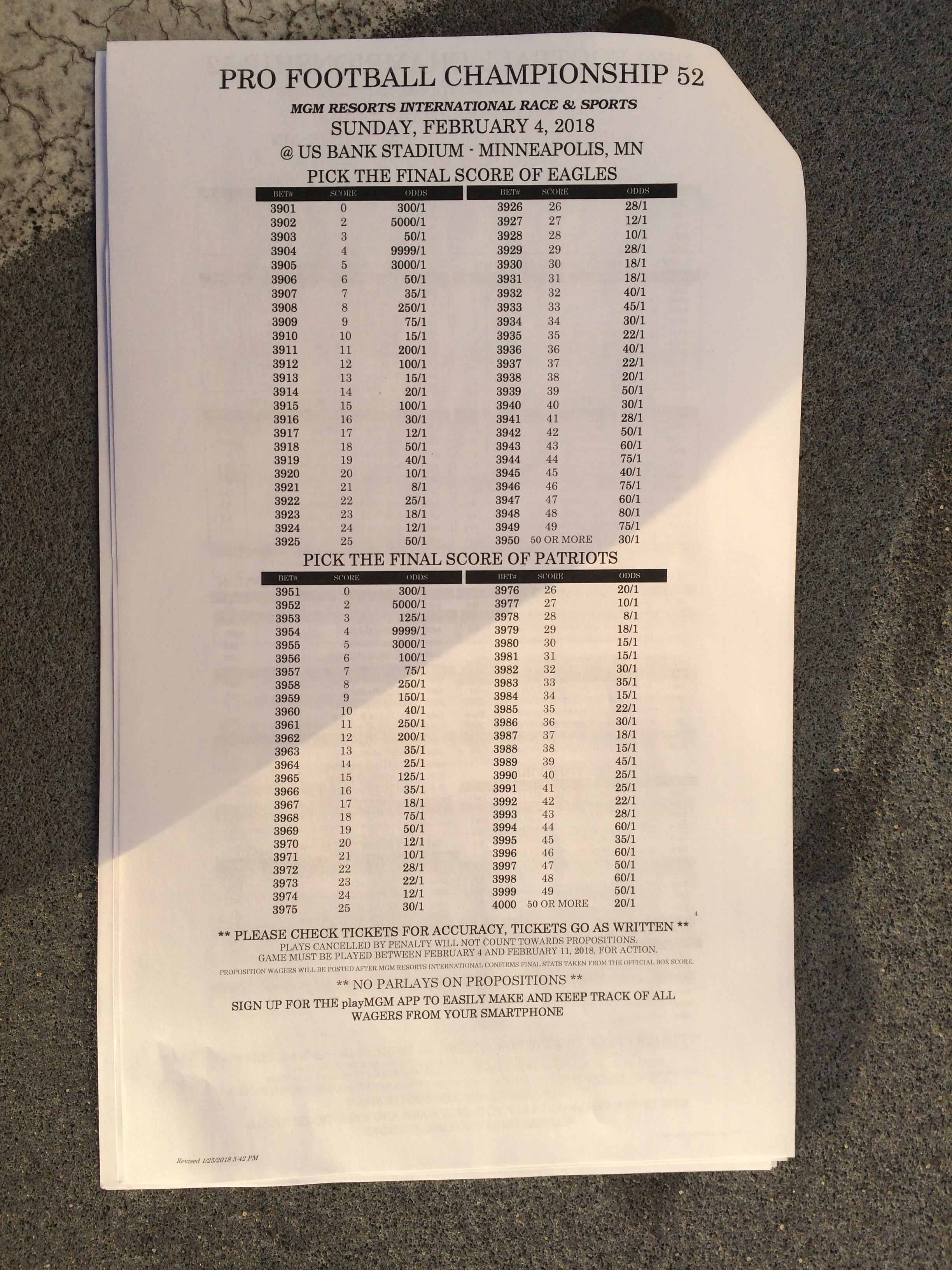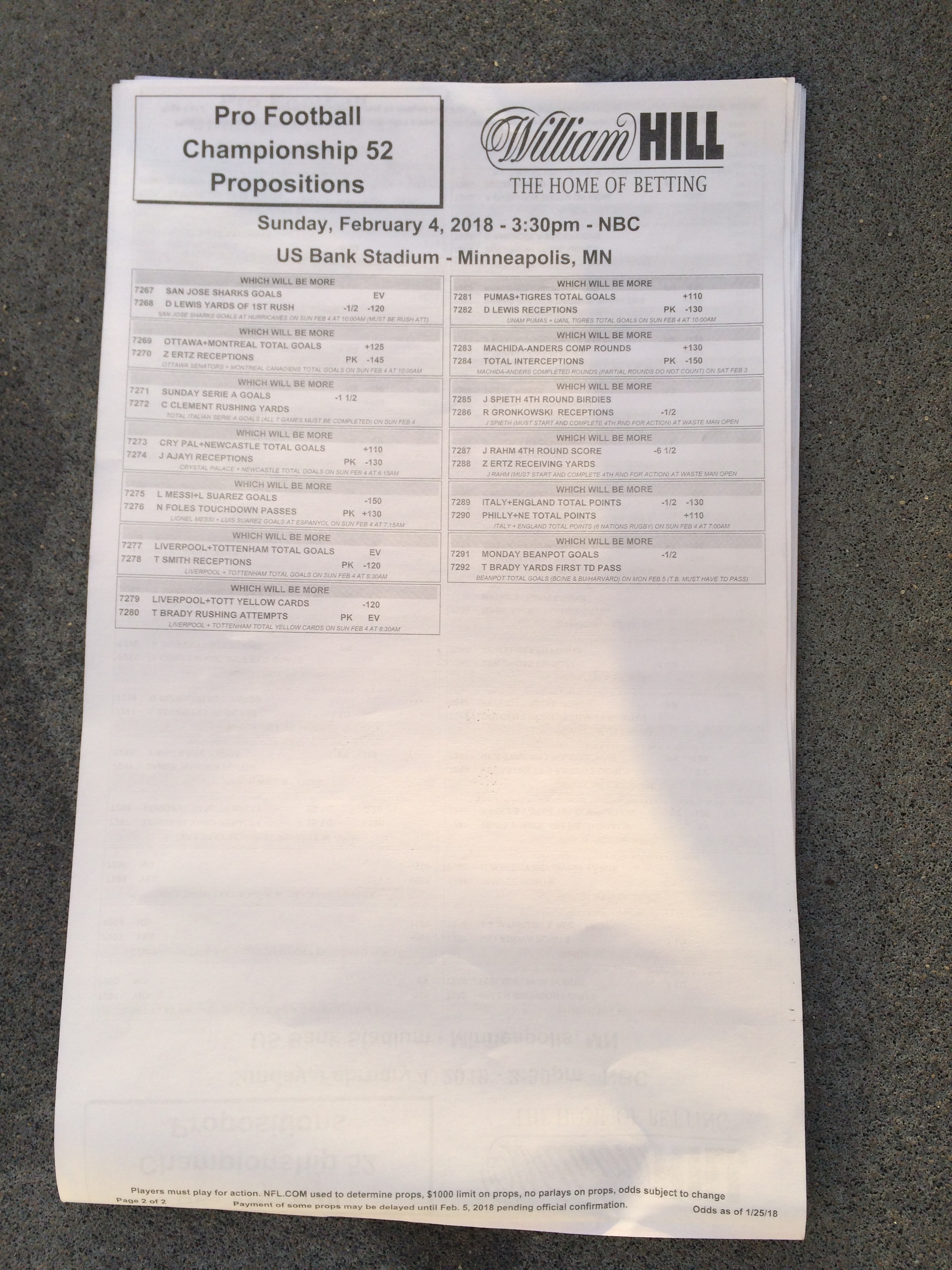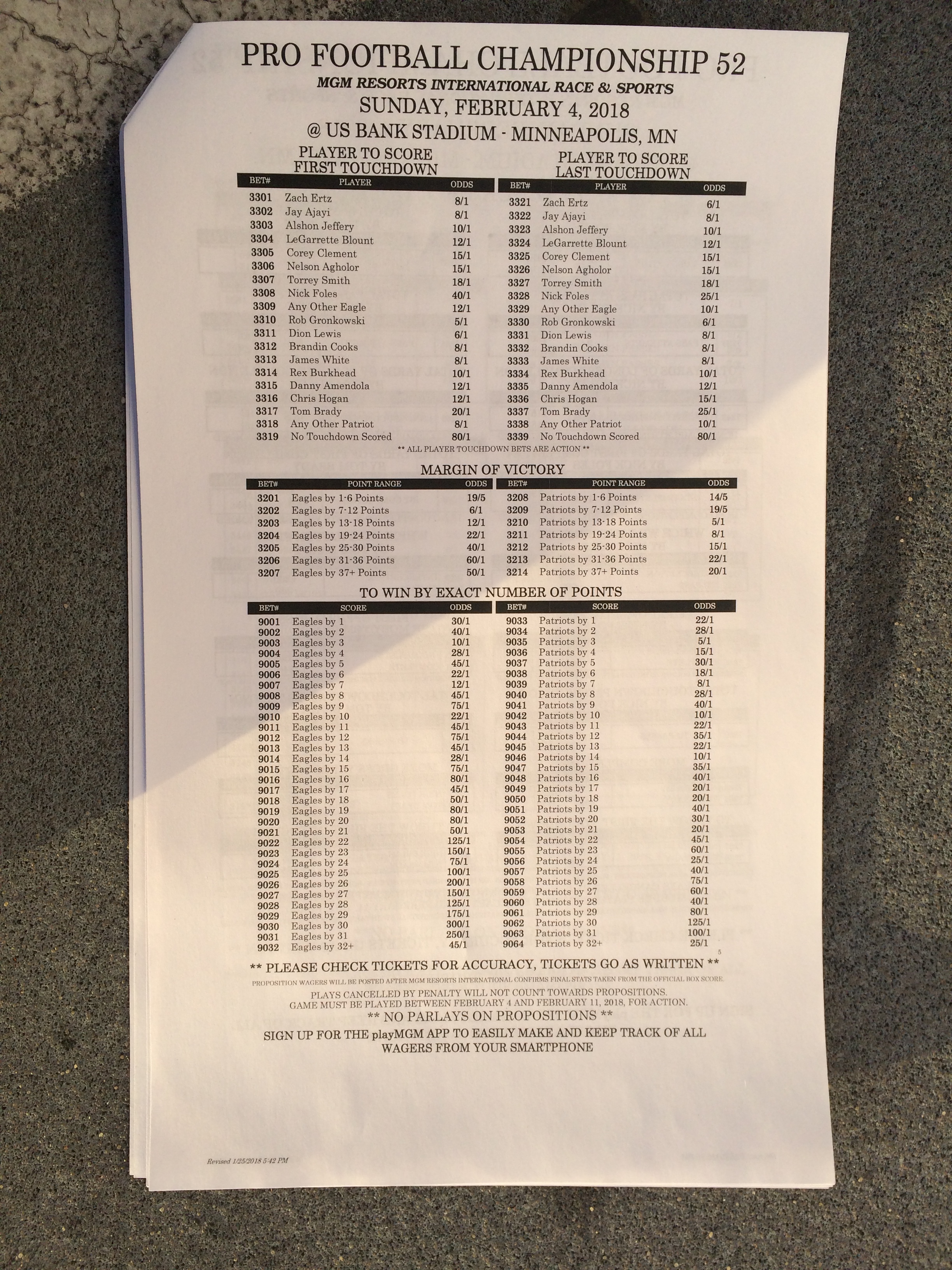 以下是拉斯维加斯几家体育博彩公司每页投注单的图片。这些表格收集于2018年1月27日,即比赛开始前八天。