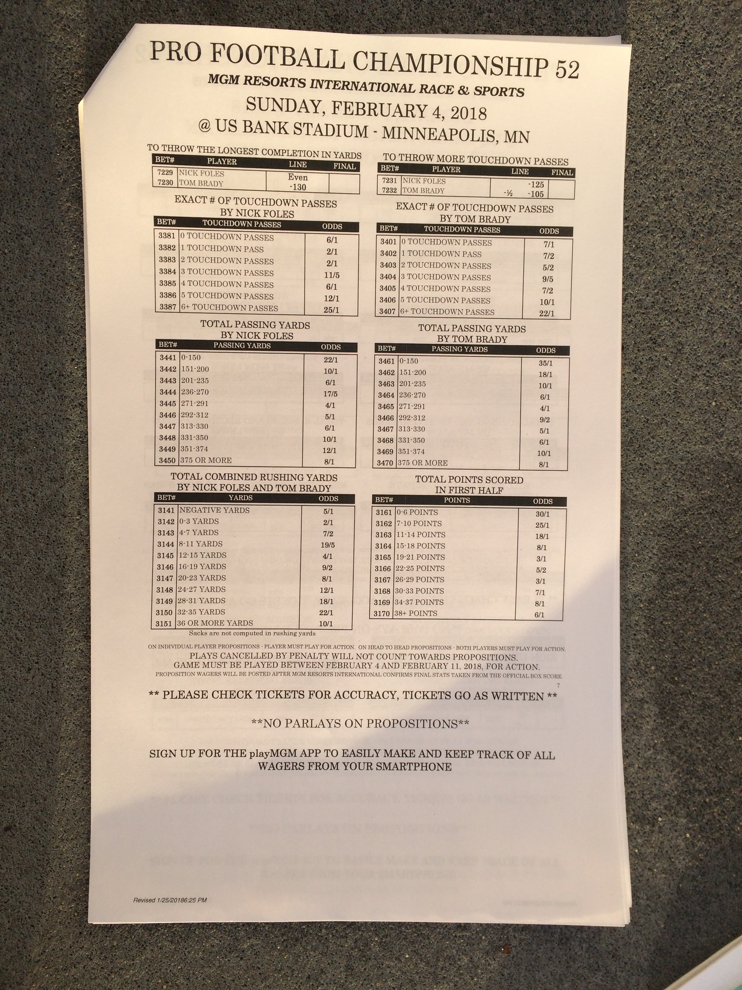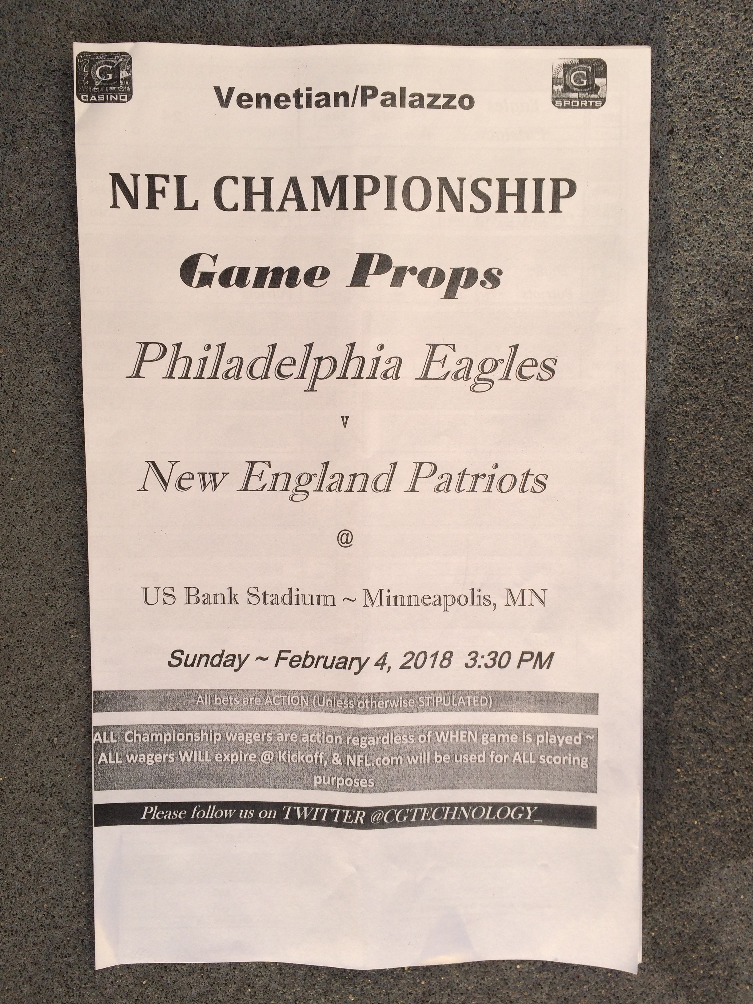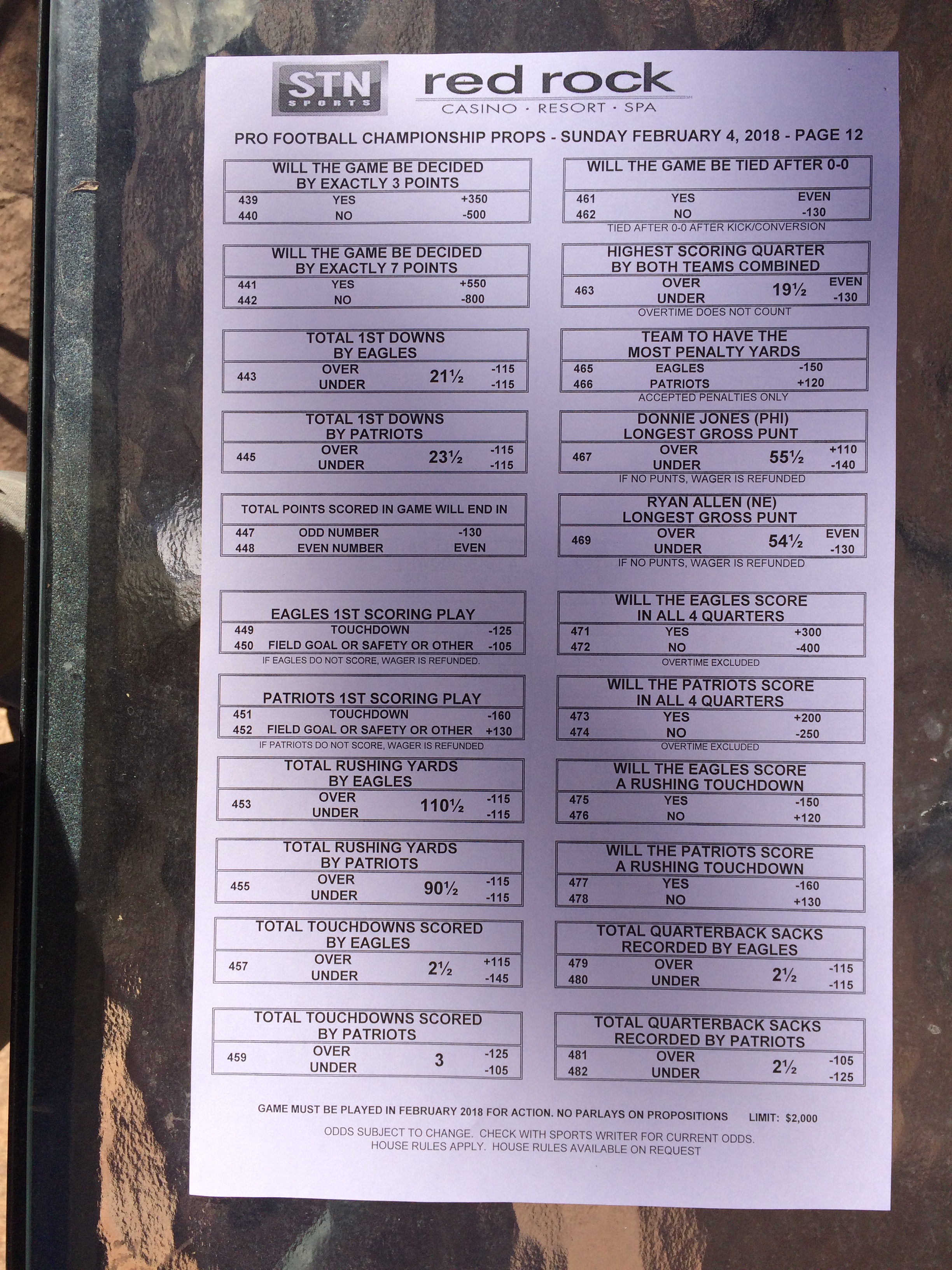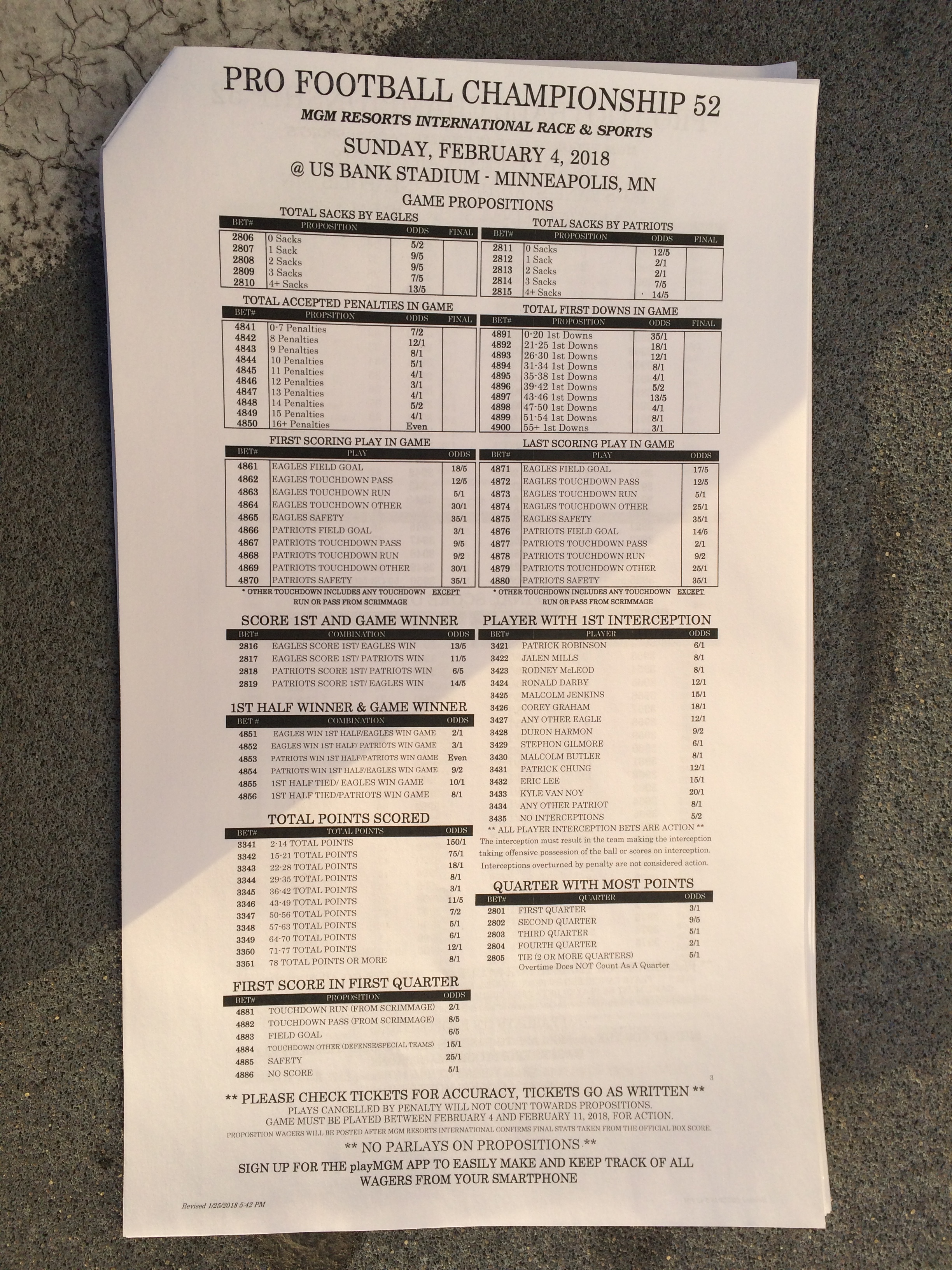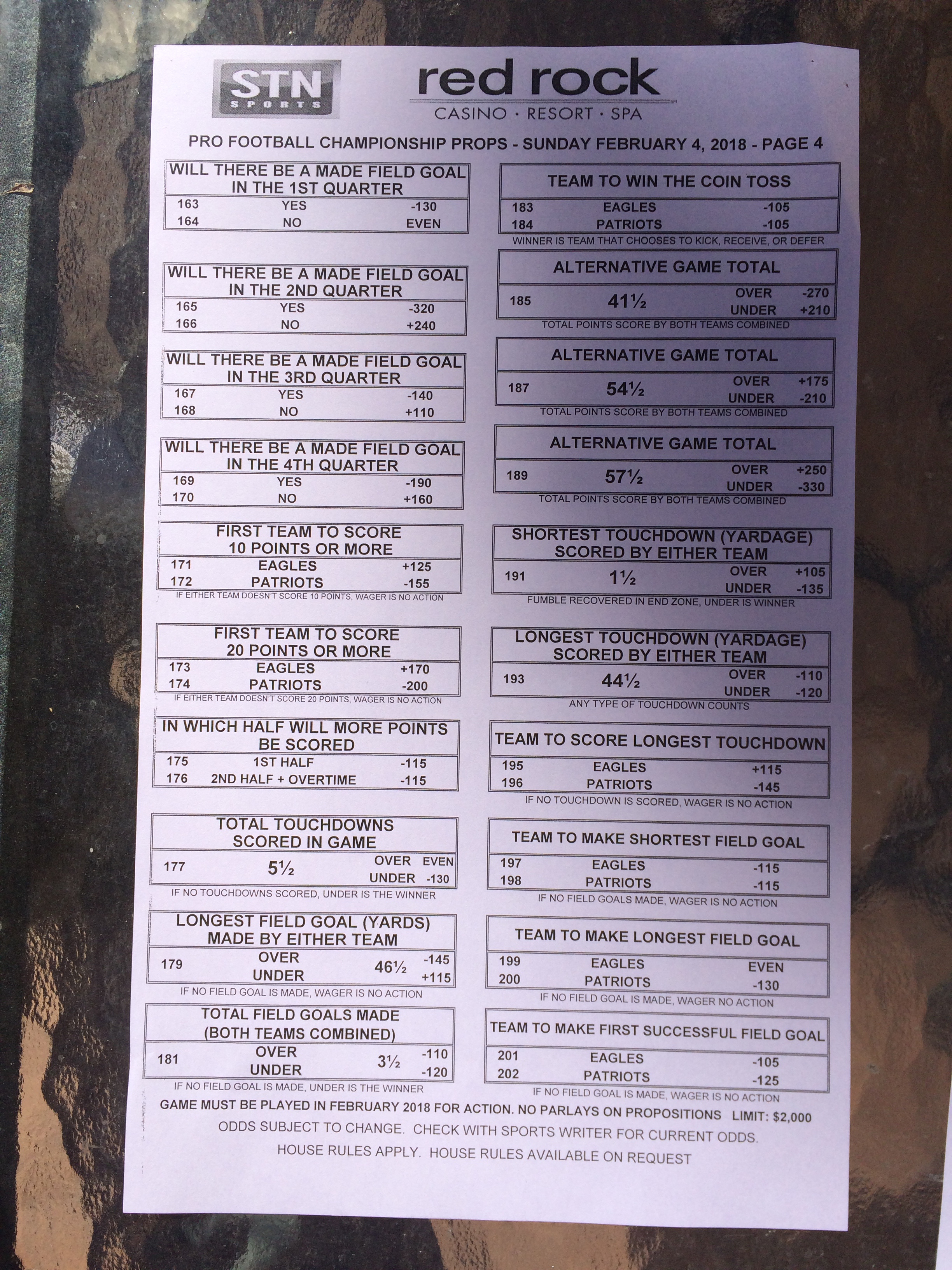 以下是拉斯维加斯几家体育博彩公司每页投注单的图片。这些表格收集于2018年1月27日,即比赛开始前八天。
