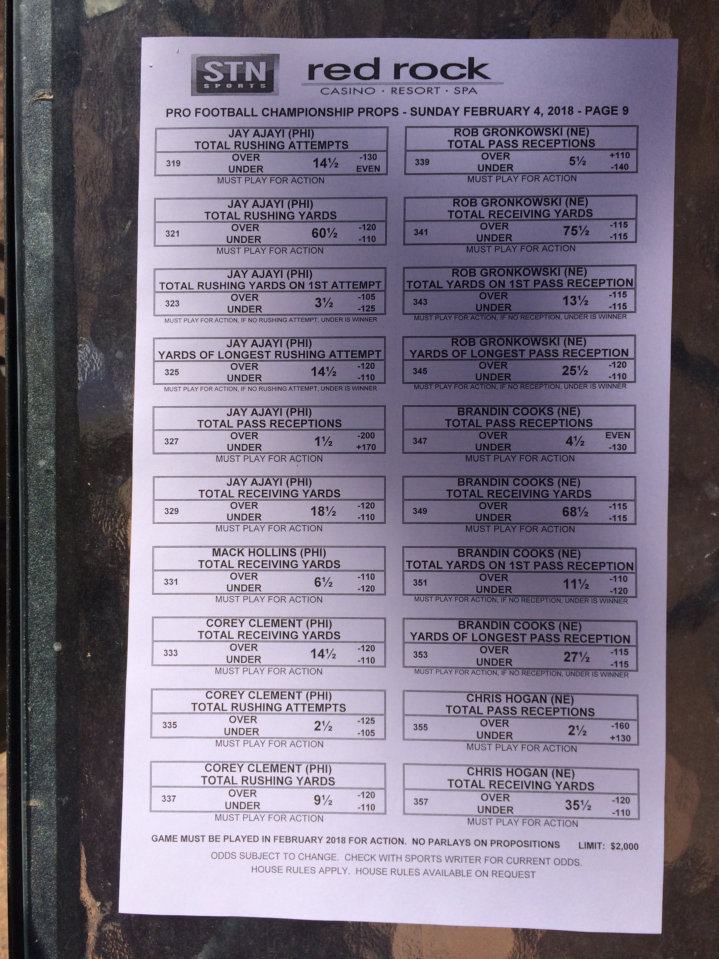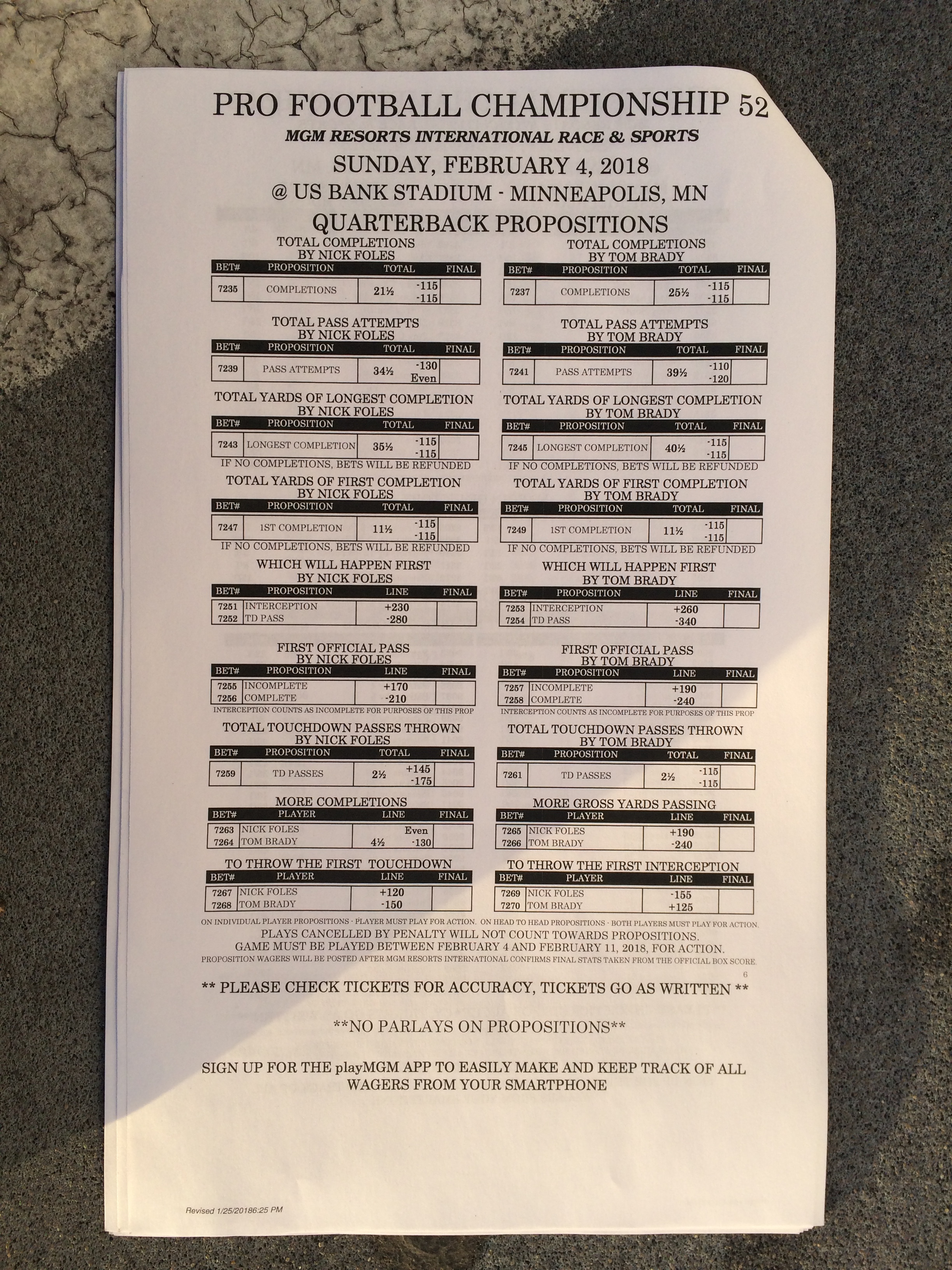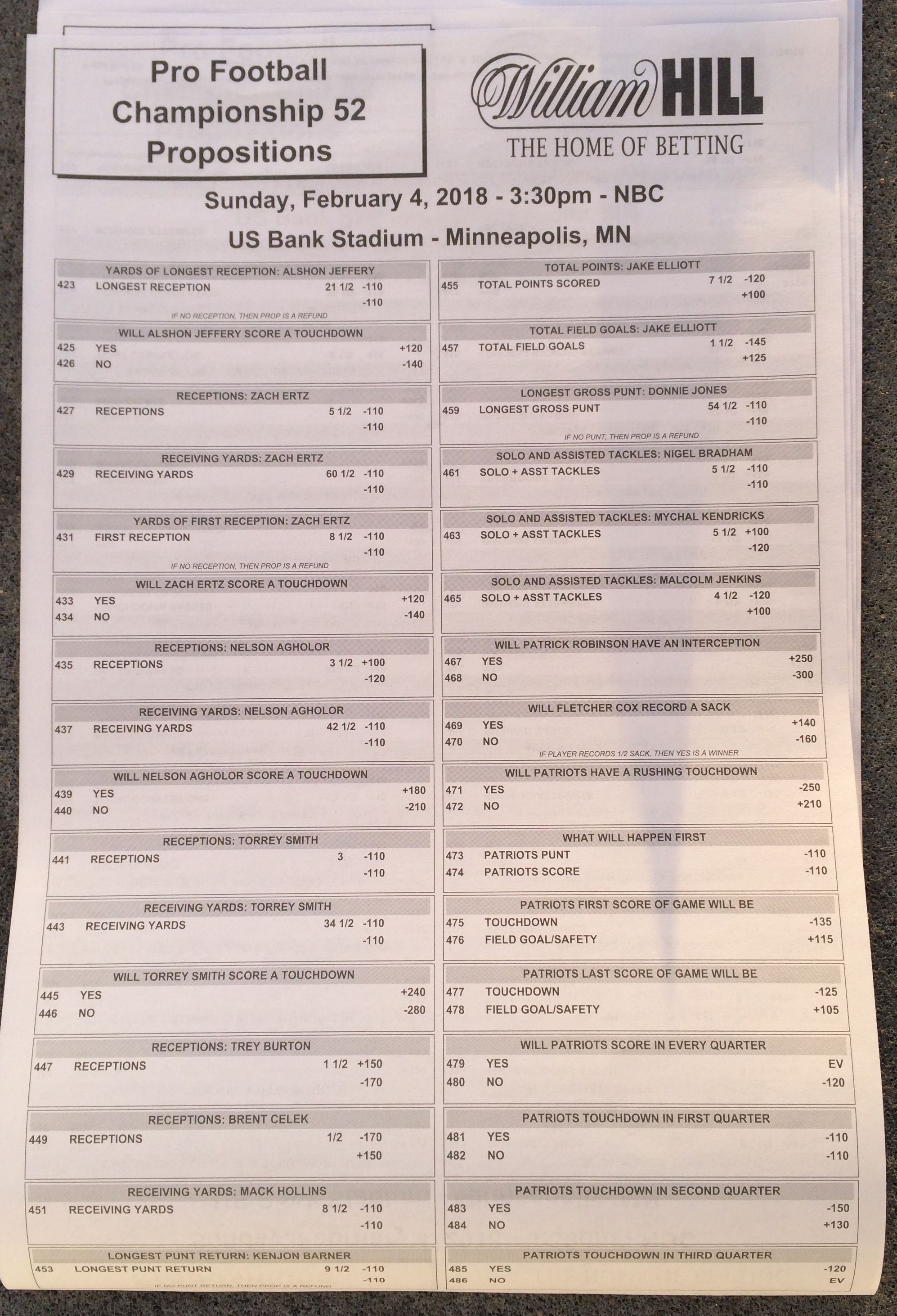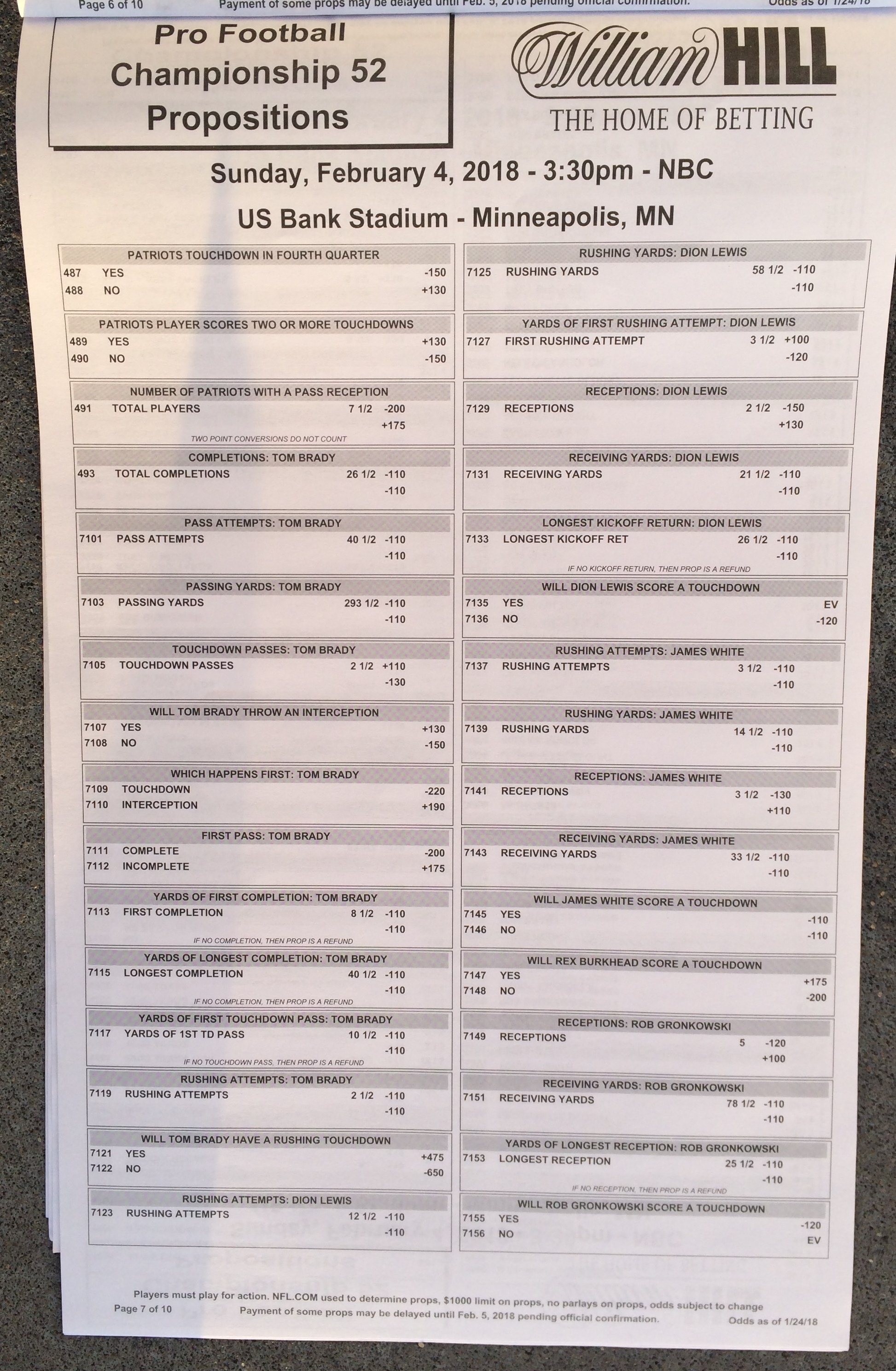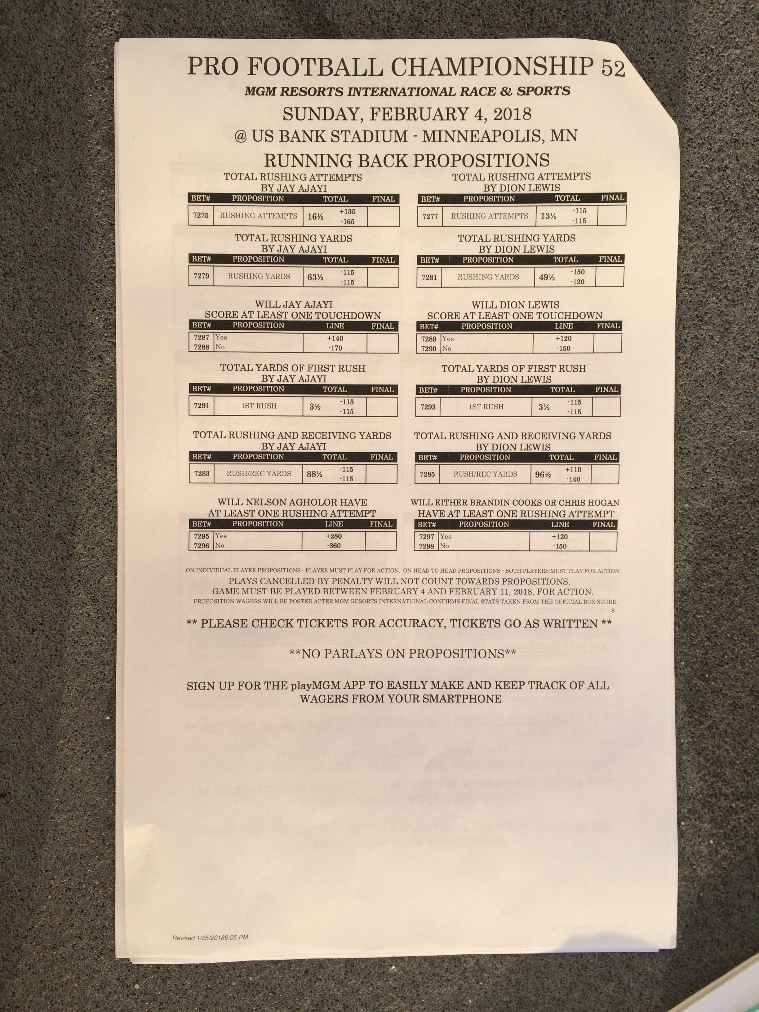 以下是拉斯维加斯几家体育博彩公司每页投注单的图片。这些表格收集于2018年1月27日,即比赛开始前八天。