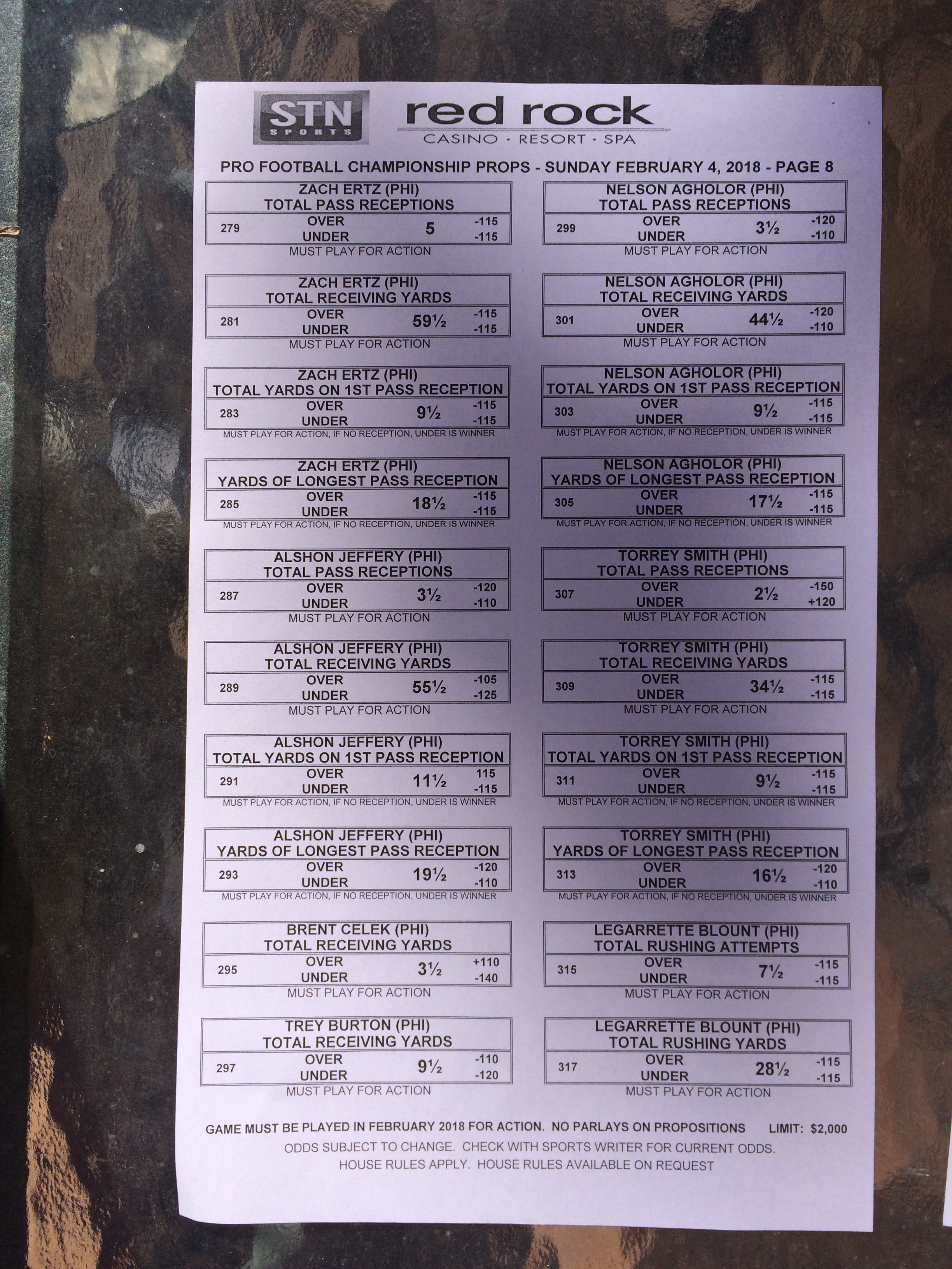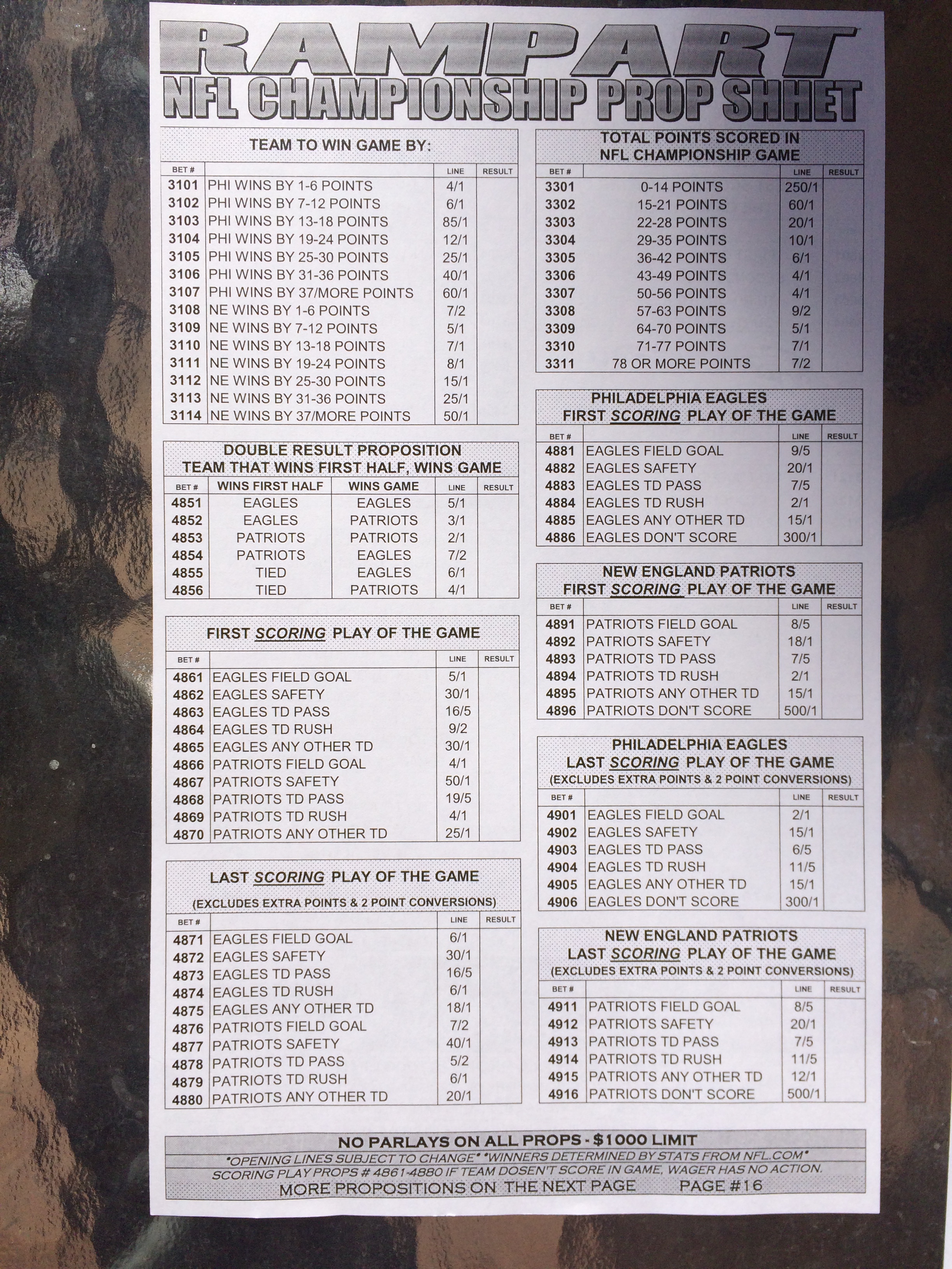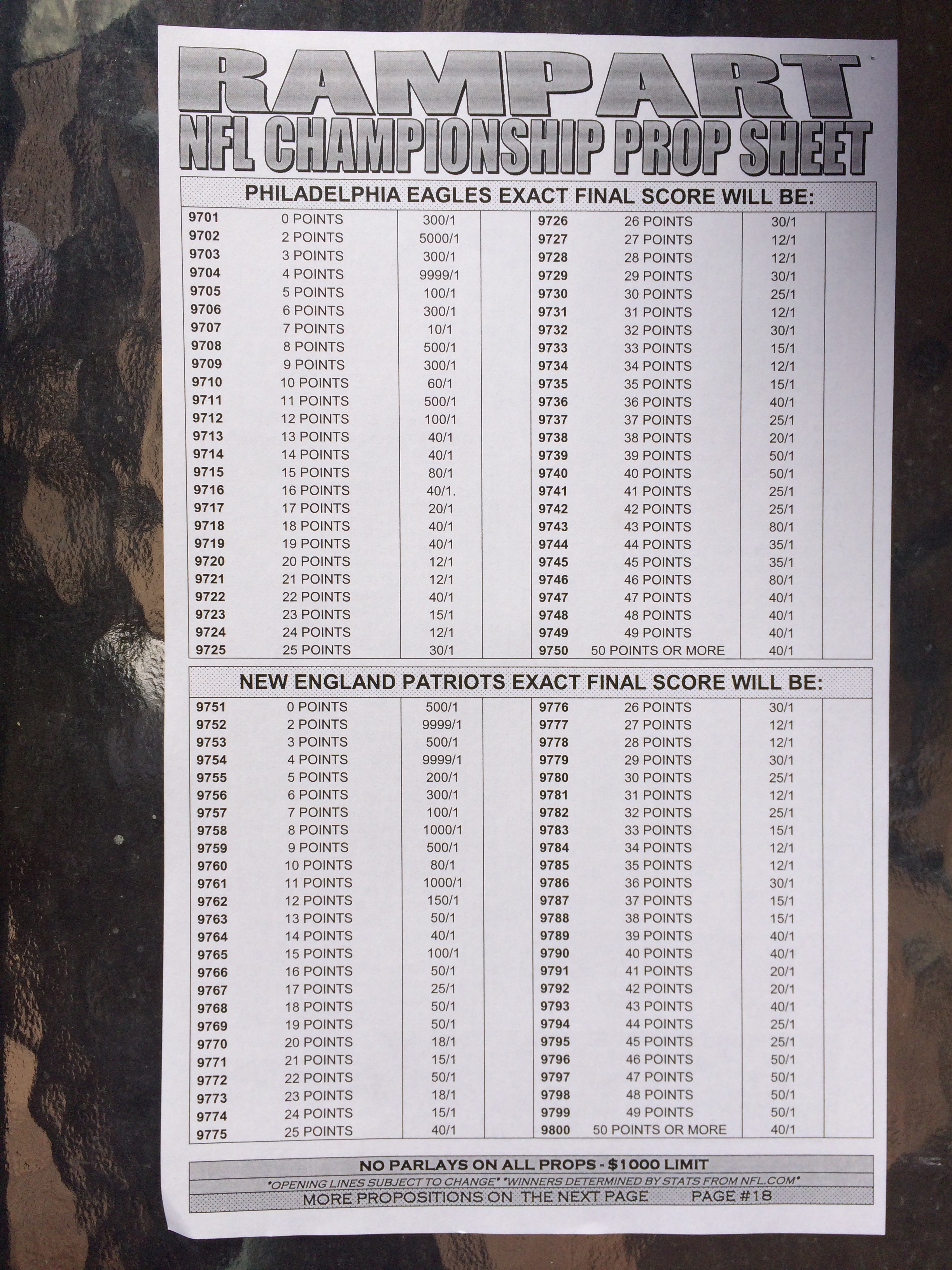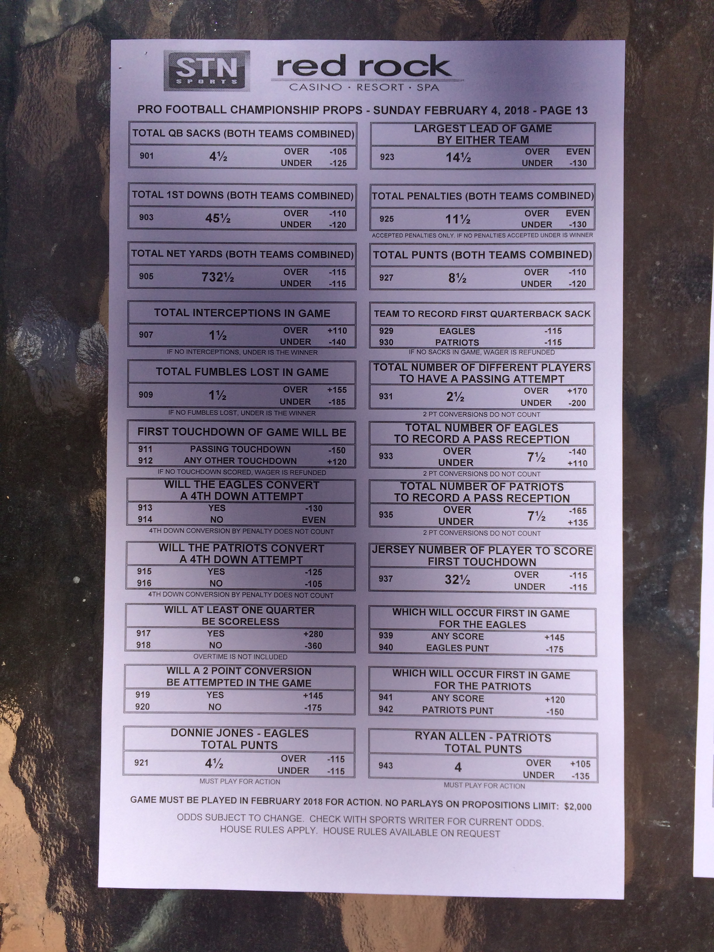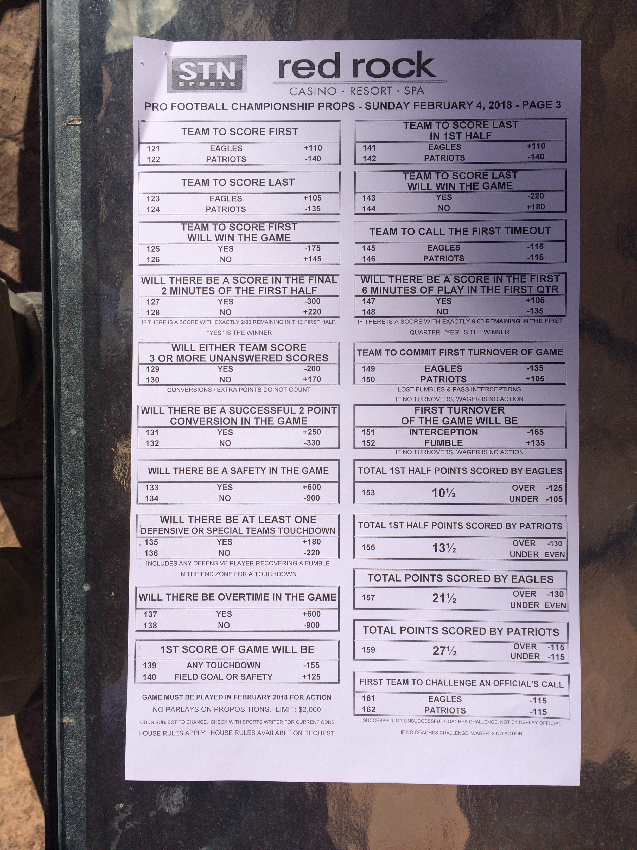 以下是拉斯维加斯几家体育博彩公司每页投注单的图片。这些表格收集于2018年1月27日,即比赛开始前八天。