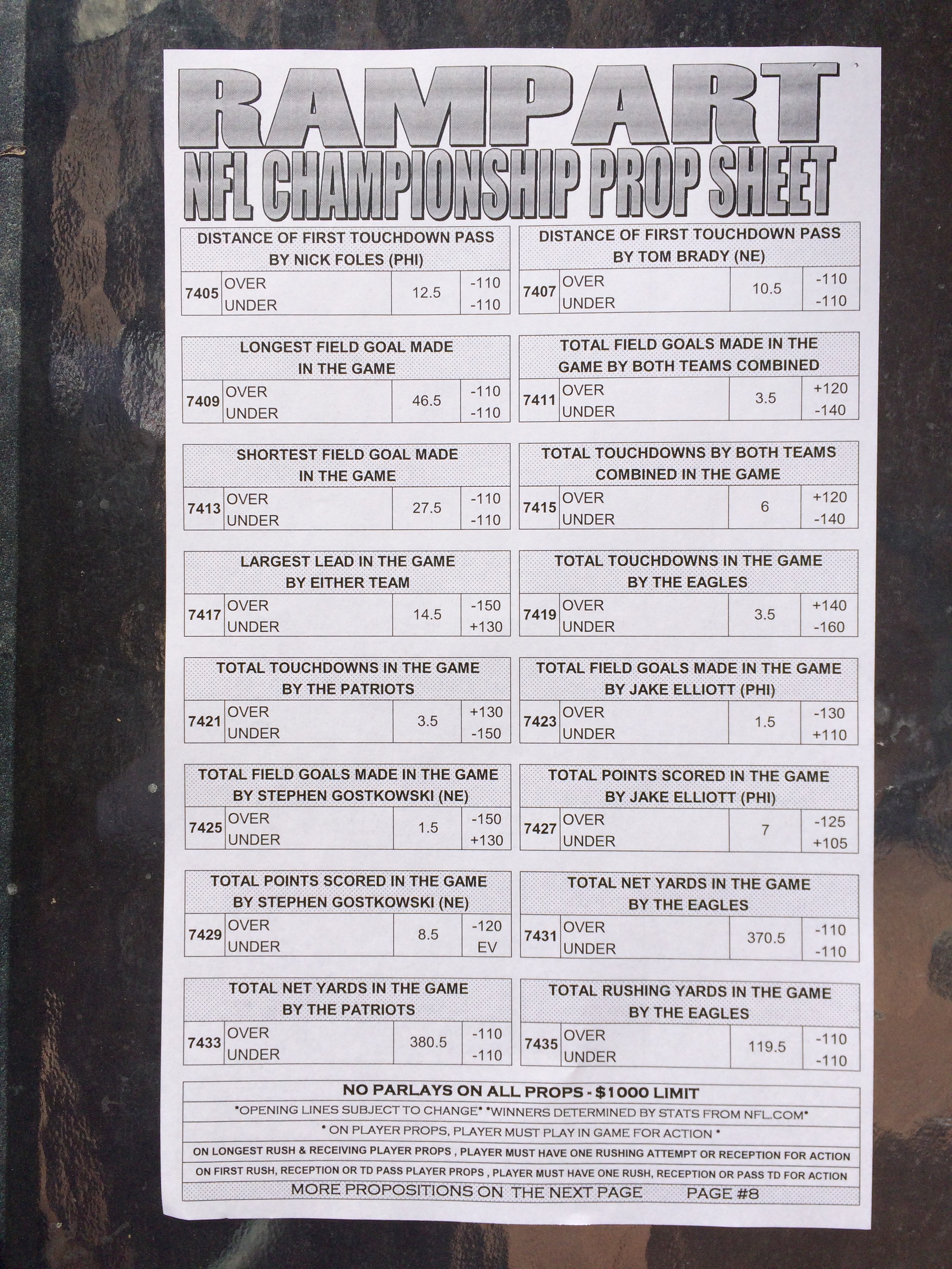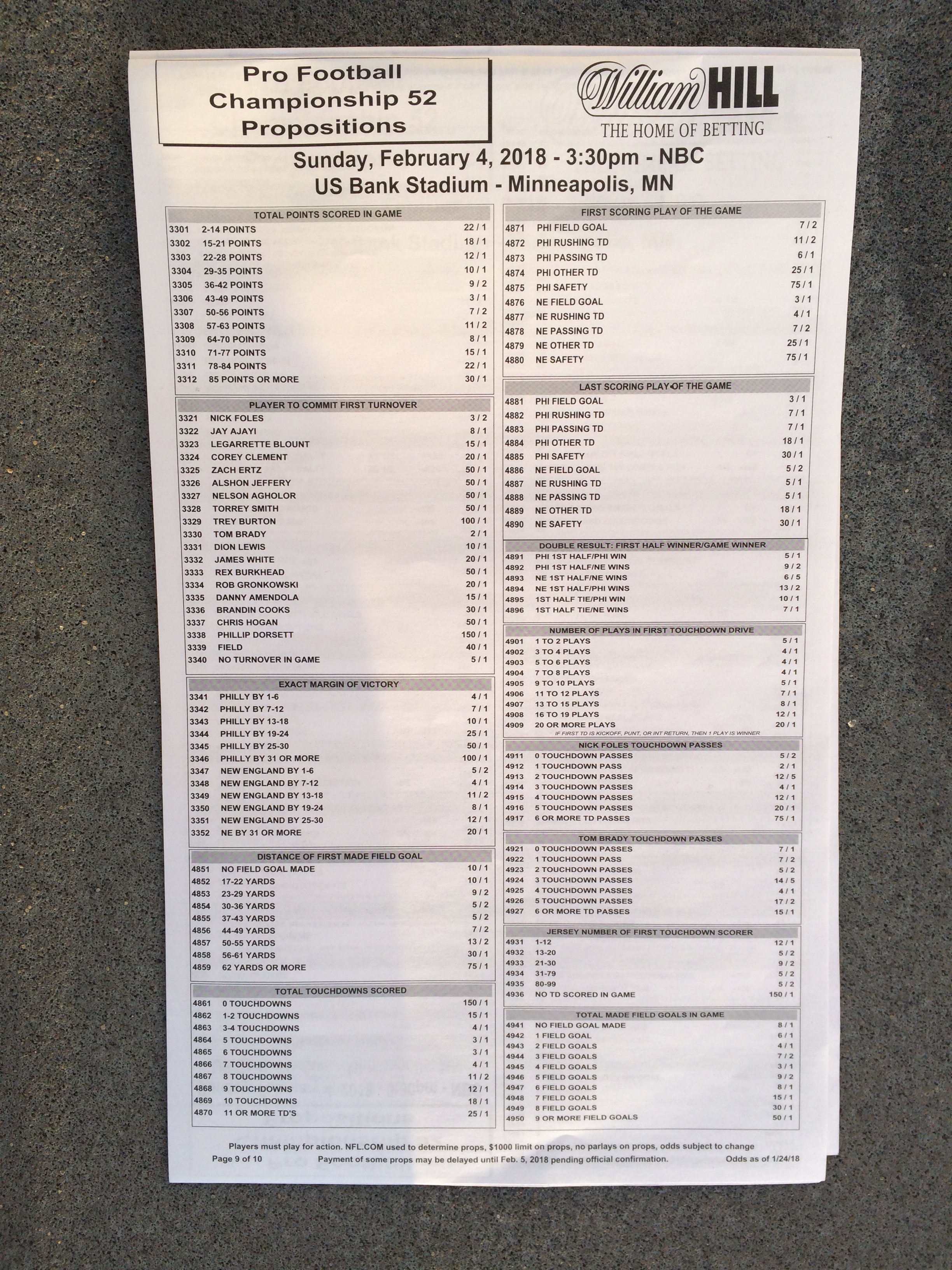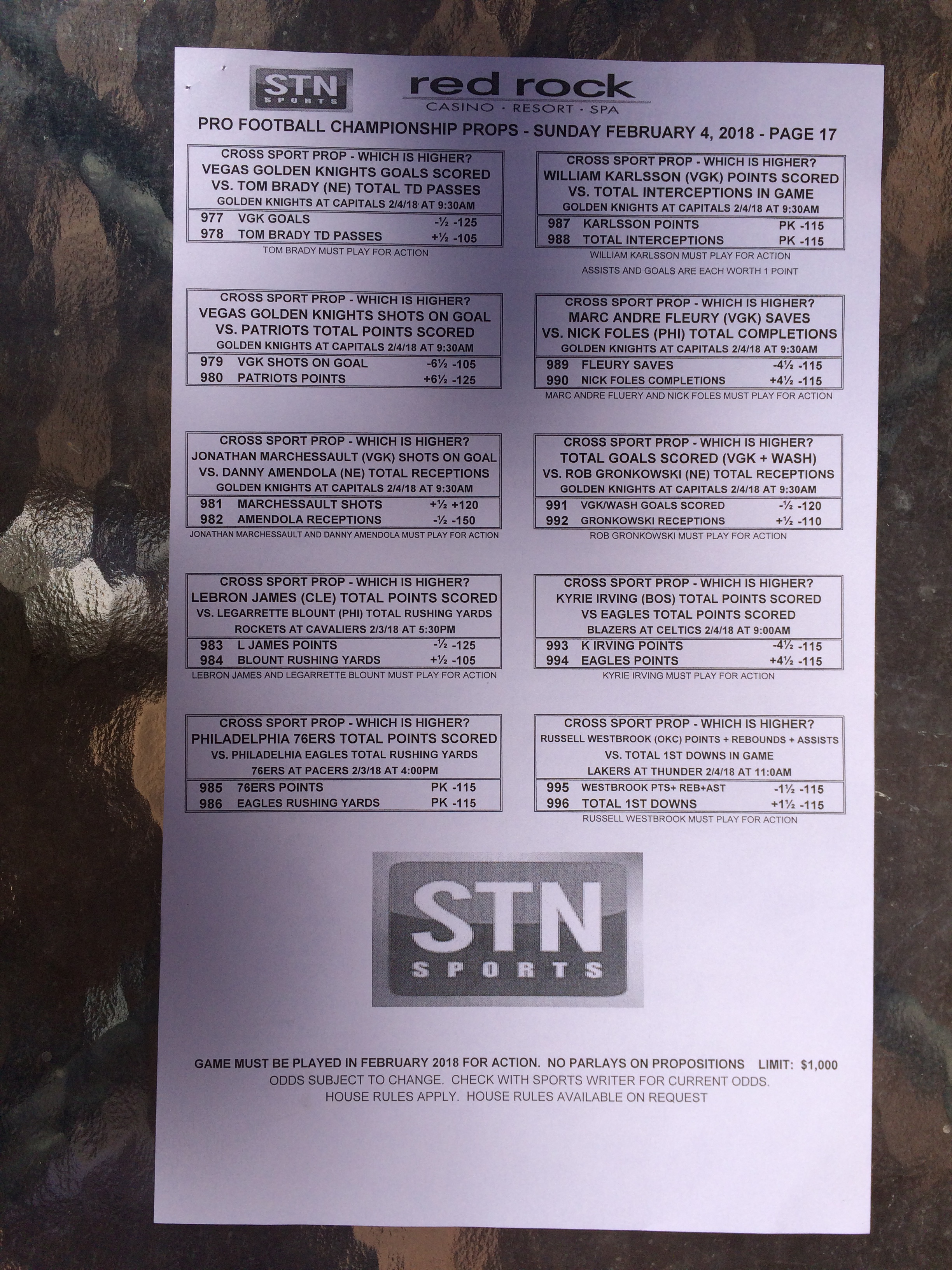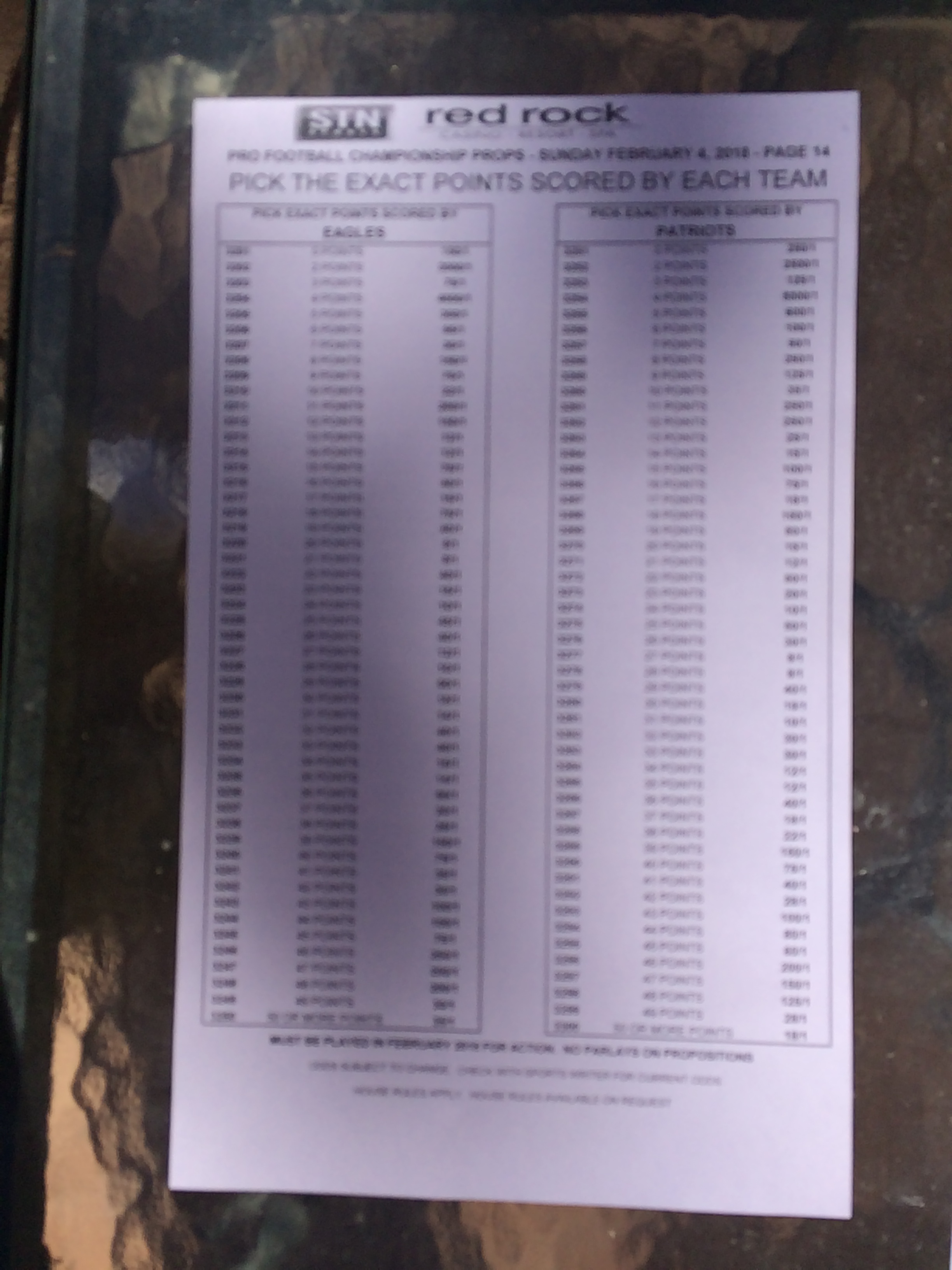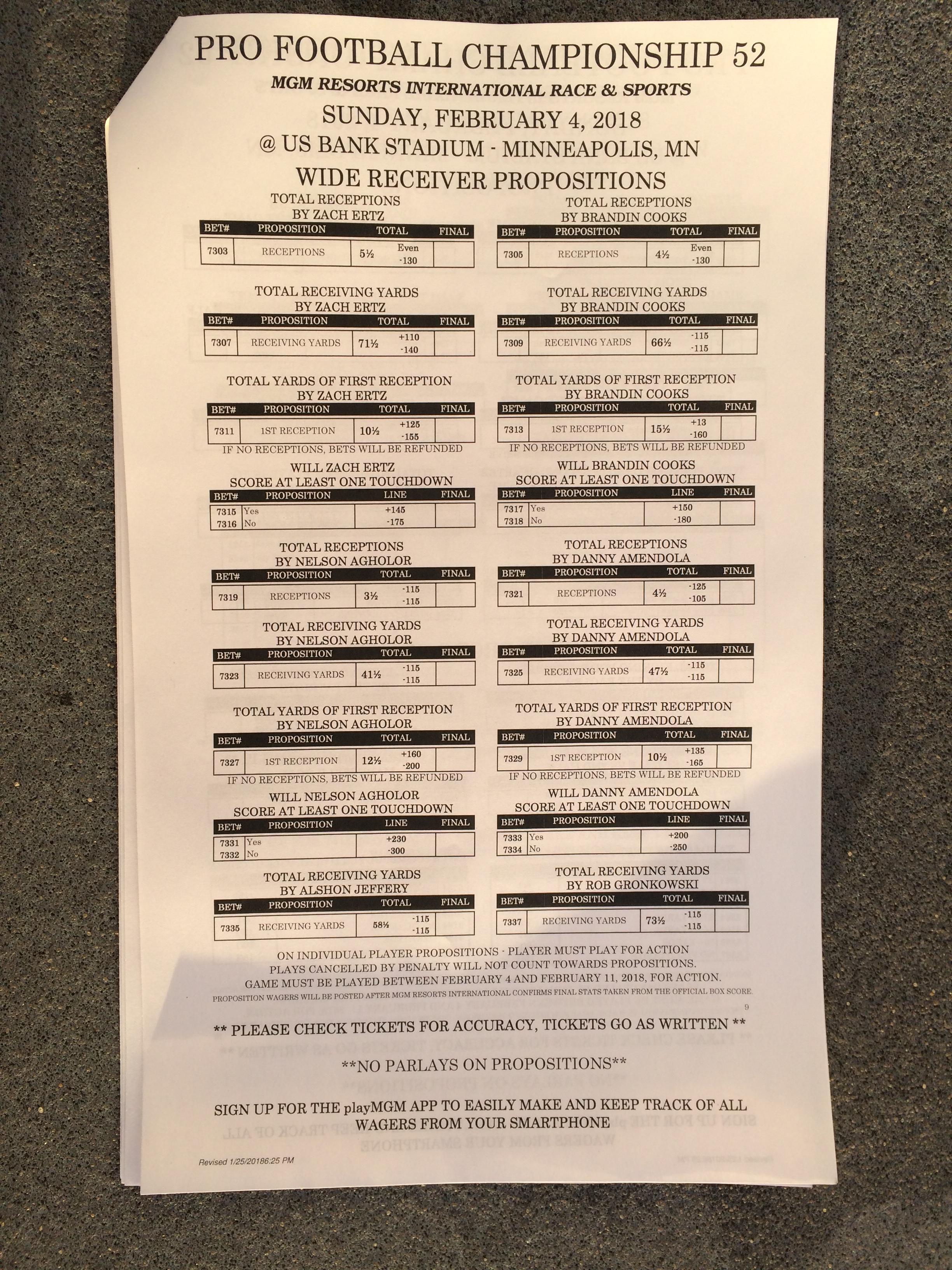以下是拉斯维加斯几家体育博彩公司每页投注单的图片。这些表格收集于2018年1月27日,即比赛开始前八天。