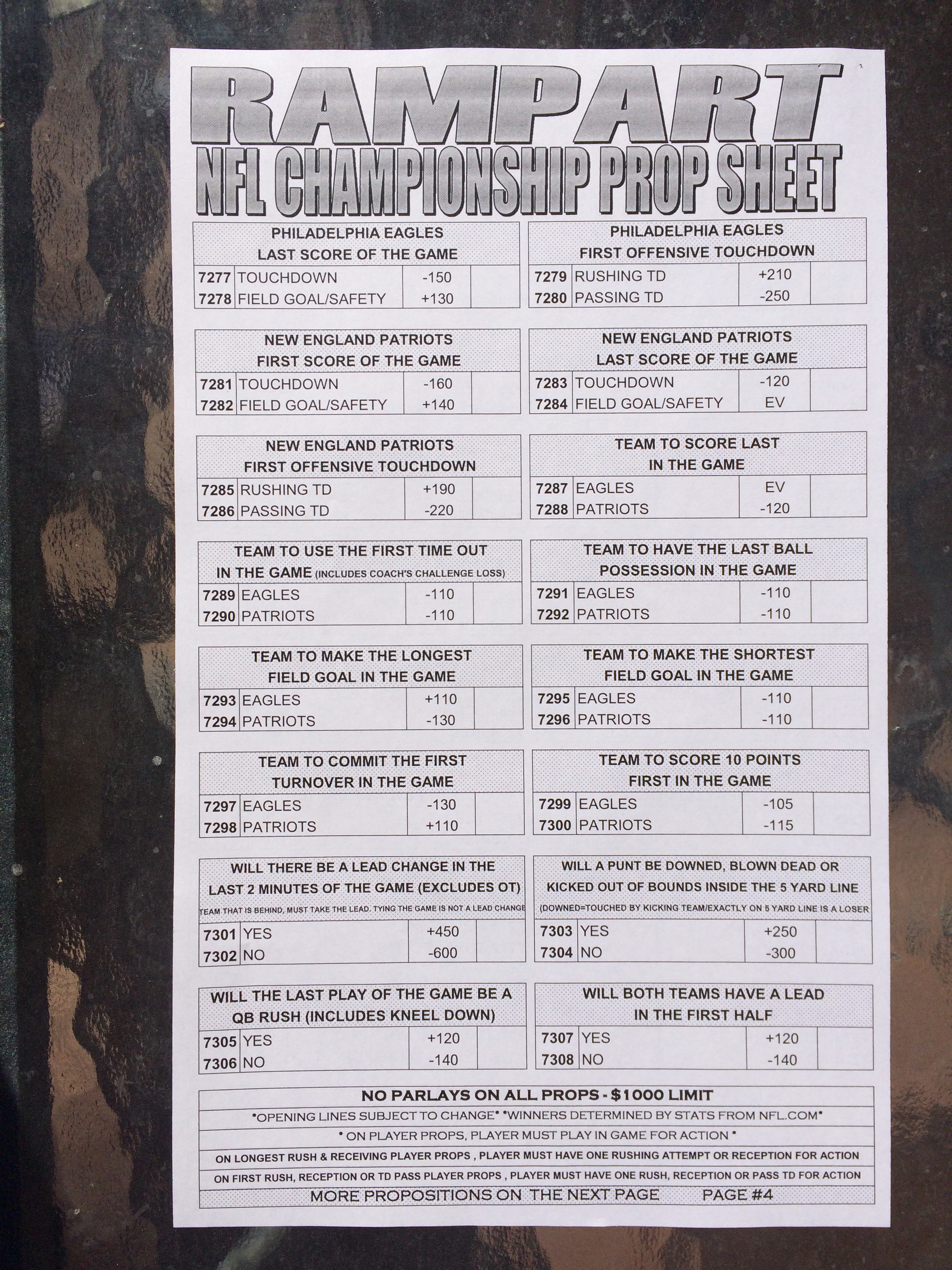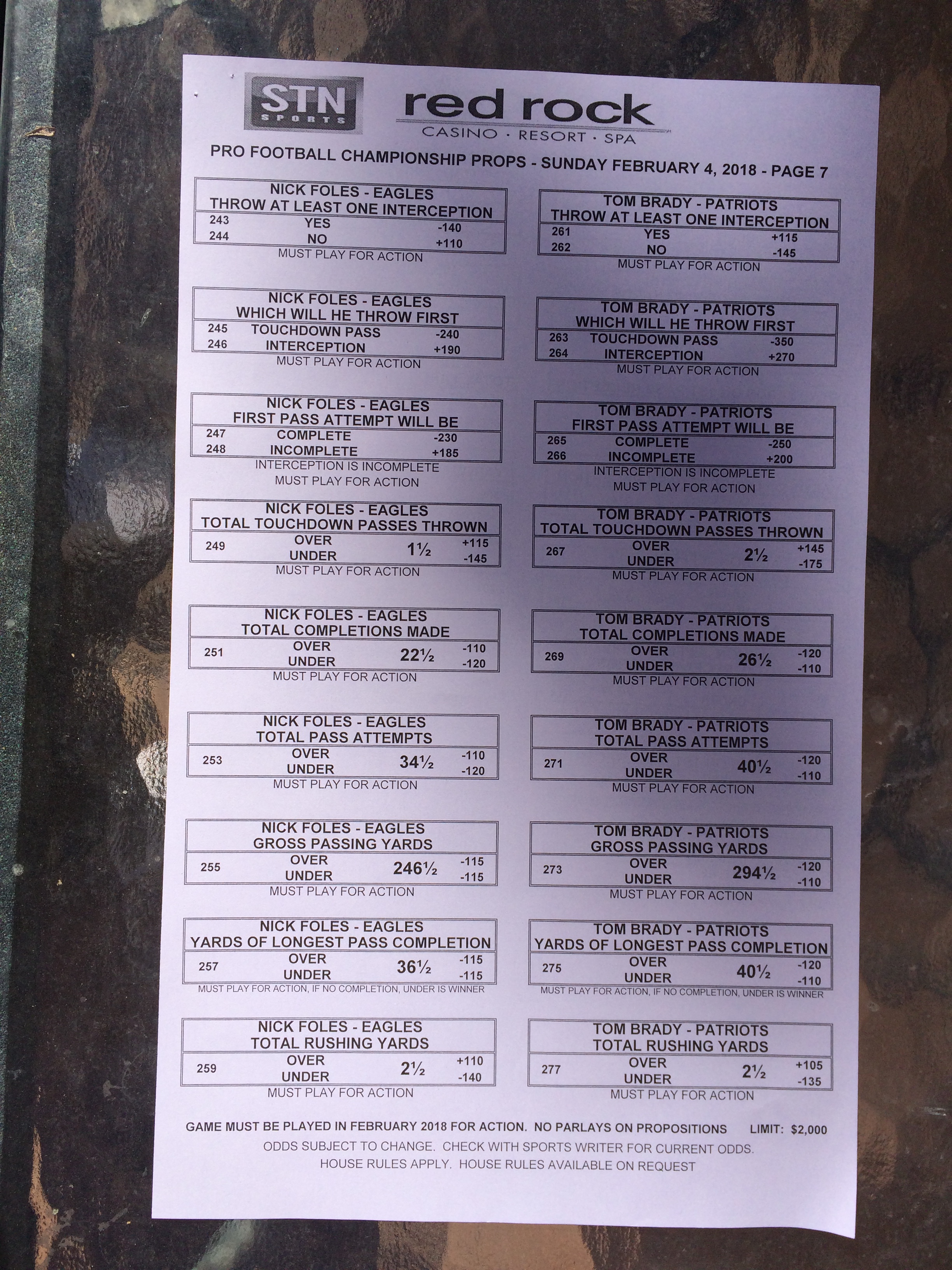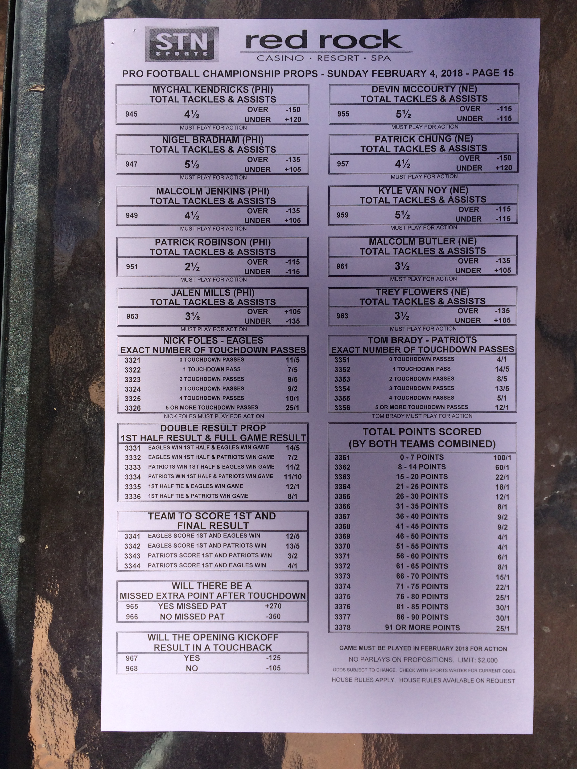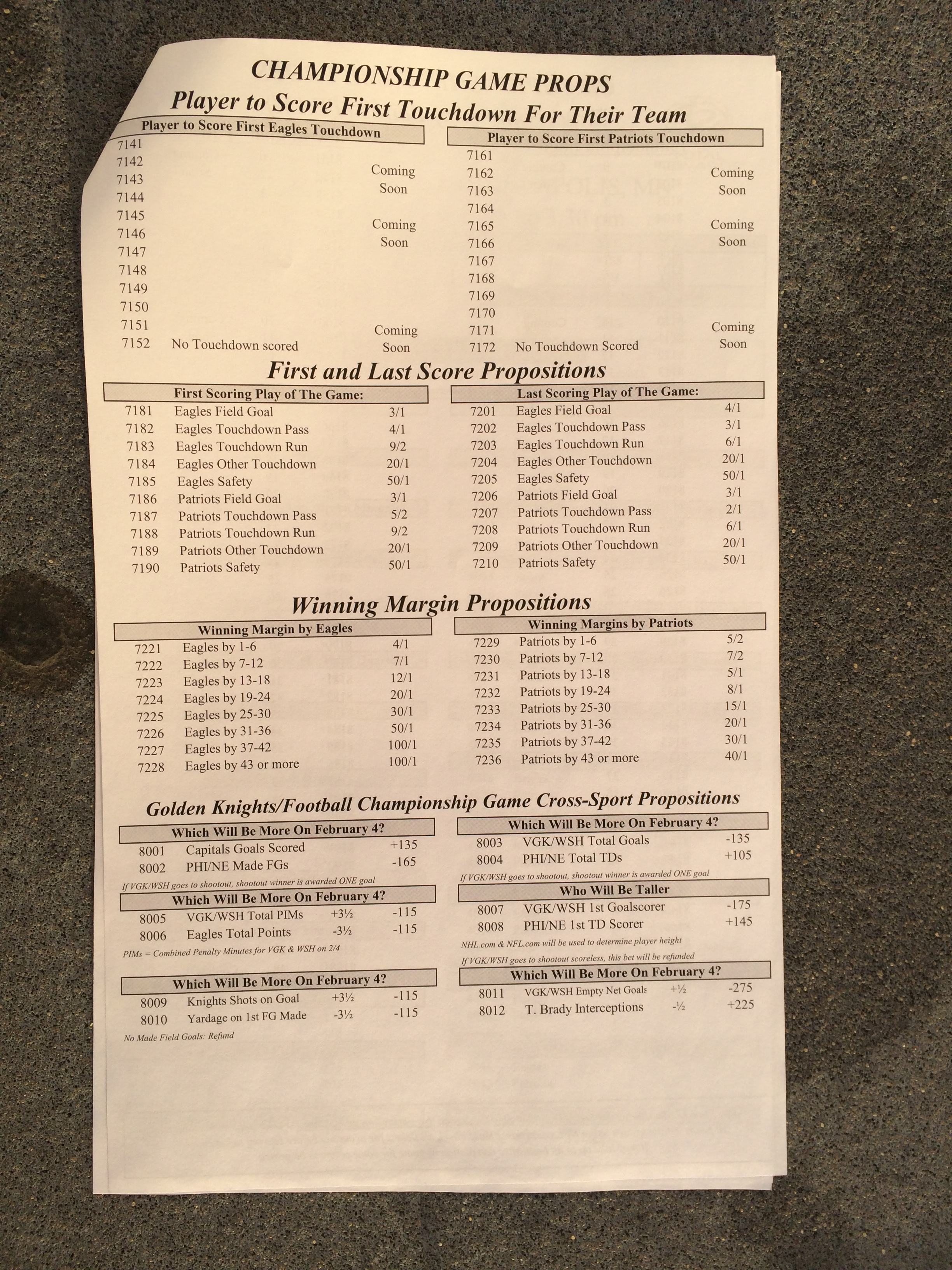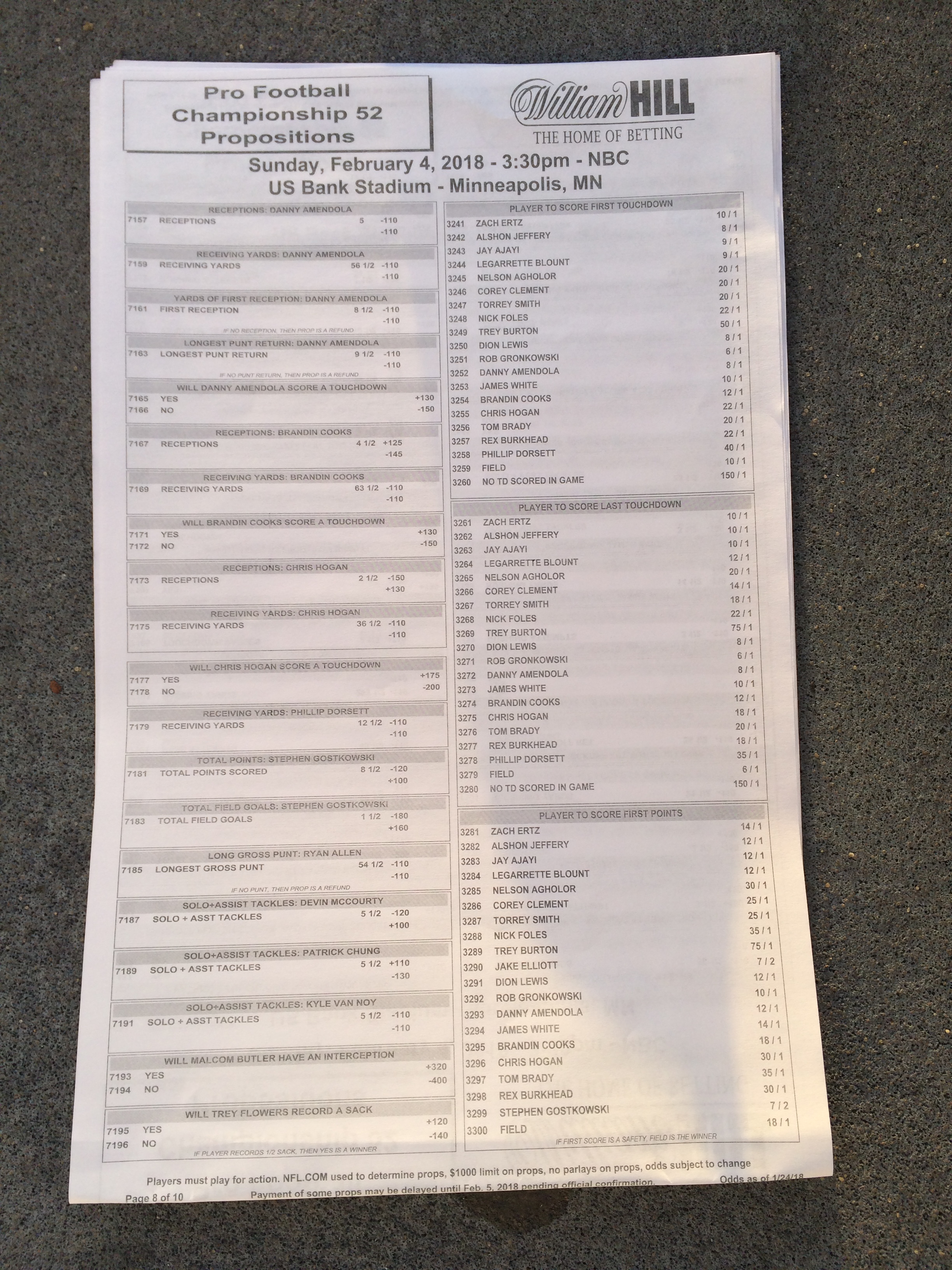 以下是拉斯维加斯几家体育博彩公司每页投注单的图片。这些表格收集于2018年1月27日,即比赛开始前八天。