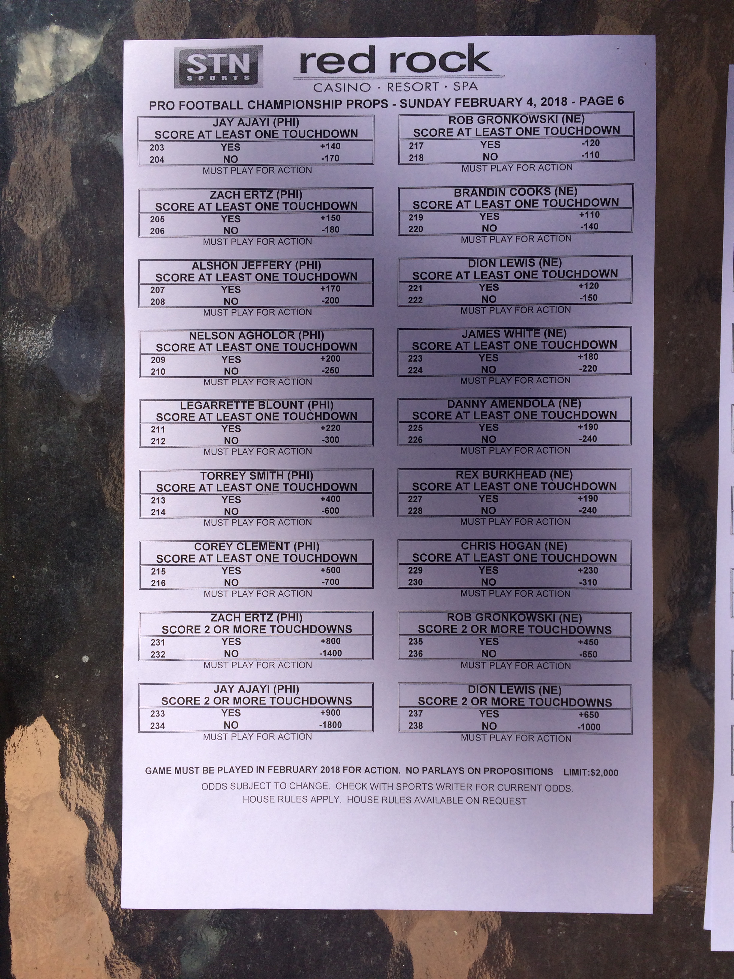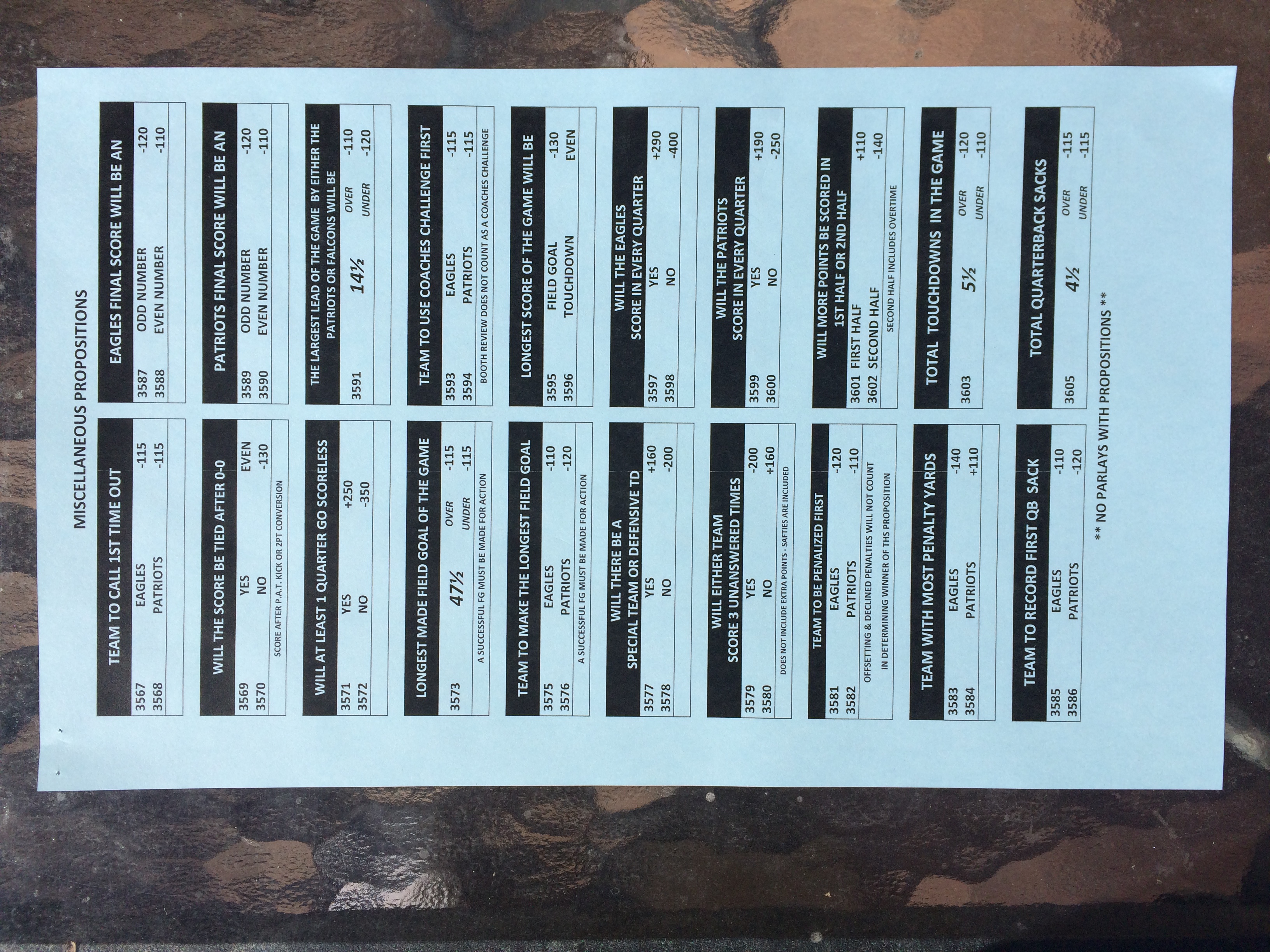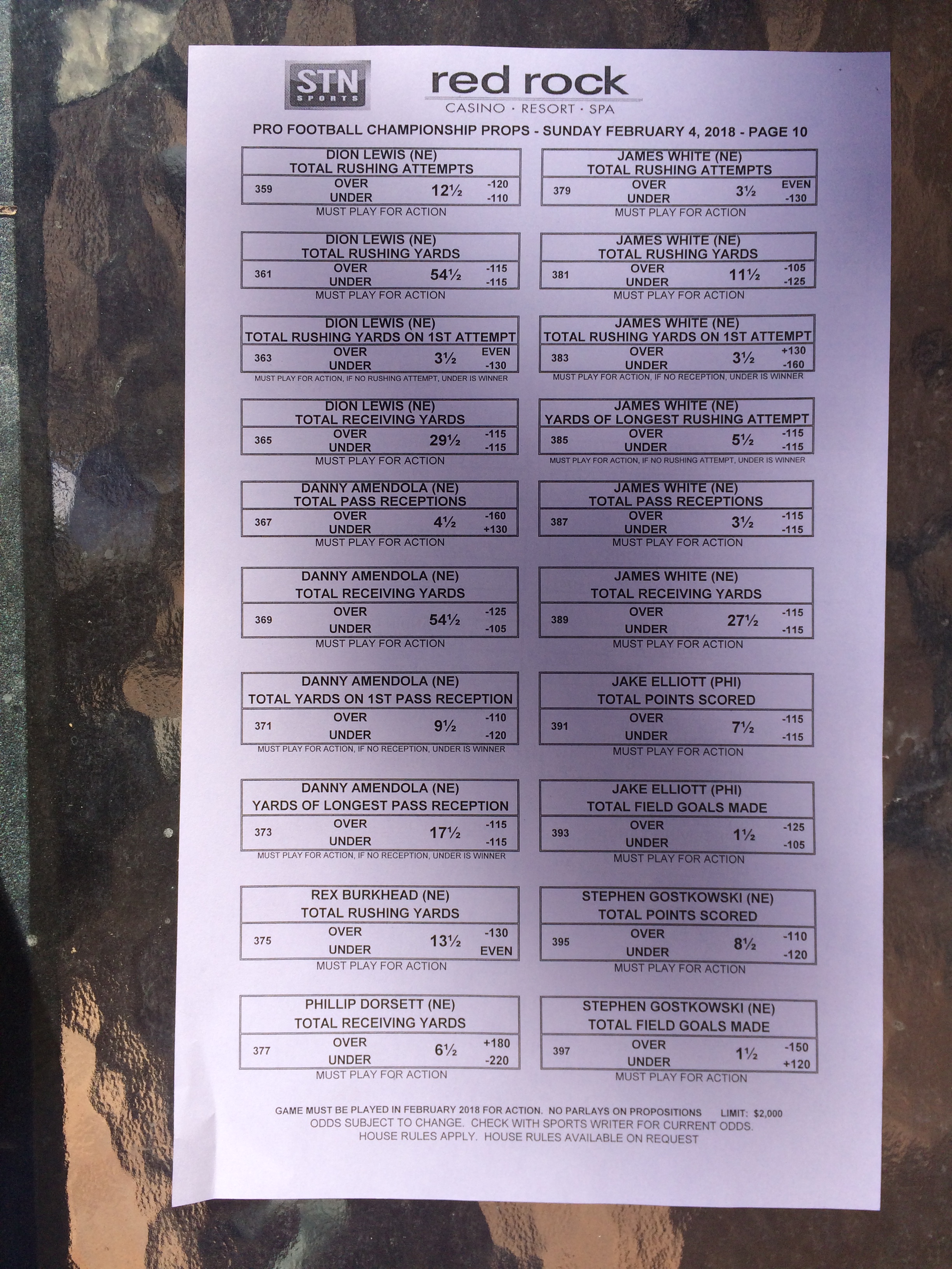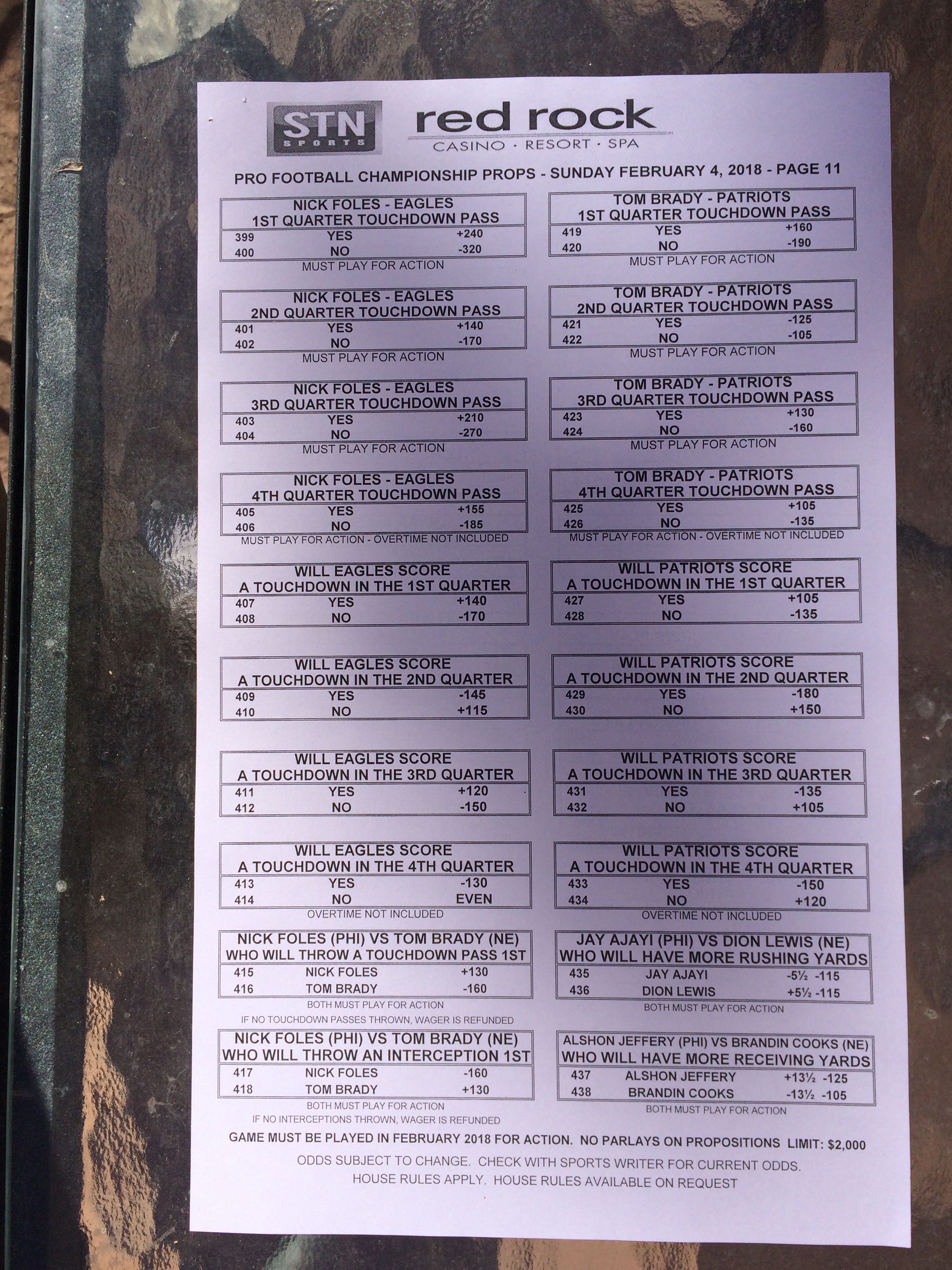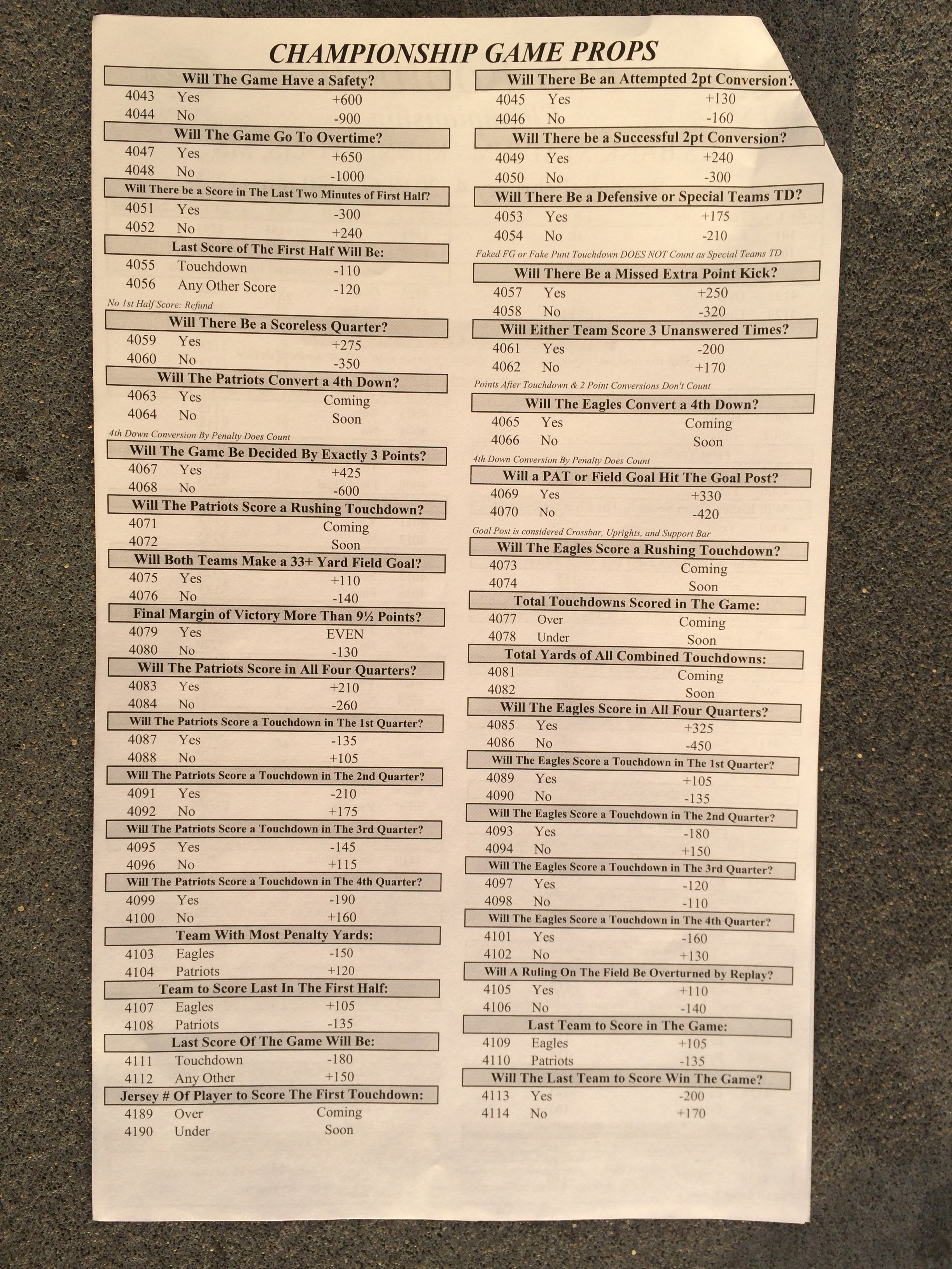 以下是拉斯维加斯几家体育博彩公司每页投注单的图片。这些表格收集于2018年1月27日,即比赛开始前八天。