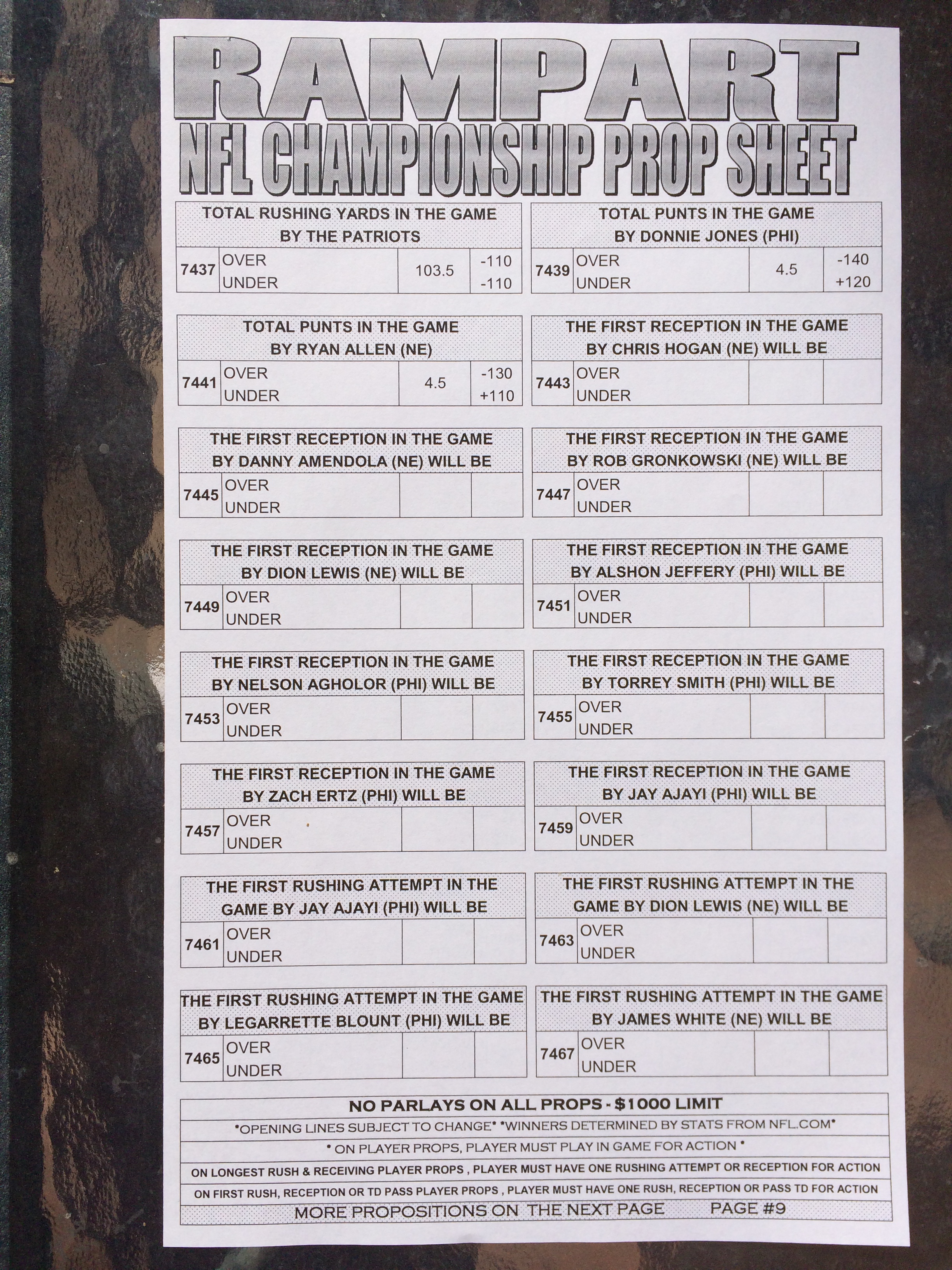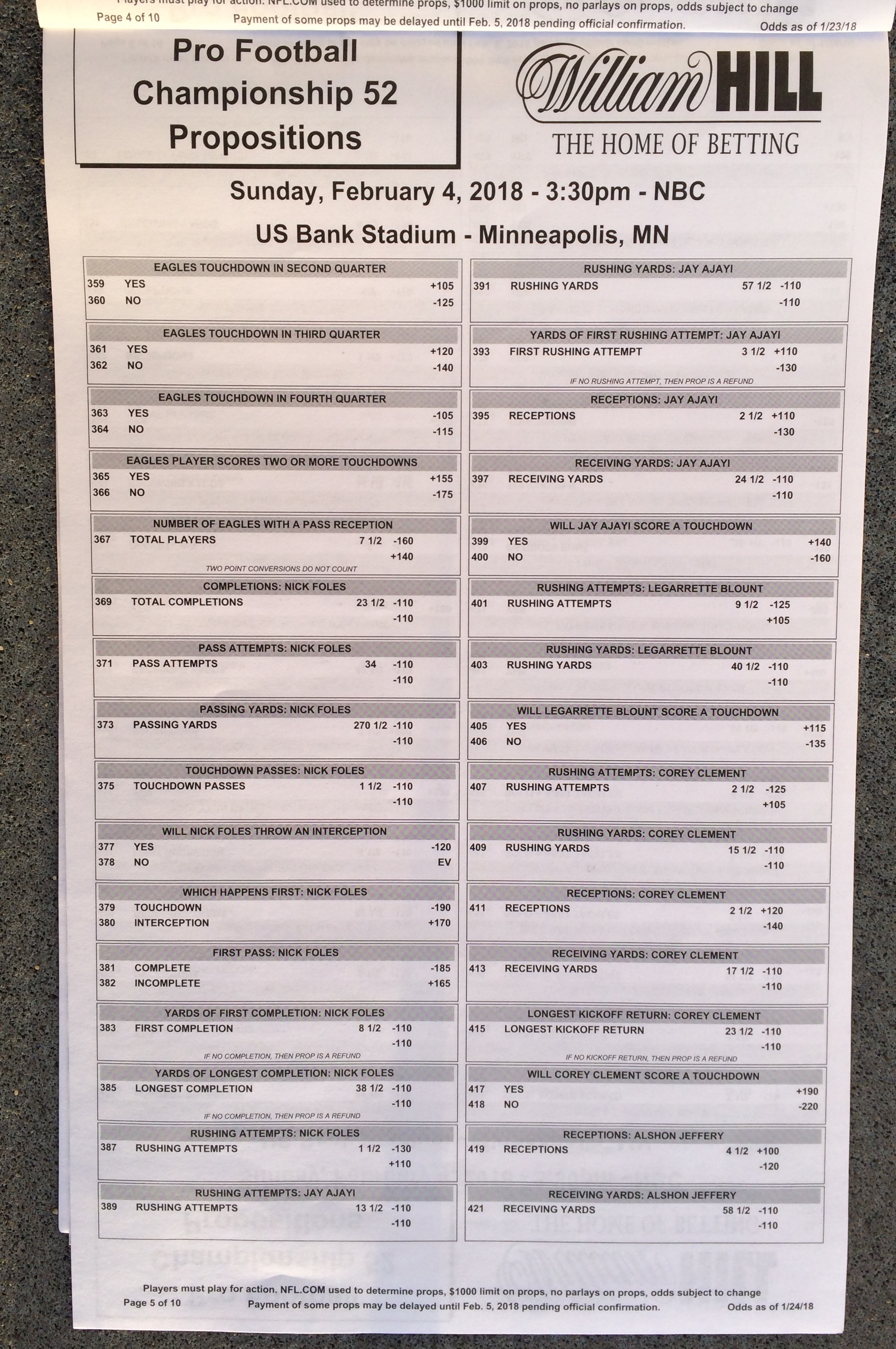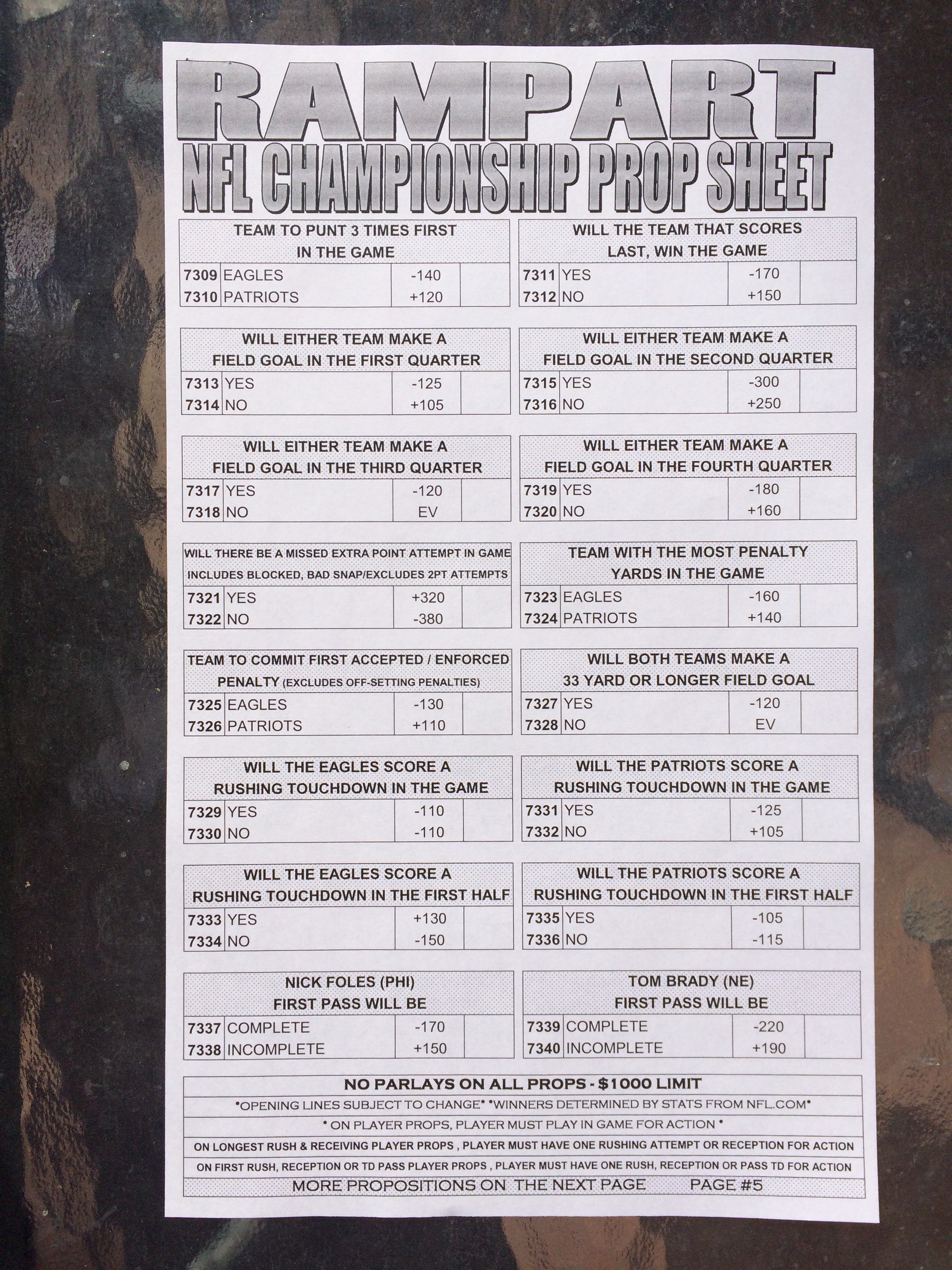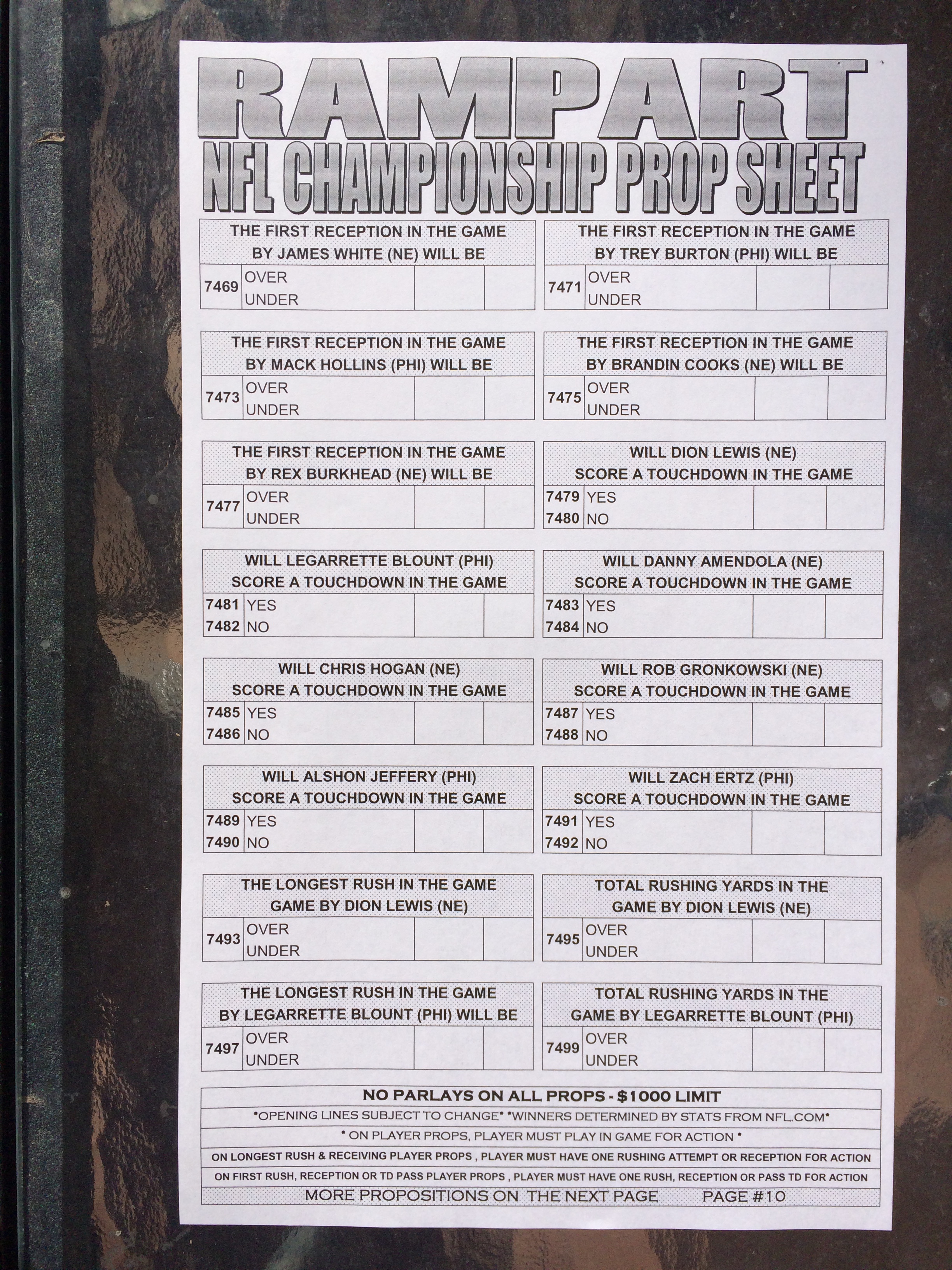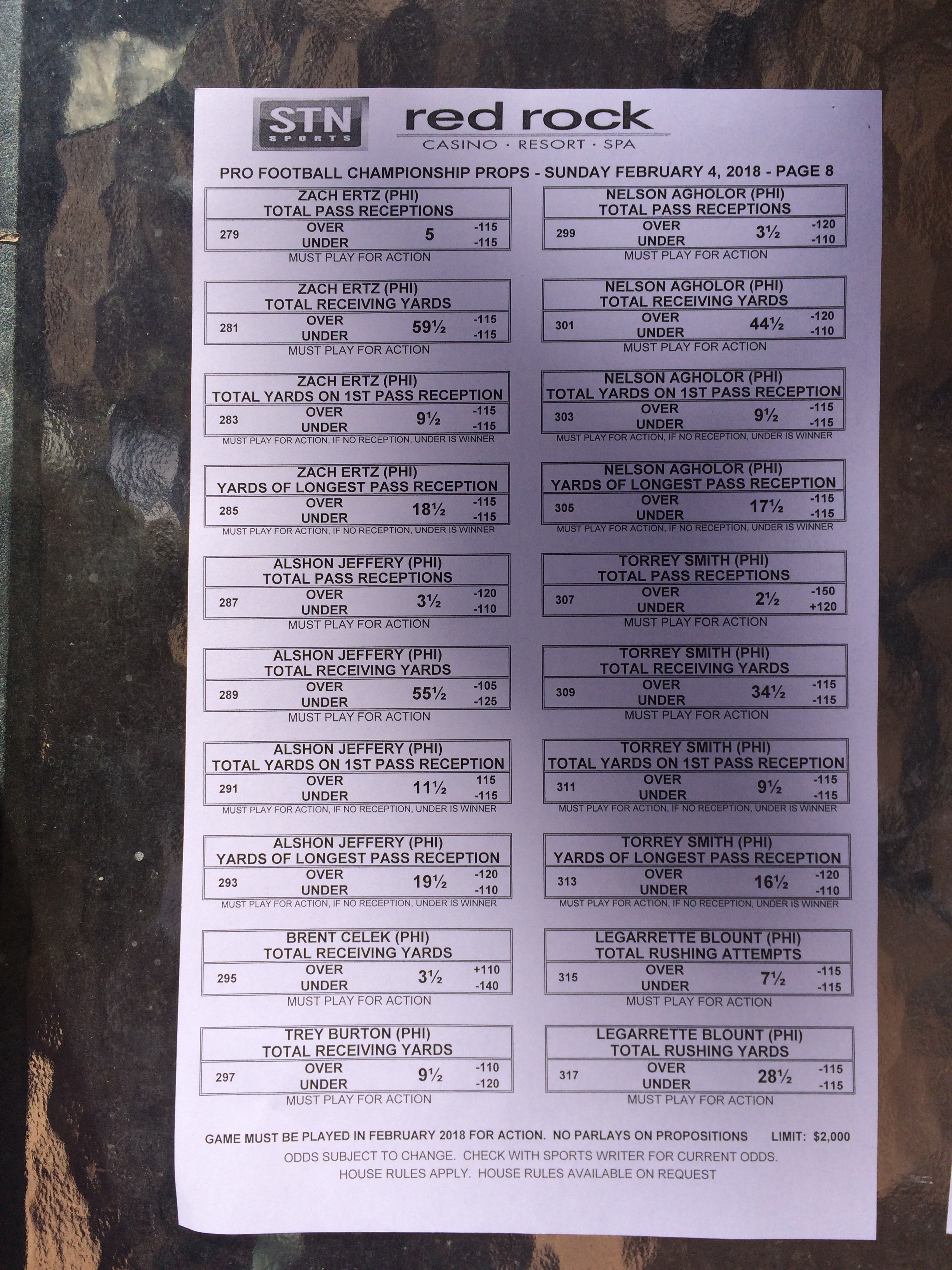 以下是拉斯维加斯几家体育博彩公司每页投注单的图片。这些表格收集于2018年1月27日,即比赛开始前八天。