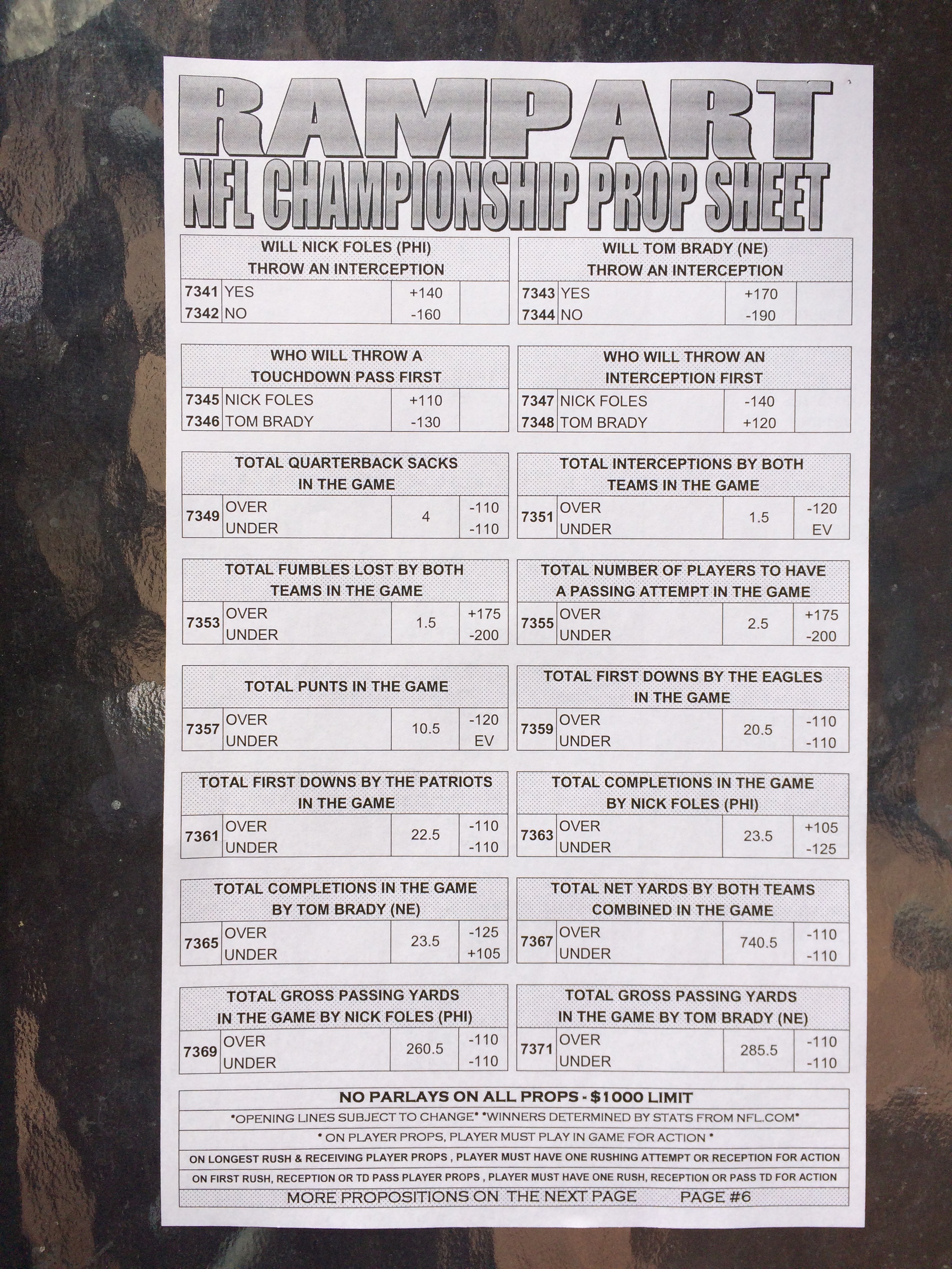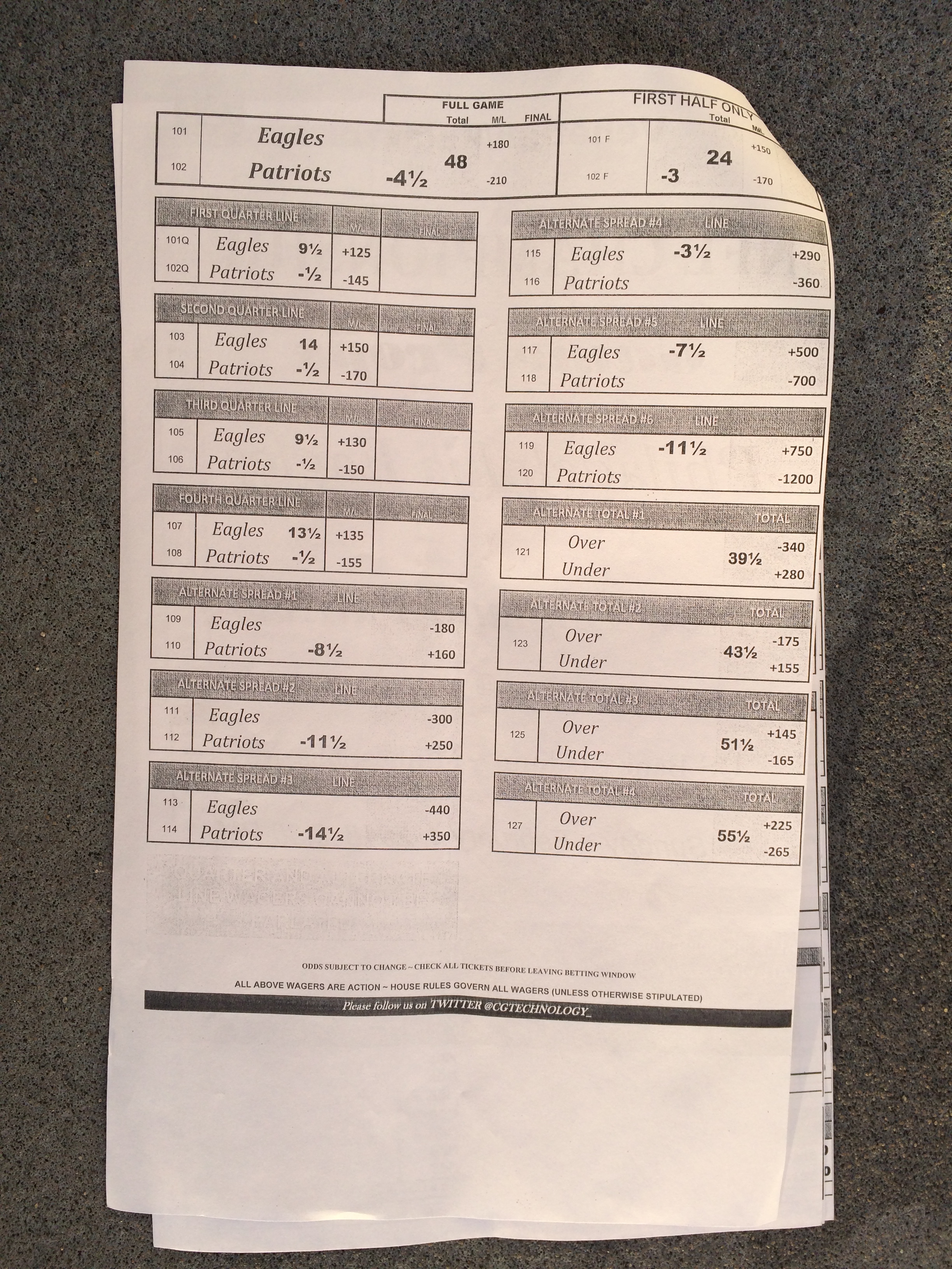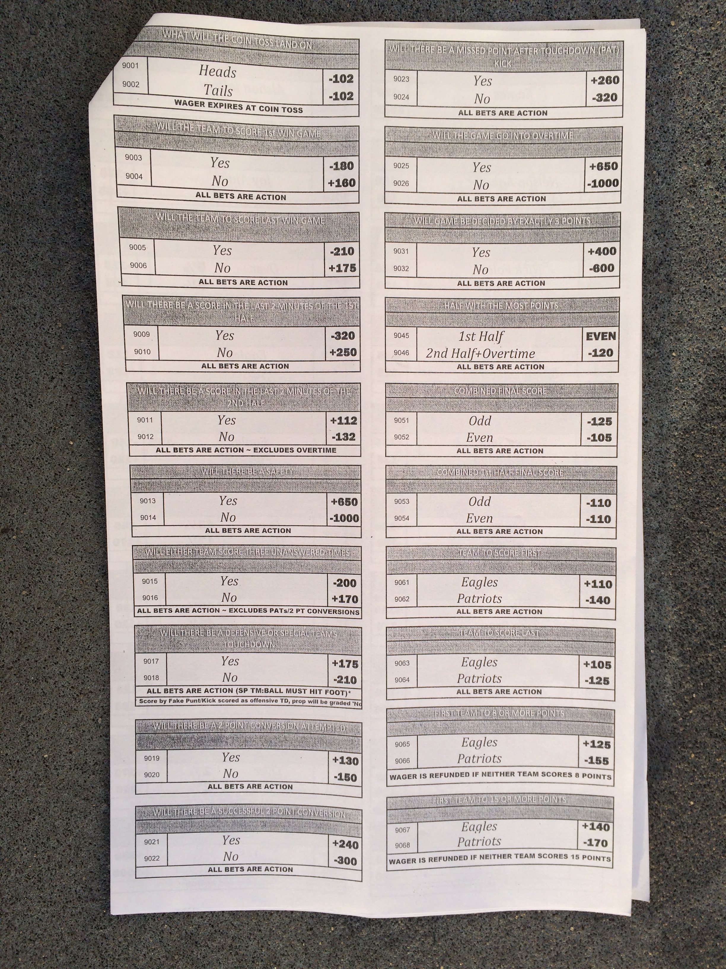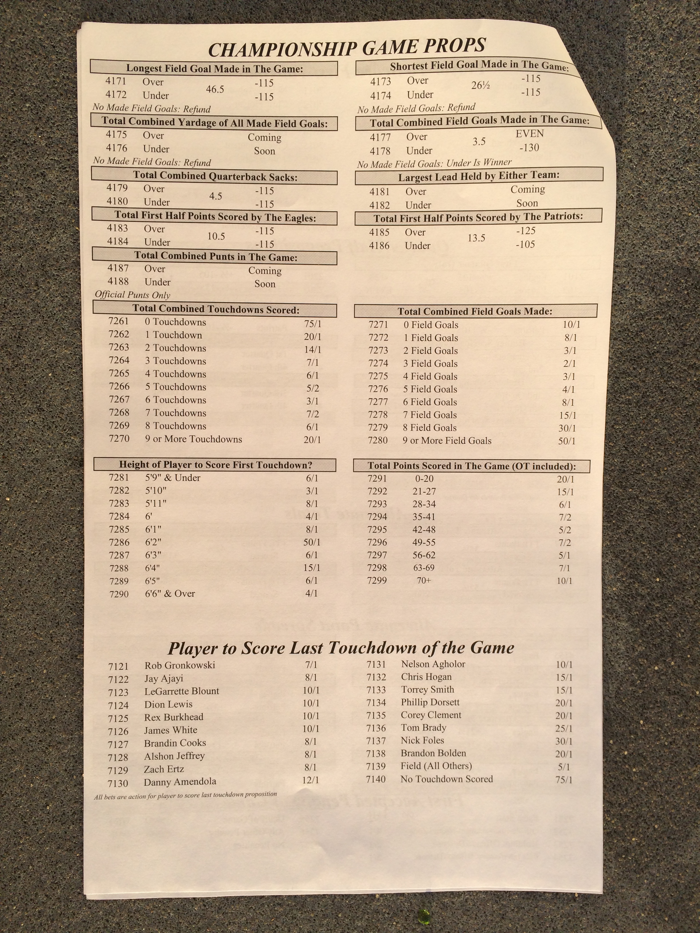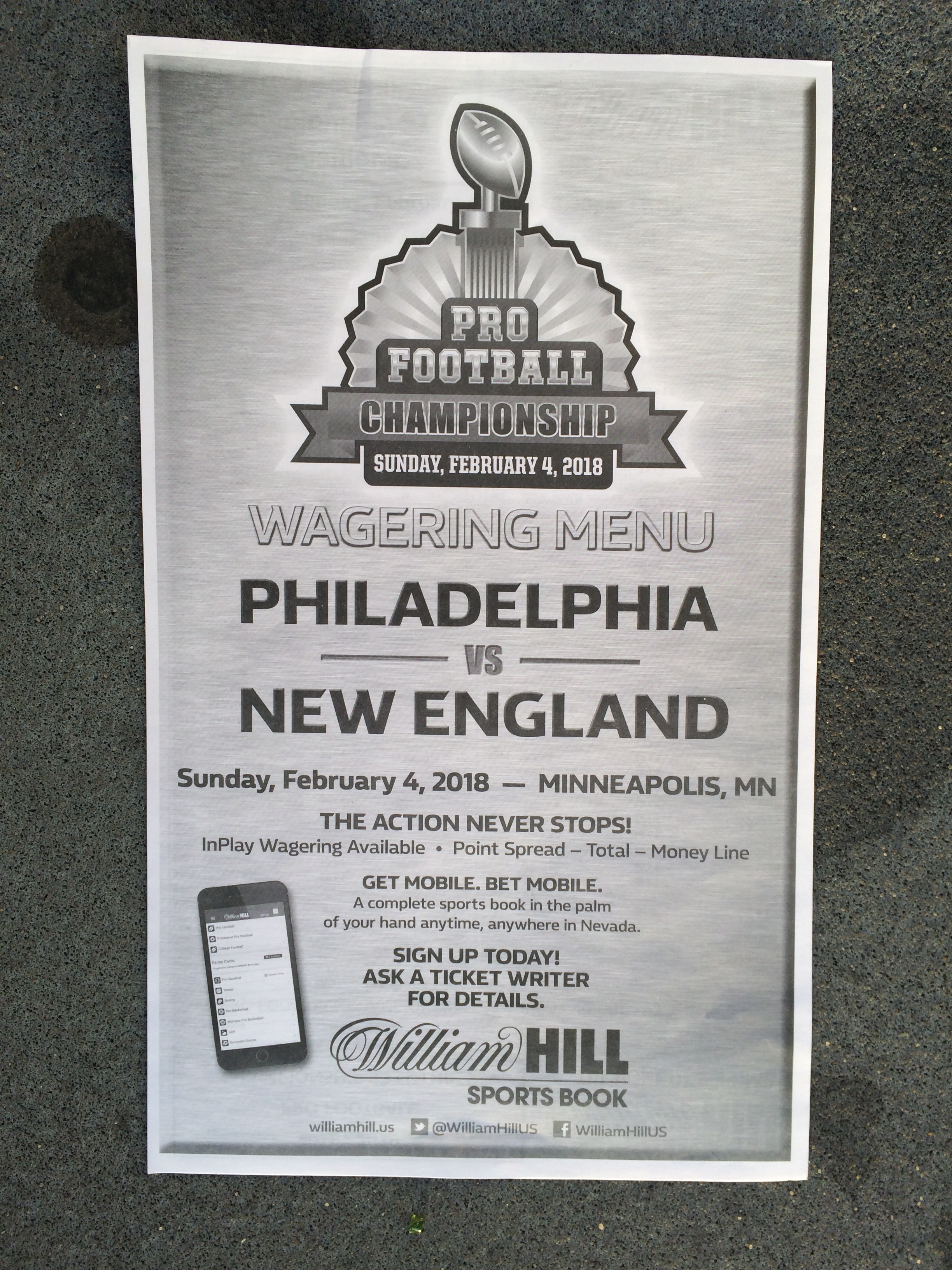 以下是拉斯维加斯几家体育博彩公司每页投注单的图片。这些表格收集于2018年1月27日,即比赛开始前八天。
