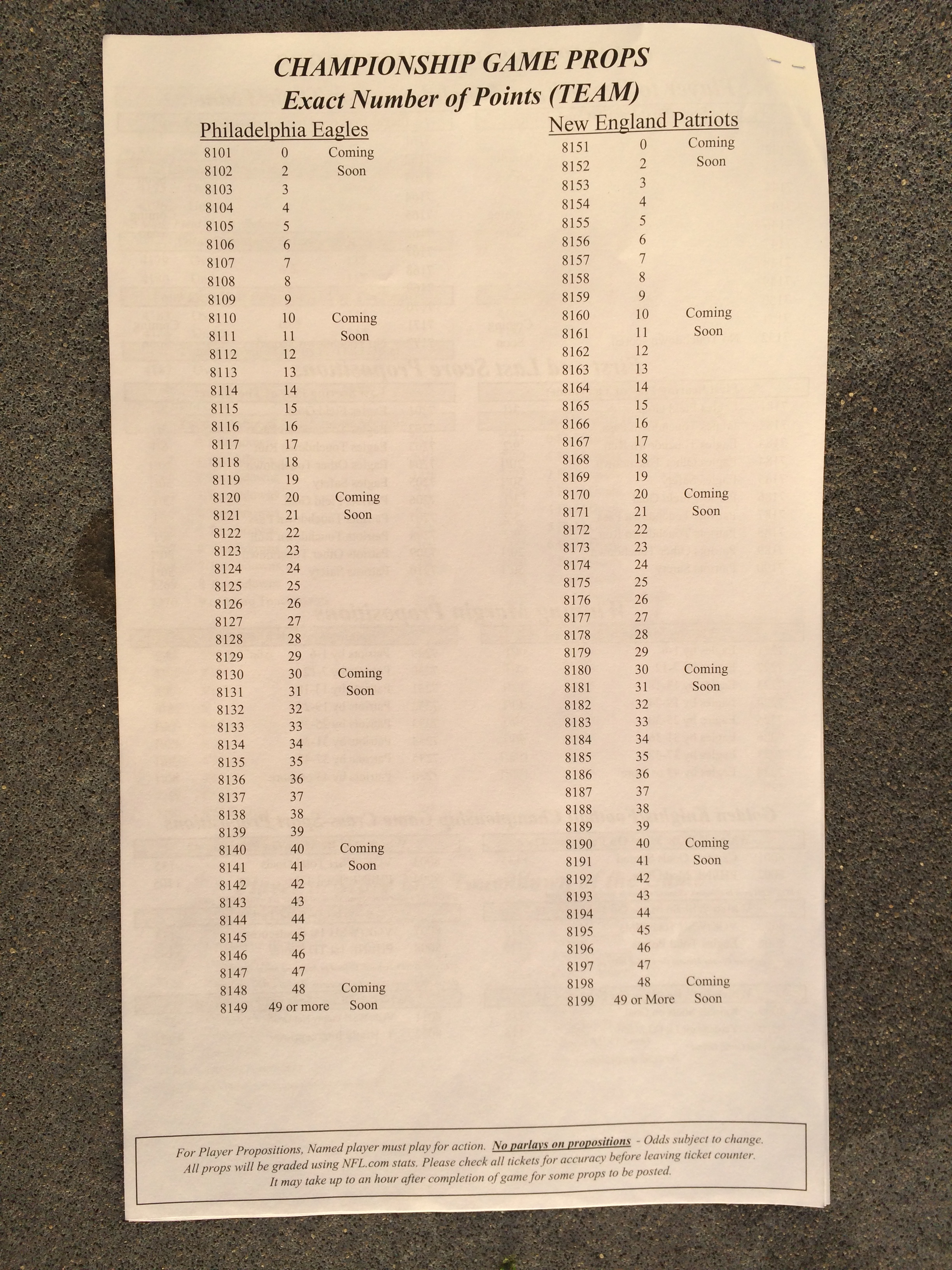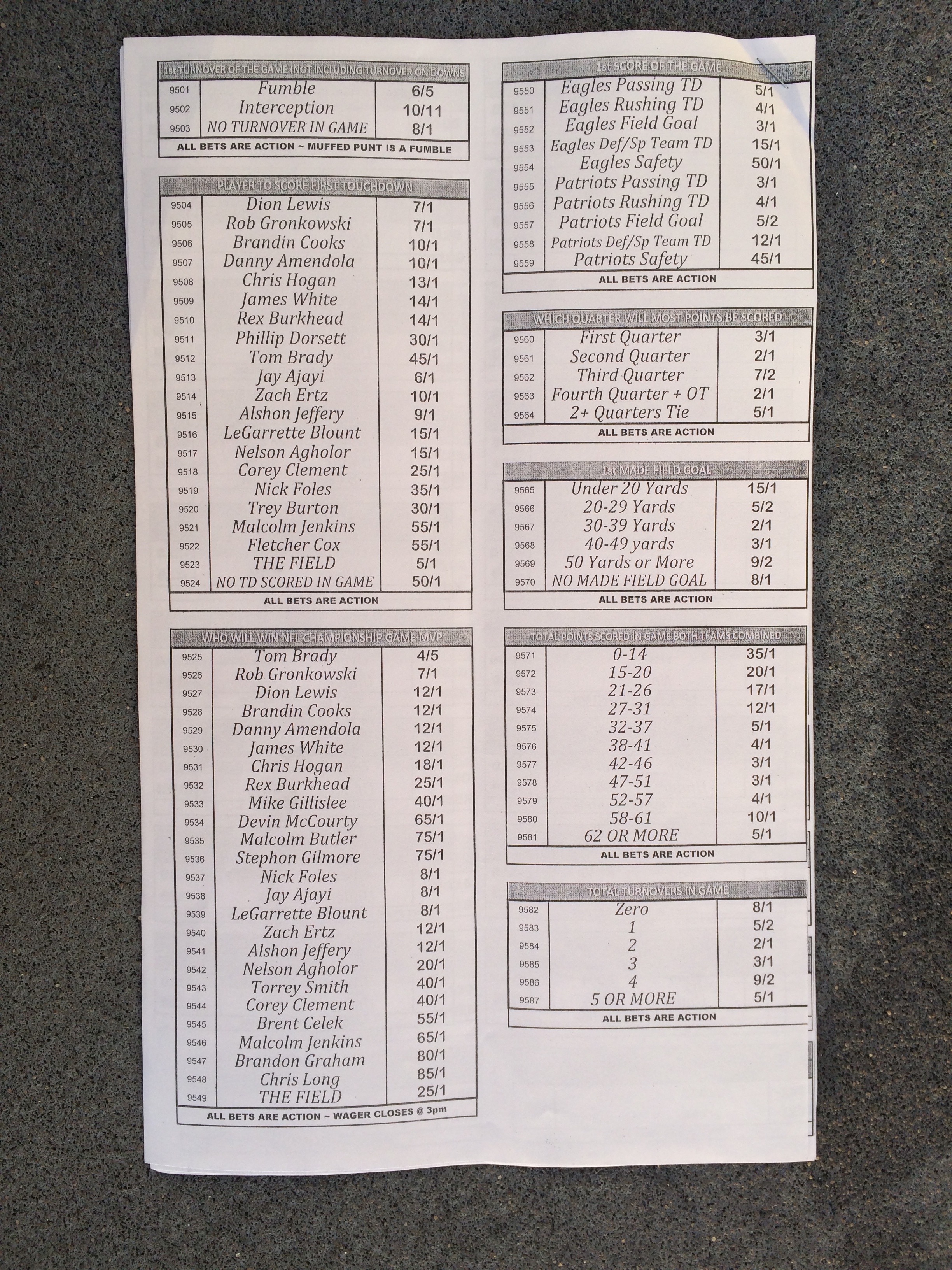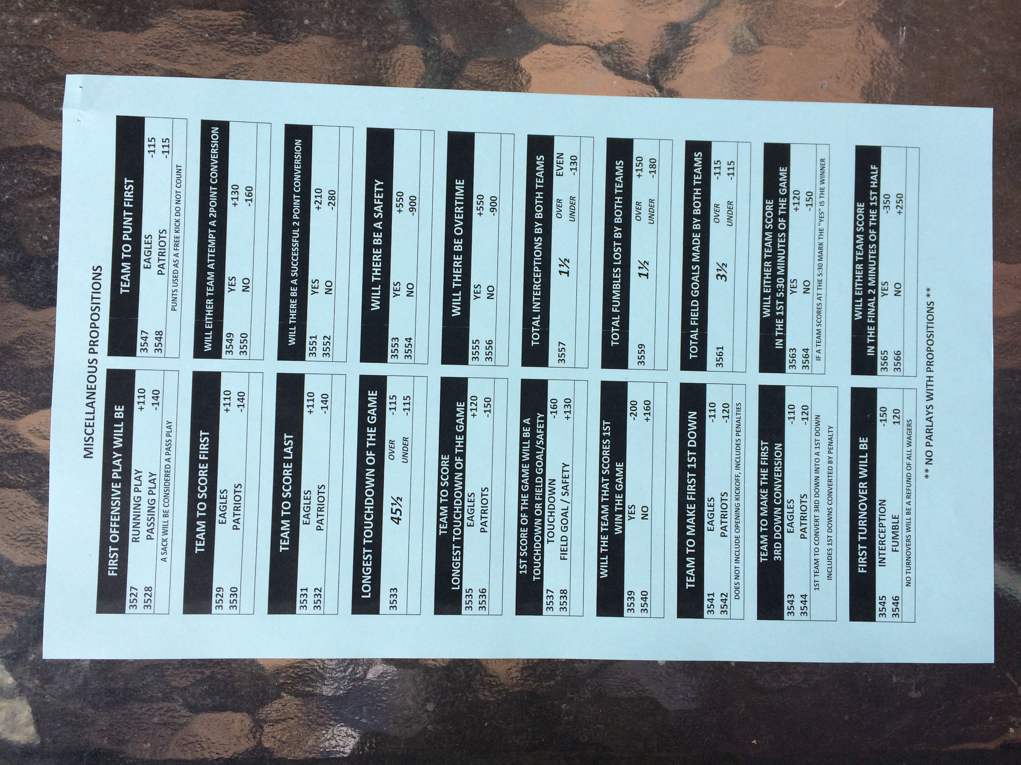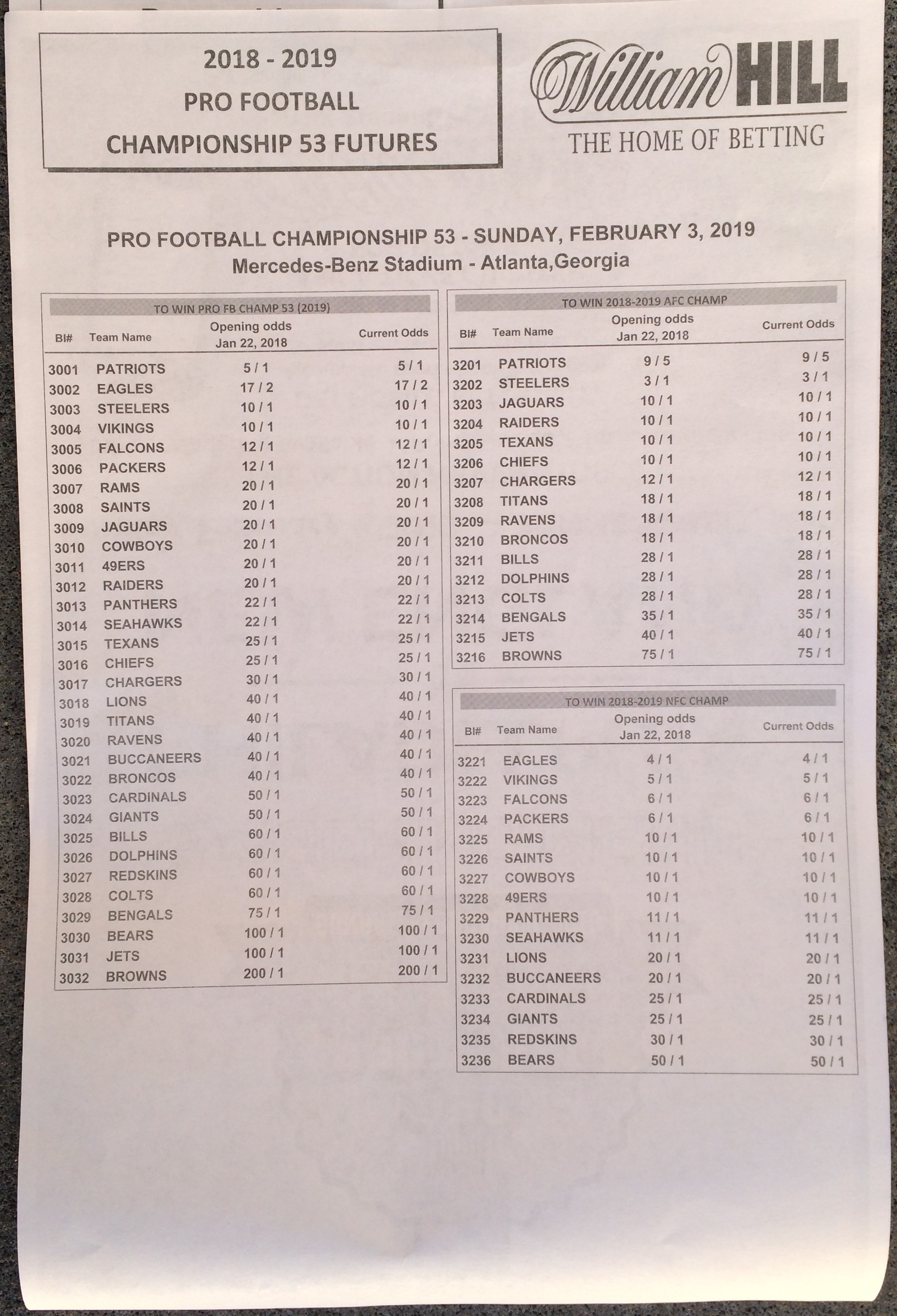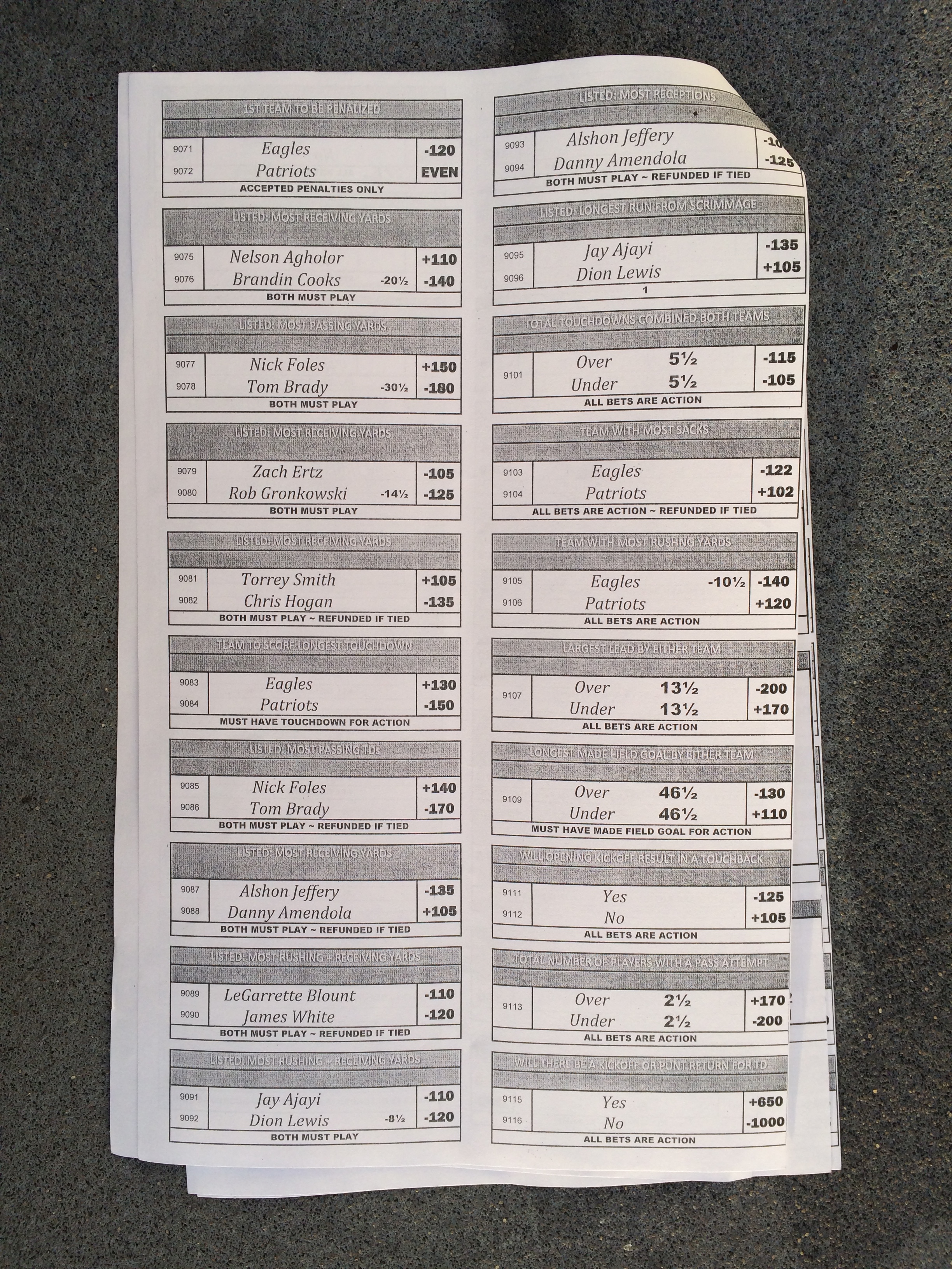以下是拉斯维加斯几家体育博彩公司每页投注单的图片。这些表格收集于2018年1月27日,即比赛开始前八天。