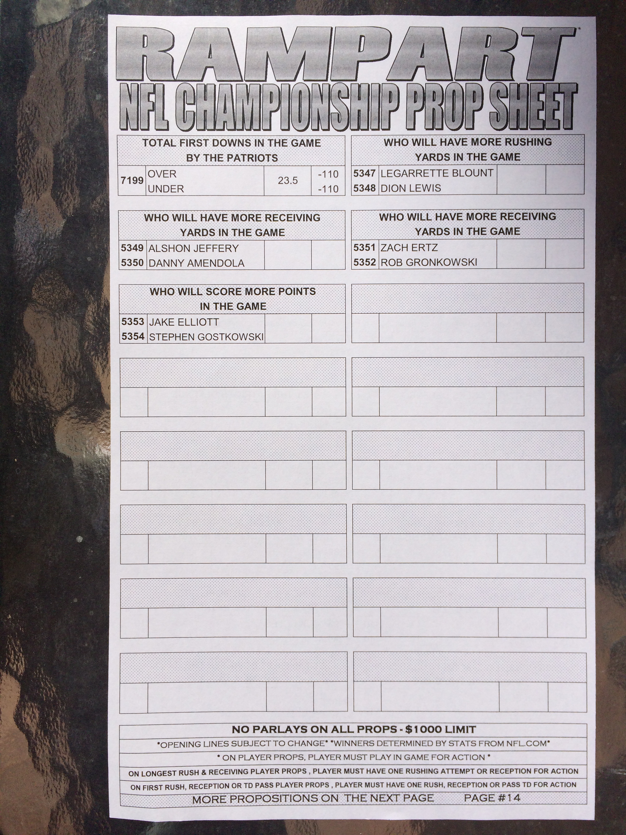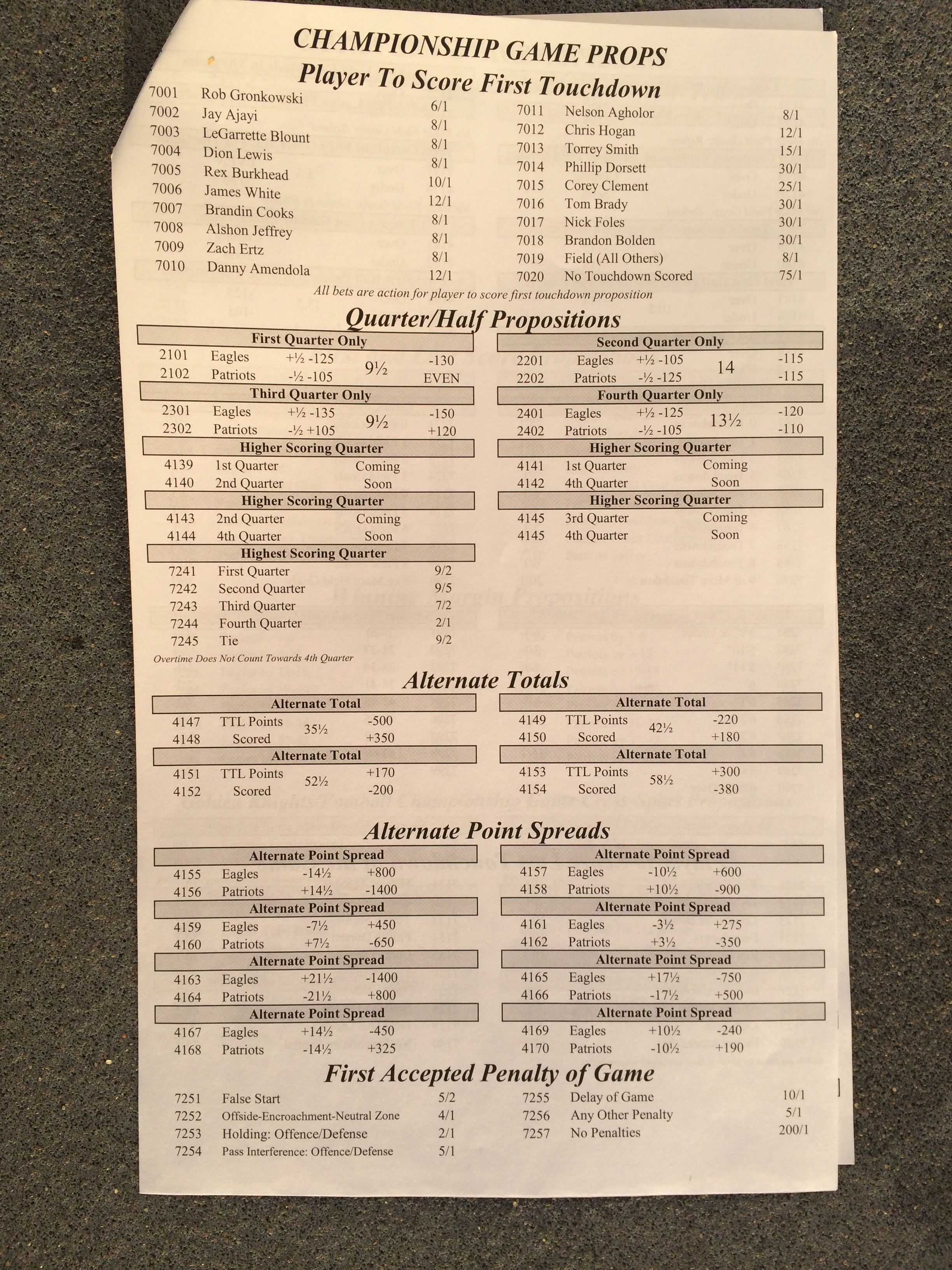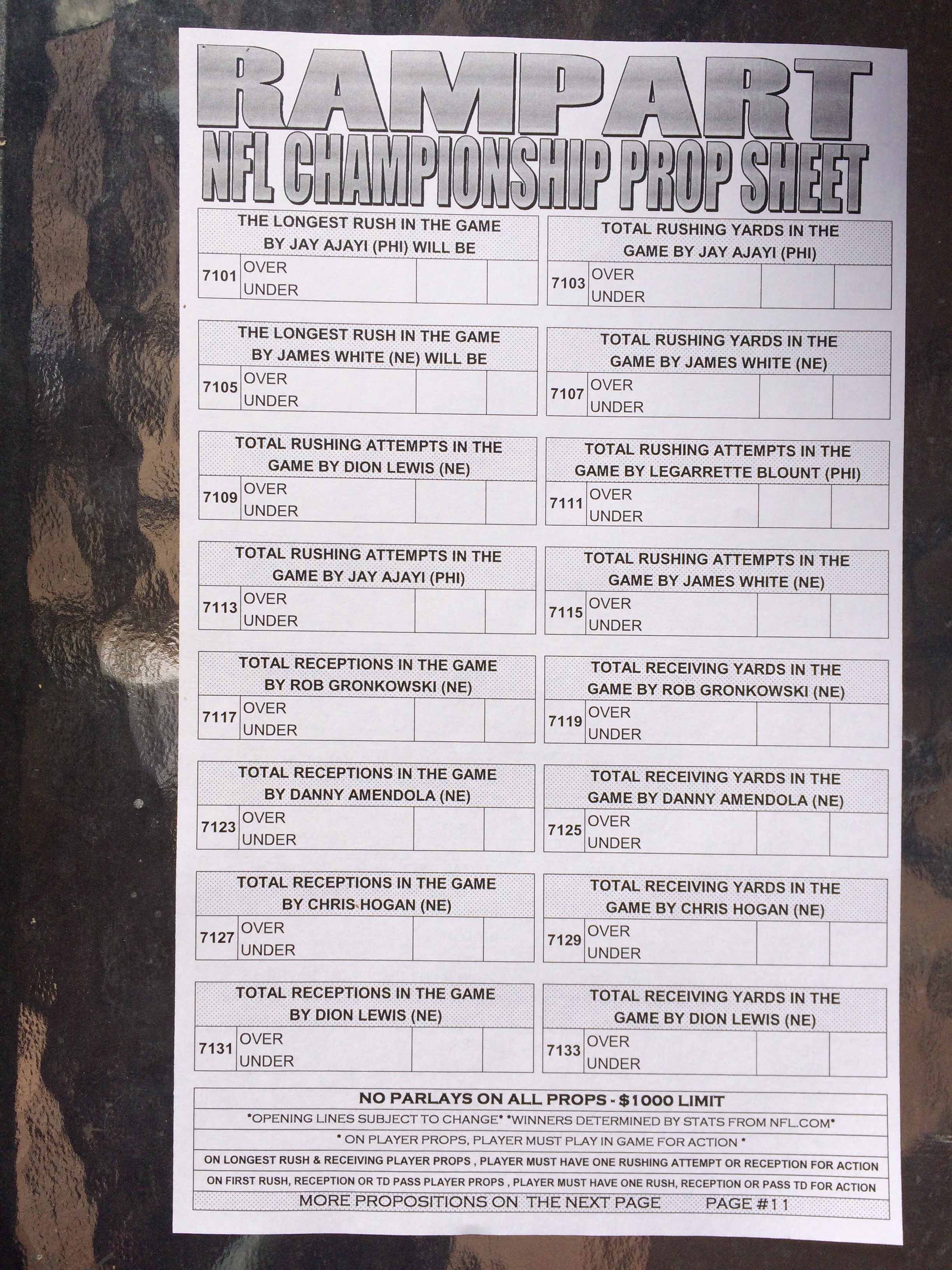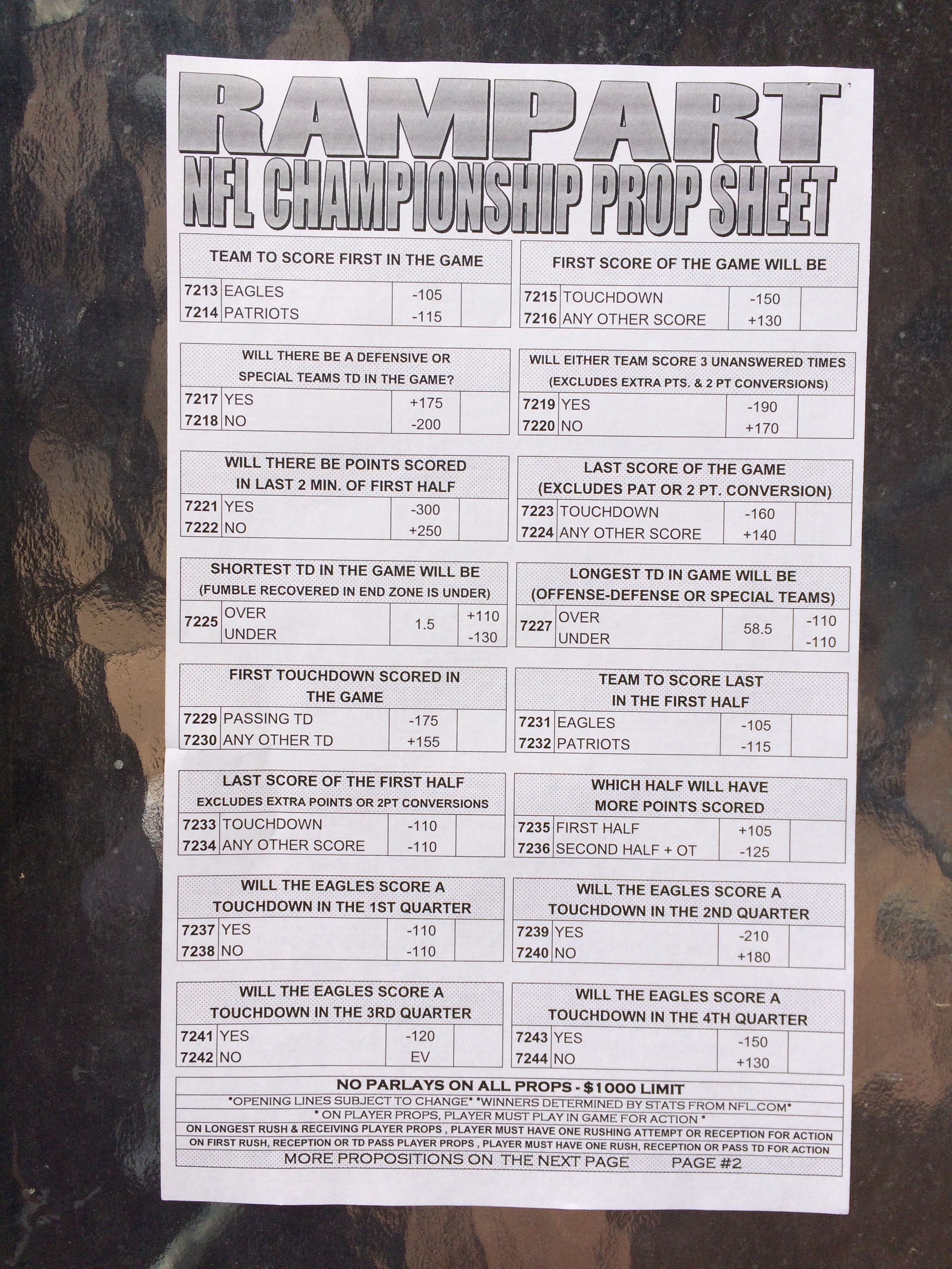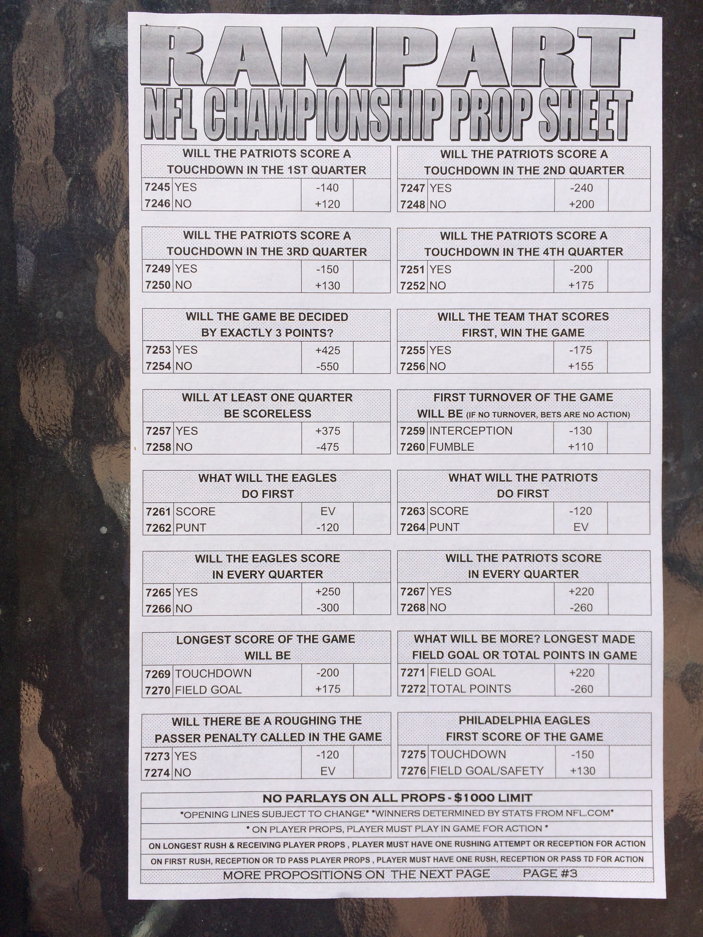 以下是拉斯维加斯几家体育博彩公司每页投注单的图片。这些表格收集于2018年1月27日,即比赛开始前八天。