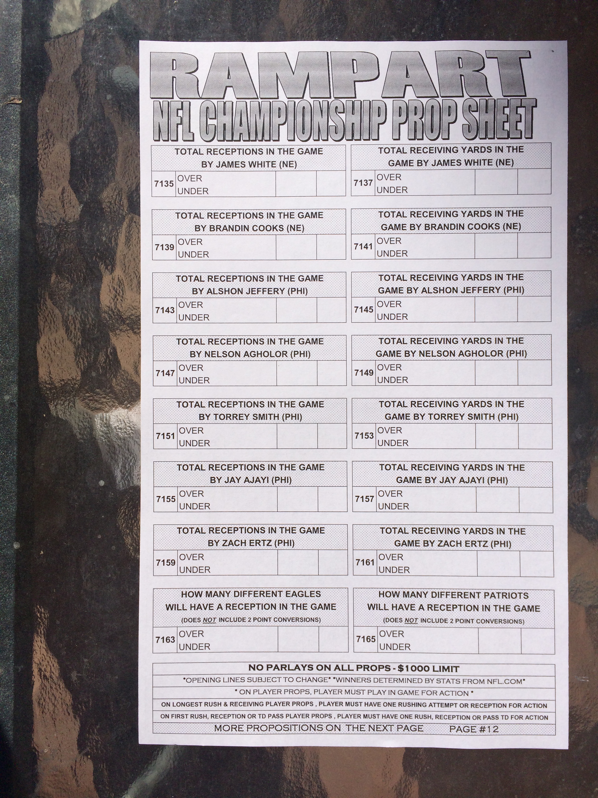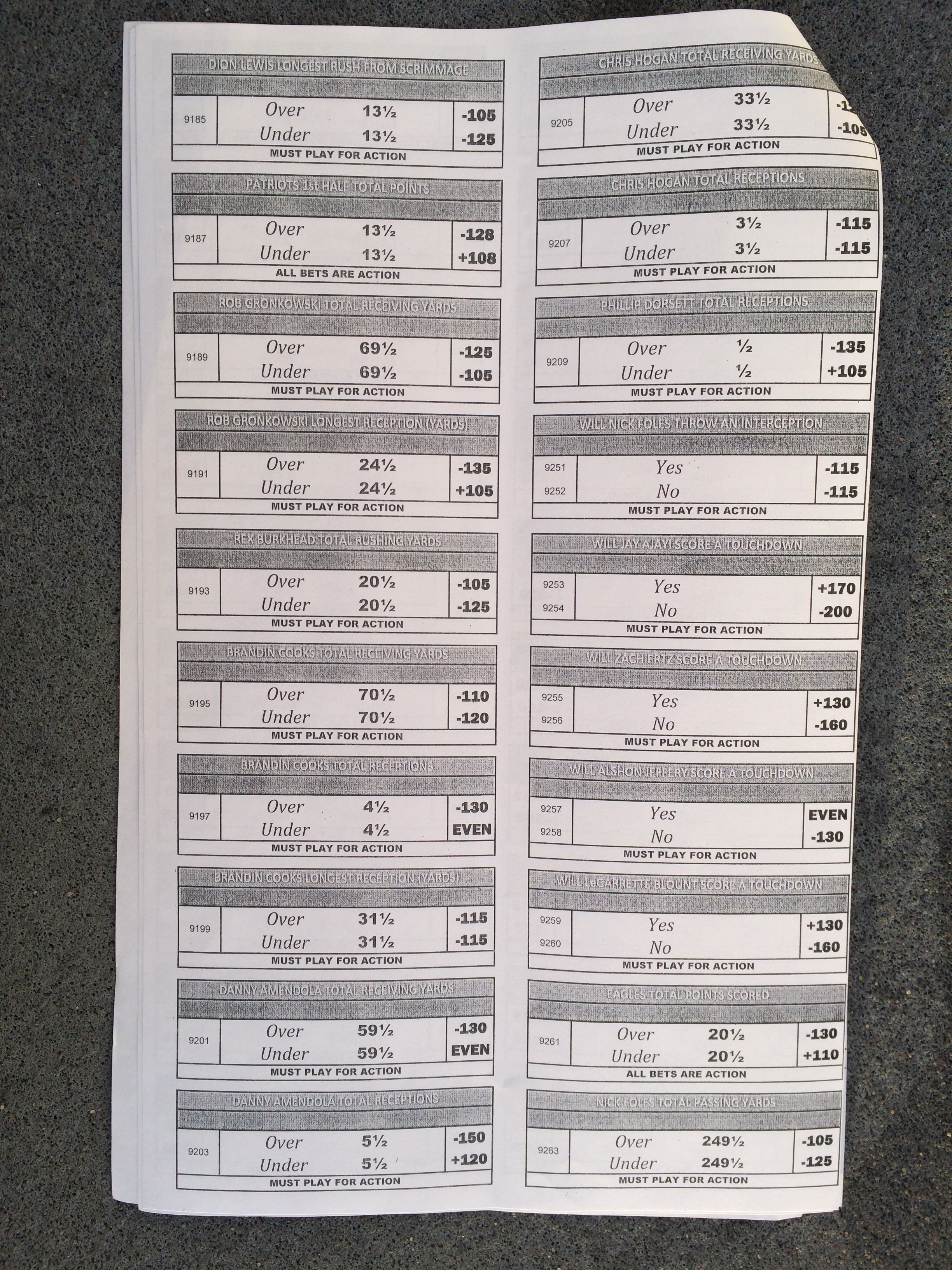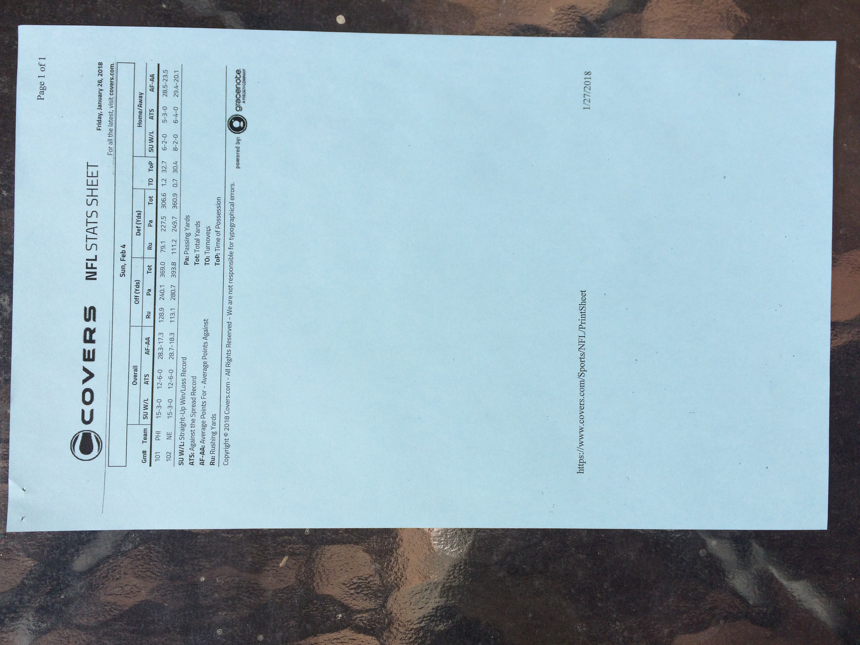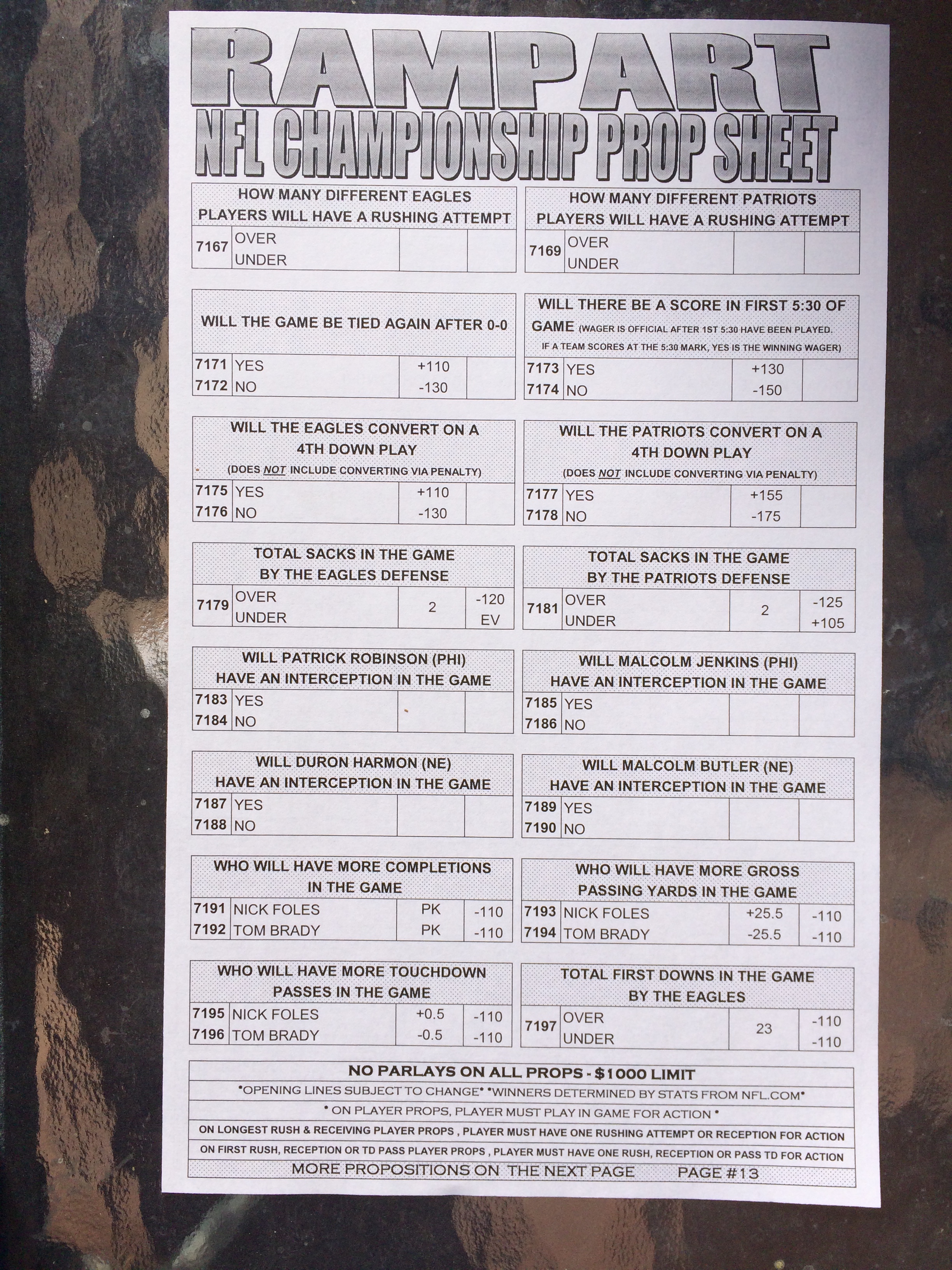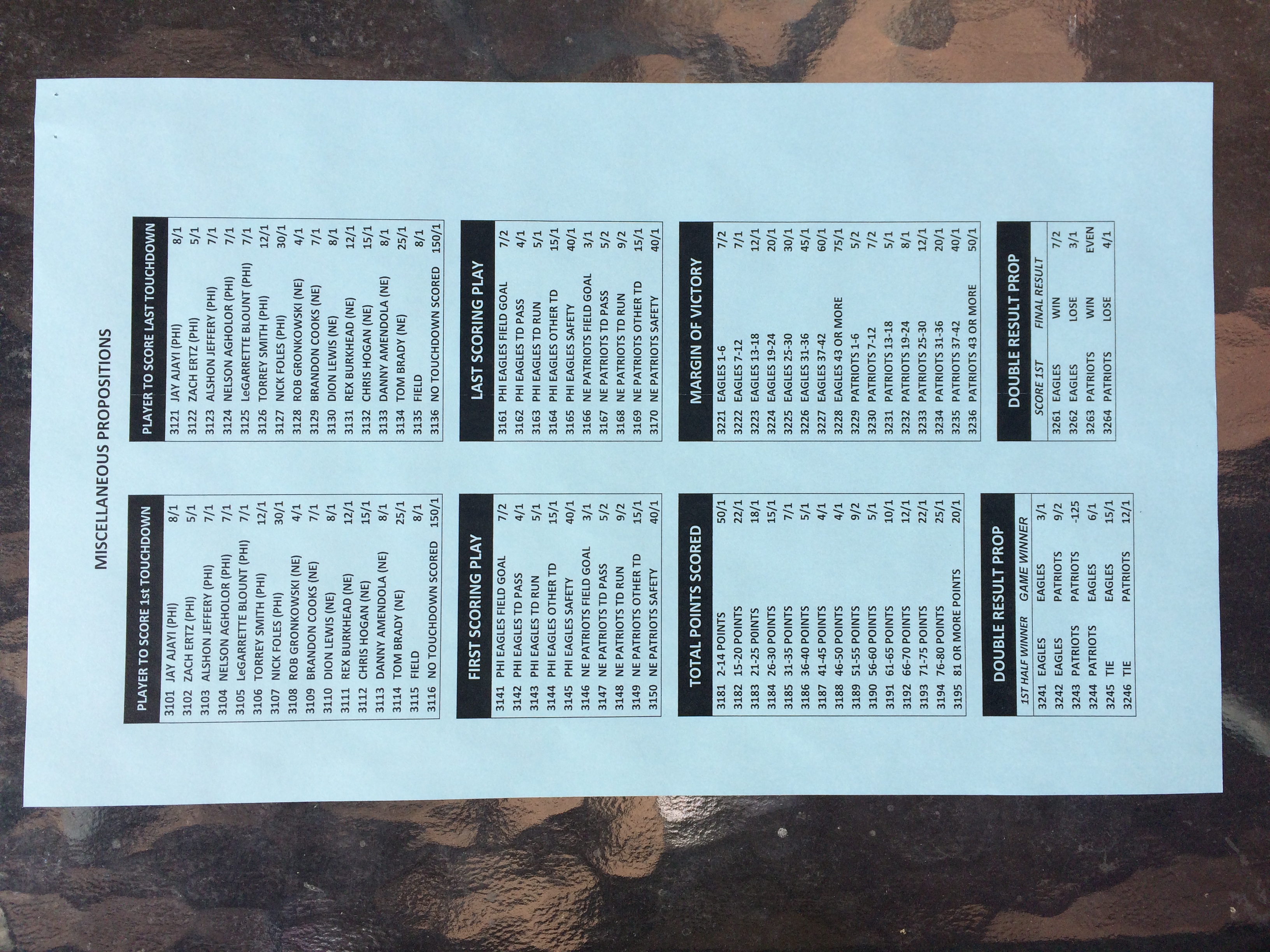 以下是拉斯维加斯几家体育博彩公司每页投注单的图片。这些表格收集于2018年1月27日,即比赛开始前八天。