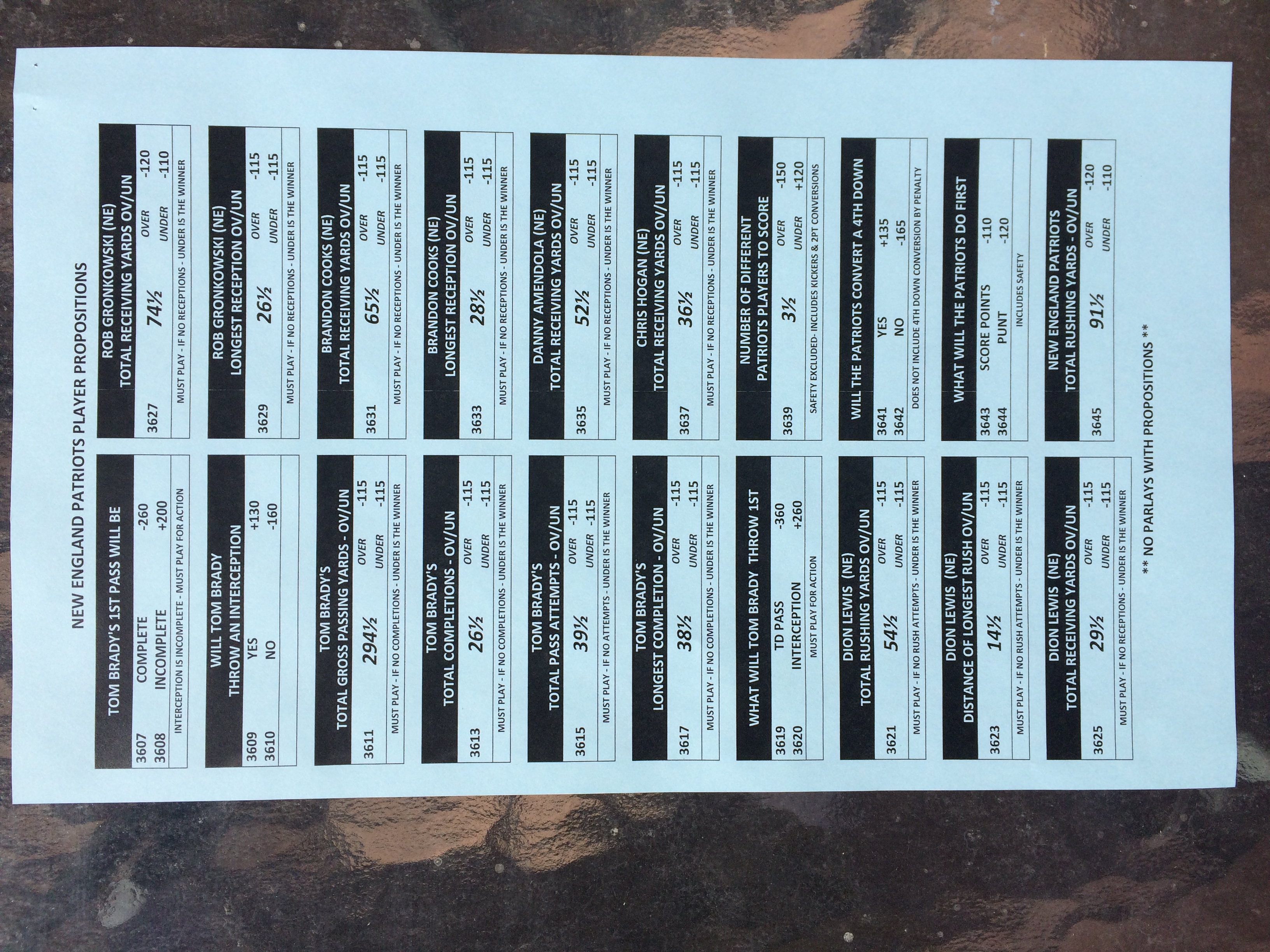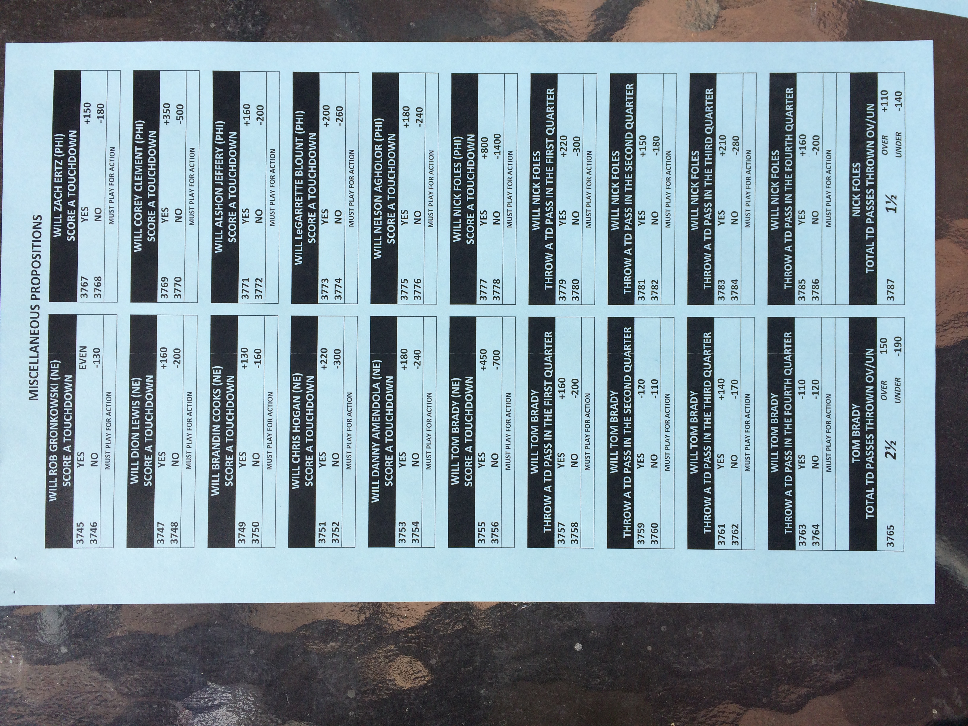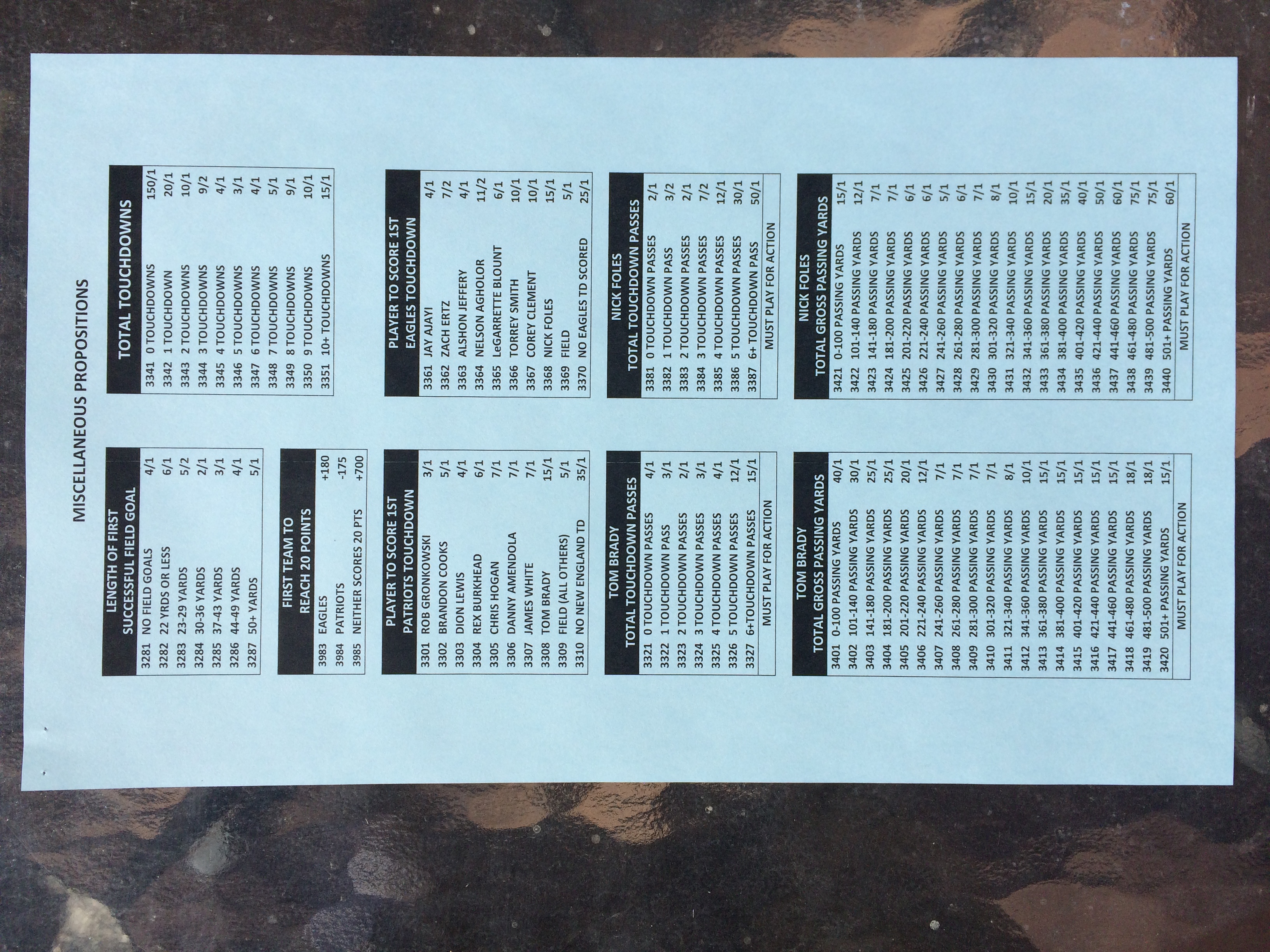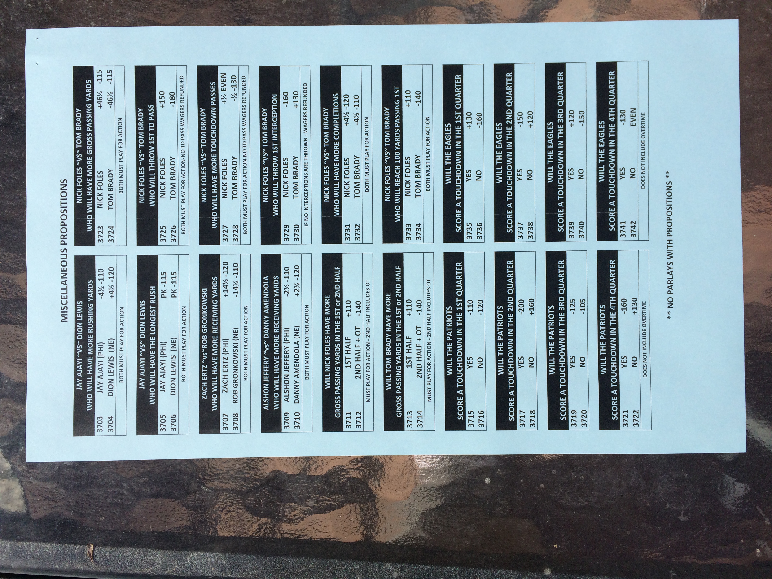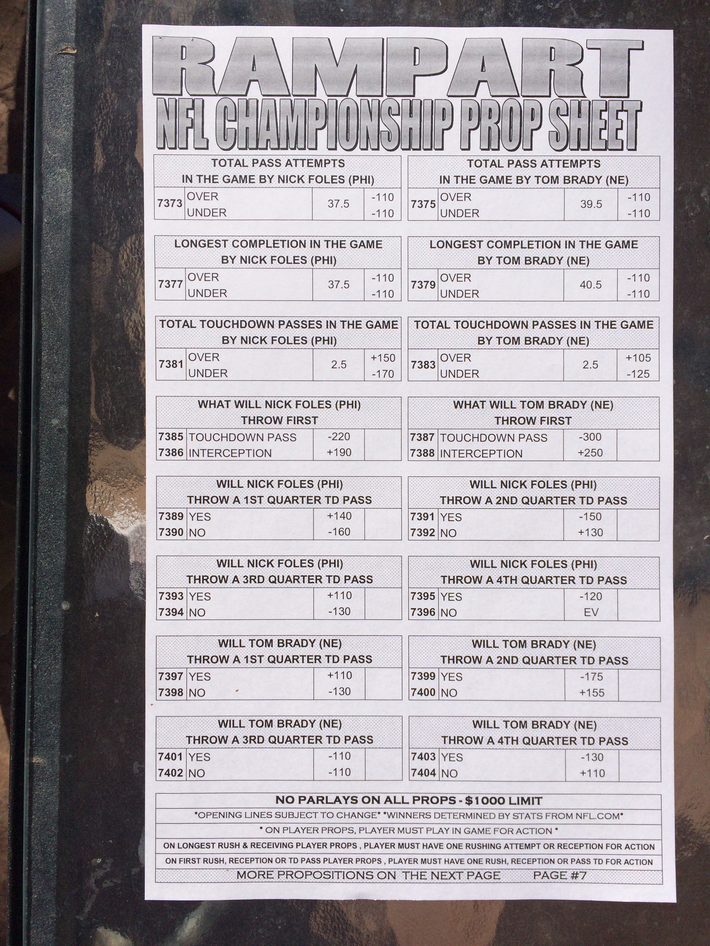 以下是拉斯维加斯几家体育博彩公司每页投注单的图片。这些表格收集于2018年1月27日,即比赛开始前八天。