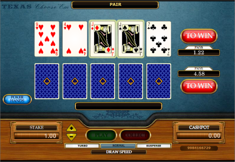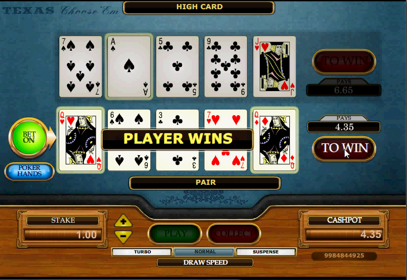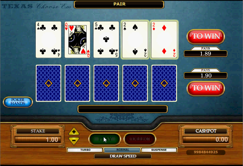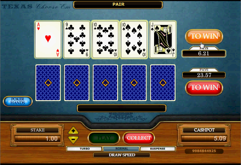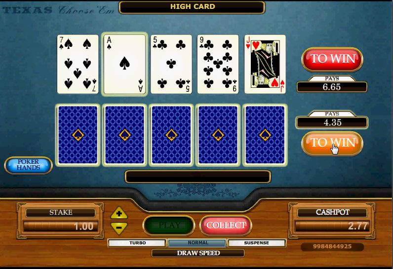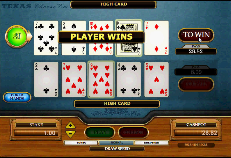 德州扑克“选我”(Texas Choose 'Em)是一款简单的扑克游戏,由龙鱼公司(Dragon Fish)开发,该公司为互联网赌场提供游戏。游戏玩法很简单——随机显示一手五张牌的扑克牌。玩家可以押注另一手牌的点数会高于或低于这手牌。每次下注的赔率与获胜概率成正比。