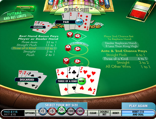三张牌第二次机会是一款基于扑克的游戏,由我发明并获得专利(专利号7,735,830 )。“最佳牌型奖励”的附加投注是 WagerWorks 的创意。三张牌第二次机会遵循与五张牌版本“五张牌穆里根扑克”相同的结构,后者自 2007 年 5 月起在 Odds On 互联网赌场推出。游戏的核心是,如果玩家不喜欢自己的第一手牌,只需增加赌注即可将其换成第二手牌。荷官在某些情况下也可以更换自己的牌型。之后,牌型较高的玩家获胜,所有获胜的玩家至少获得等额赔付。WagerWorks 拥有独家授权,是互联网赌场提供三张牌第二次机会的唯一提供商。我很乐意听到任何“实体”赌场有兴趣提供这款游戏的消息。