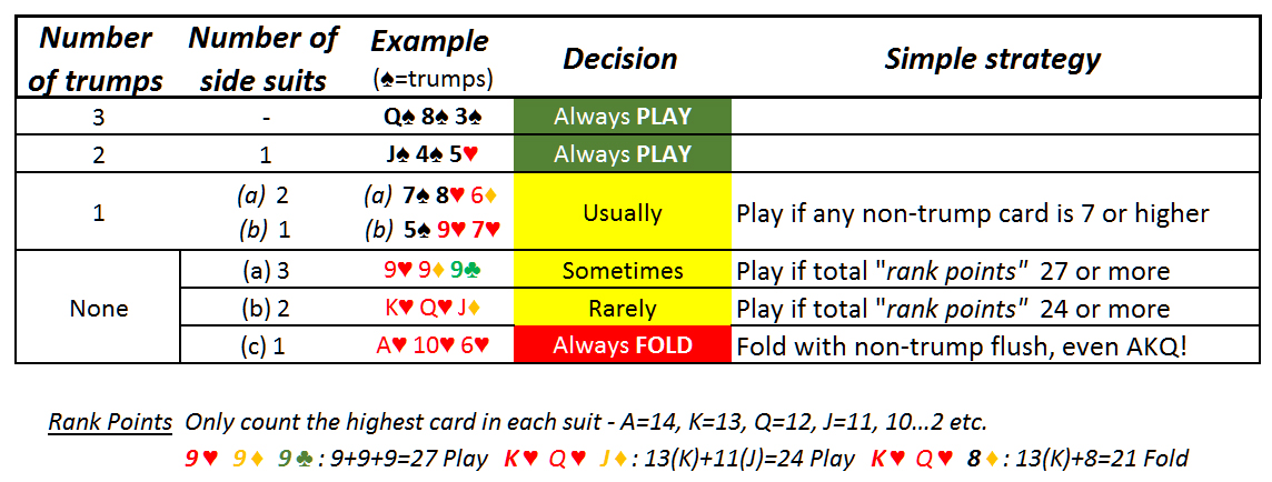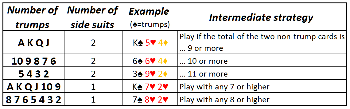 - 1 张王牌 — 使用中等大小的非王牌牌进行打牌通常是正确的;但是使用小牌时要弃牌。