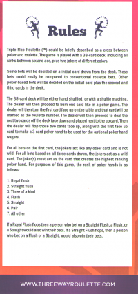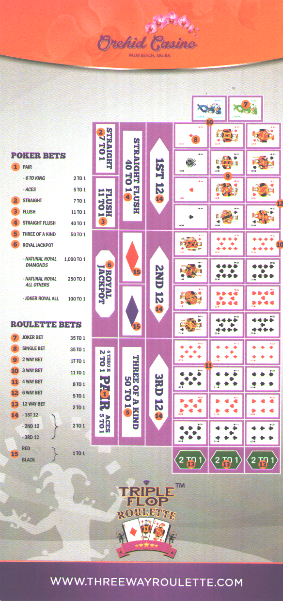 三重翻牌轮盘赌是扑克和轮盘赌的结合体。它原本是为加州和俄克拉荷马州等市场设计的,因为在这些地区,用轮盘玩轮盘赌是违法的。然而,它却在阿鲁巴岛的兰花赌场找到了一席之地。