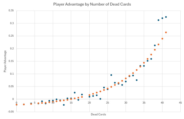 当这个话题出现在我在“拉斯维加斯巫师”论坛上时,论坛的“mental mental”(他更喜欢被称为“mental block”)做出了一些杰出的贡献。他编写了自己的模拟器,但测试了1到43张死牌的影响。下图总结了他的结果。