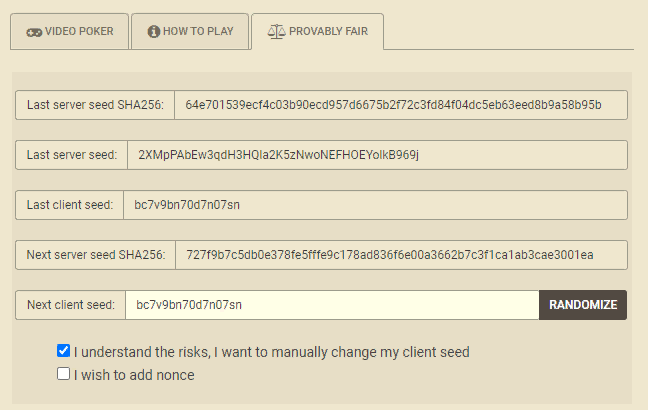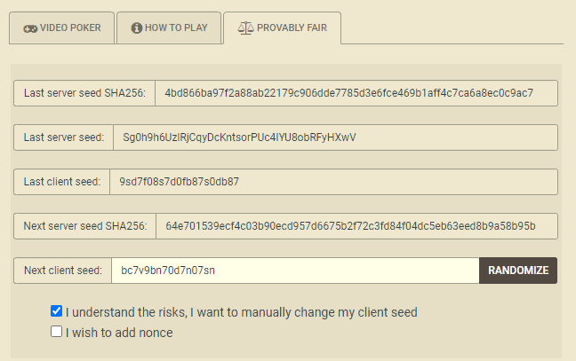 这种版本的视频扑克似乎只在加密货币在线赌场中玩。简而言之,游戏会从0到51之间找到10个唯一的随机数,每个数的概率为1/52,并将它们映射到牌堆中的十张牌上。前五个随机数决定玩家在发牌时会拿到的牌,后五个随机数决定玩家在抽牌时按顺序拿到的牌。例如,如果玩家弃掉两张牌,那么他将在抽牌时拿到牌表中的第6张和第7张牌。弃牌的位置无关紧要。