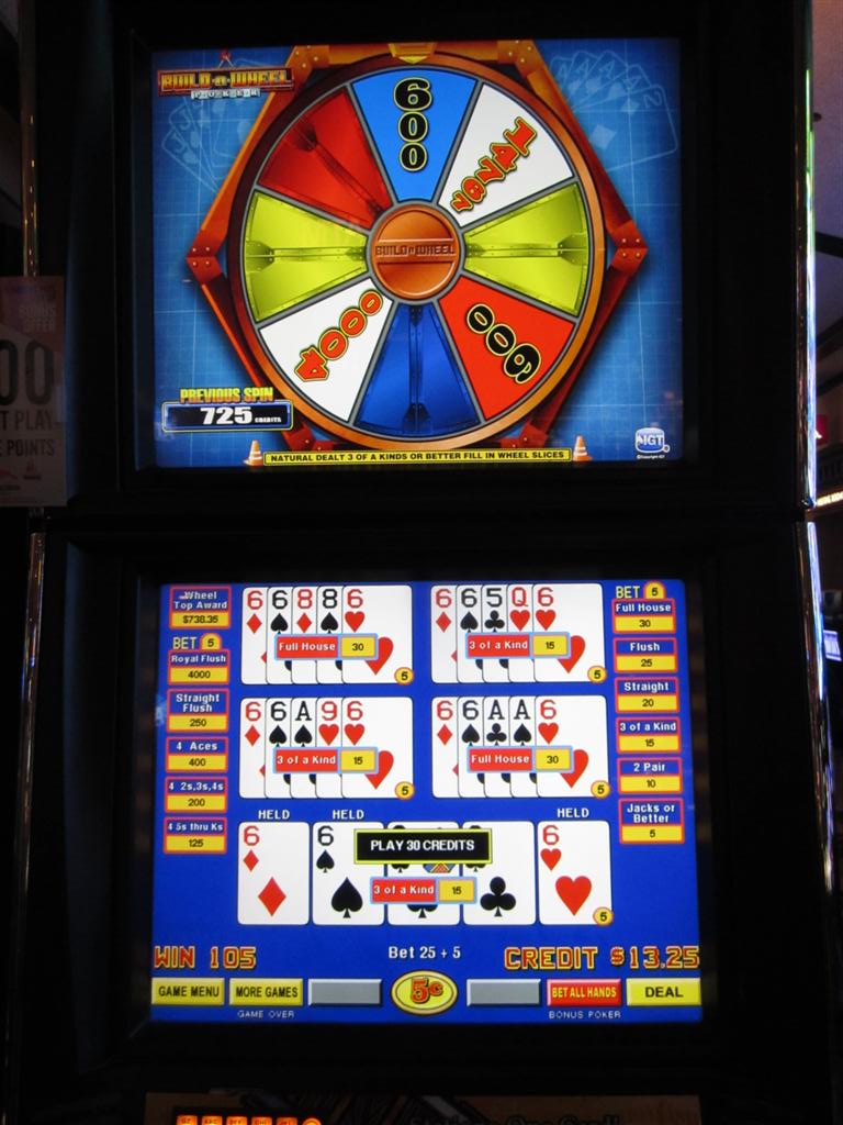 2011年12月,我第一次在红岩赌场和皇宫站赌场看到“造轮盘”这款视频扑克游戏。和“轮盘扑克”类似,玩家如果额外下注,偶尔有机会旋转一个奖品轮盘。然而,与其他类似的奖品轮盘游戏不同的是,在“造轮盘”游戏中,玩家每次拿到三张同点牌或更好的牌时,都要自己填满牌片。当轮盘满了,玩家就可以旋转它了。规则
