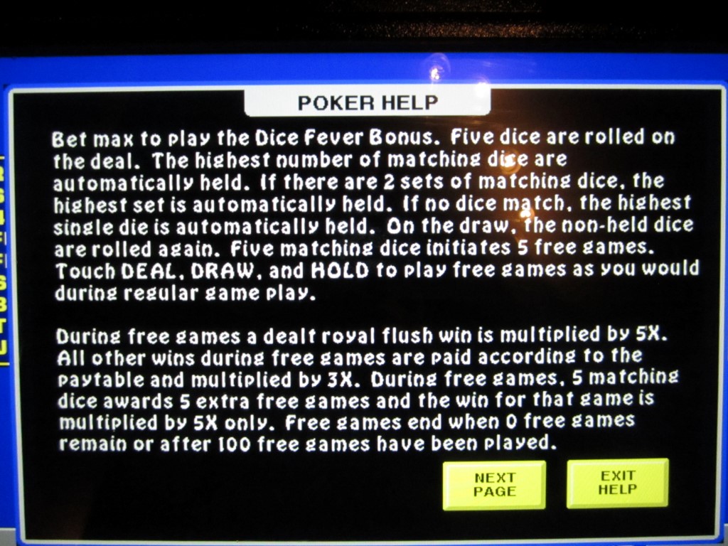 2014年3月,我在拉斯维加斯的一家酒吧里发现了一款名为“Dice Fever”的视频扑克游戏。它的玩法和普通的视频扑克类似,只是增加了一个奖励功能。玩家只需花费六分之一硬币,就有机会赢得免费游戏奖励。如果玩家在两次投掷中用五个骰子凑成五点同花,即可获得奖励。