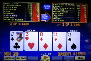 在上面这手牌中,我在两张赔率表上都拿到了三条。在左侧的 Bonus Poker Deluxe 赔率表上,我赢得了 15 个硬币。在右侧的 Deuces Wild 赔率表上,我赢得了 5 个硬币。总奖金为 15 + 5 = 20 个硬币。