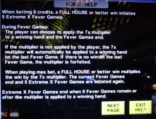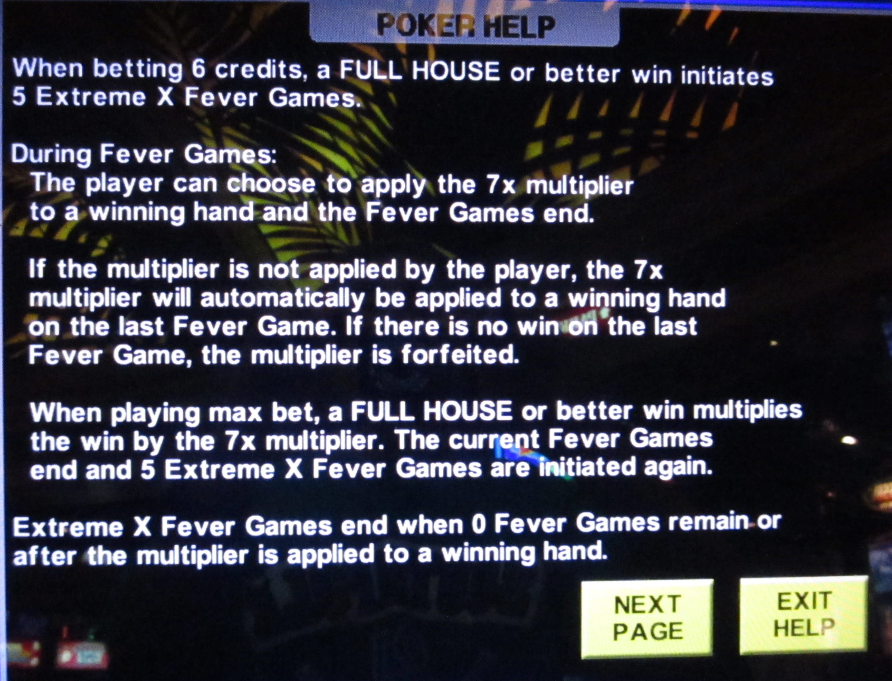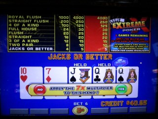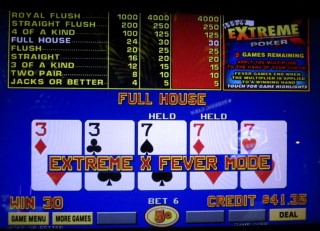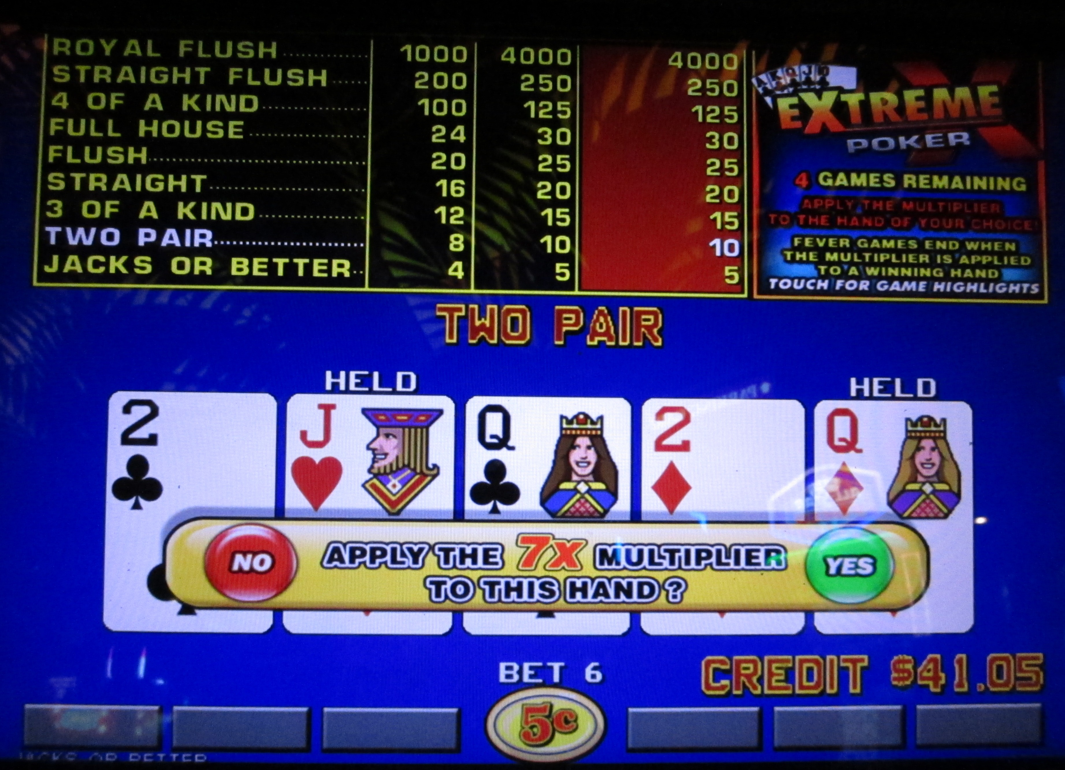 Extreme X Poker 是 IGT 推出的一款视频扑克游戏,在抽牌时出现任何葫芦或更好的牌后,玩家将获得基于乘数的奖励。获得奖励后,玩家有五场“狂热游戏”来接受乘数。无论是在微弱的胜率下接受加成,还是在五场狂热游戏结束前争取更大的胜率,这都是一个非常有趣的策略。