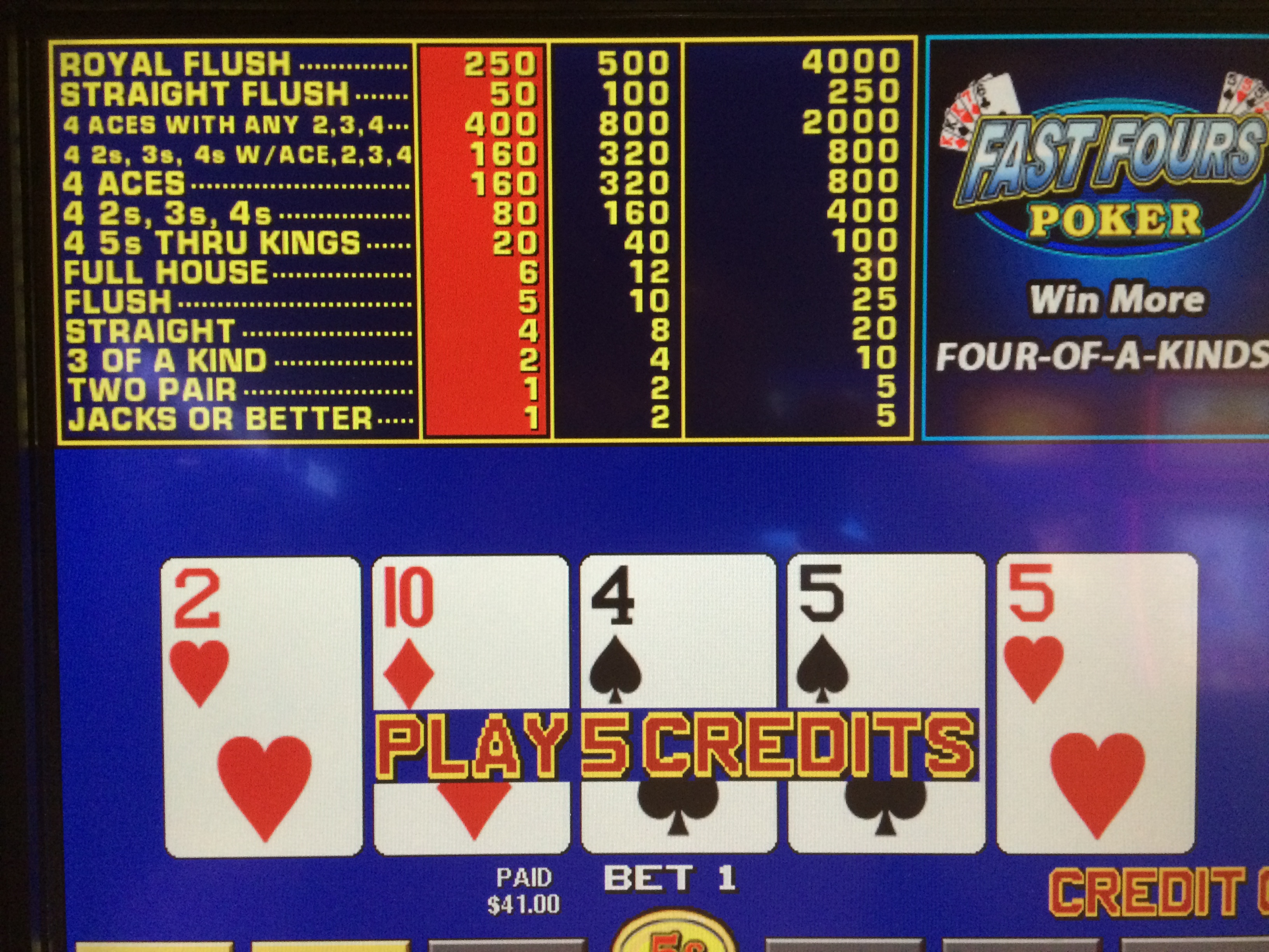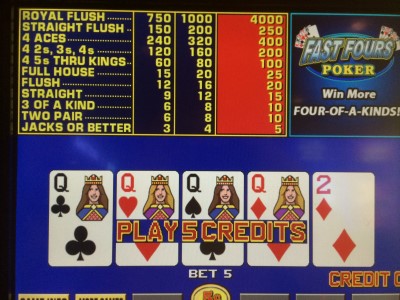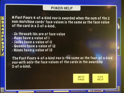 Fast Fours 是我在 2016 年 4 月 5 日在拉斯维加斯硬石酒店 (Hard Rock) 发现的一种视频扑克游戏。当时是在一台老机器上玩的,所以我推测这个游戏已经存在一段时间了,只是之前不知何故被我忽略了。这个游戏的亮点很像Quick Quads :如果玩家有三张同点牌,比如 8-8-8-5-3,并且两张单张牌的总点数等于三张同点牌的点数,那么就算是四张同点牌。和 Quick Quads 一样,A 算作 1 分,2-10 算作点值。与 Quick Quads 不同的是,人头牌也起着重要作用。具体来说,J 算作 11 分,Q 算作 12 分,K 算作 13 分。所以,2JKKK 算作四个 K。另一个区别是,在 Fast Fours 中,玩家不需要下注第六个硬币来激活该功能。玩家可以通过按下支付表来支付。