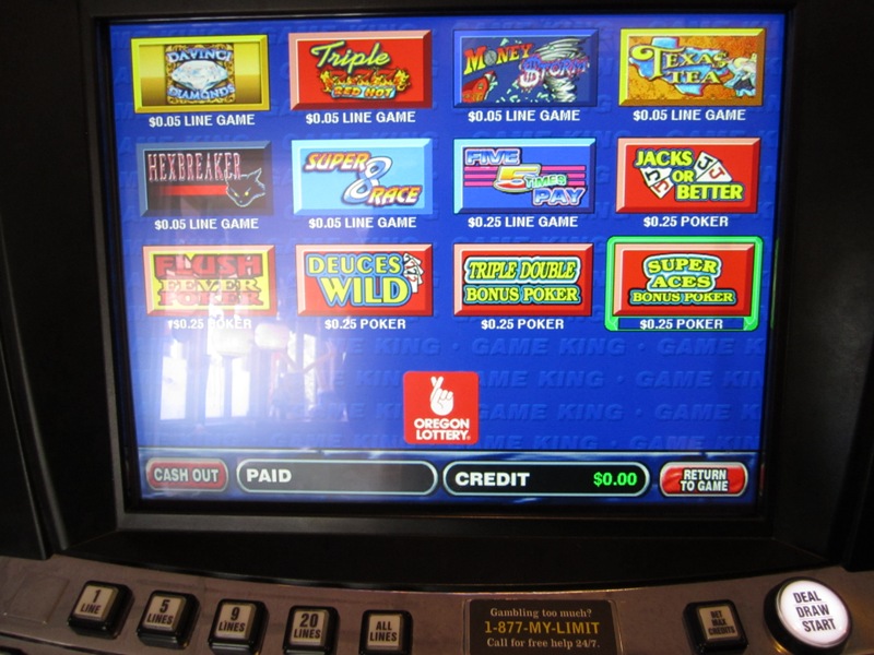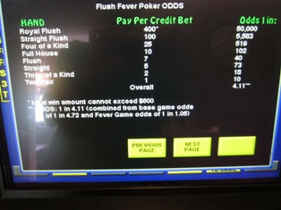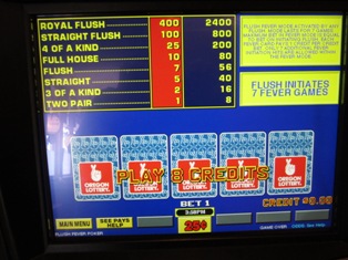 2011年6月21日,我在俄勒冈州菲洛马斯的Figaro's披萨店看到了一款电子扑克游戏——Flush Fever。游戏是在一台IGT Game King的机器上玩的,机器顶部的标题是“Video Lottery”(视频彩票)。虽然这款游戏由俄勒冈州彩票局运营,但根据俄勒冈州的博彩法规,其发牌方式和内华达州一样公平随机。具体来说,就是177-200-0070号法规。