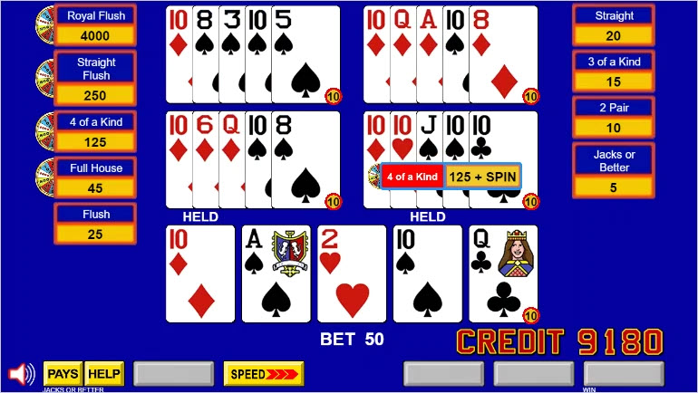 对于百搭牌游戏,玩家必须拿到看起来像自然葫芦或更好的牌。例如,在 Deuces Wild 中,QQQ22 有资格获得奖励,但 QQ882 则不符合条件。在 Joker Wild 中,玩家必须拿到自然牌才能获得奖励旋转。