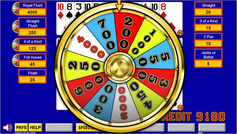 满堂彩加轮盘扑克是一种视频扑克游戏,玩家在任何一手牌中拿到满堂彩或更好的牌时,即可旋转奖励轮盘。它是多玩游戏的可选功能,玩家可以玩3、5或10次。要激活此功能,玩家每次游戏必须支付10个积分,其中5个积分即可激活。