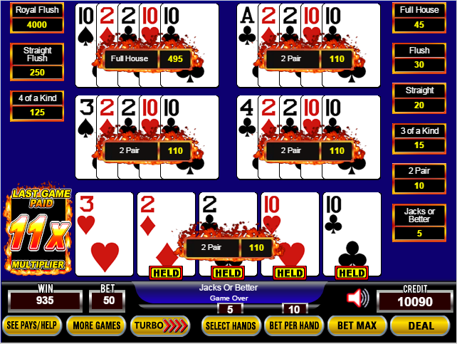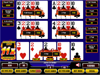 我手上有两对,其中一副变成了葫芦。在我玩的9-6 Js or Better游戏中,两对的赔率为2倍,葫芦的赔率为9倍。每线下注5个硬币,乘数为11。所以,总奖金为5×11×(4×2 + 1×9) = 55 × 17 = 935个硬币。