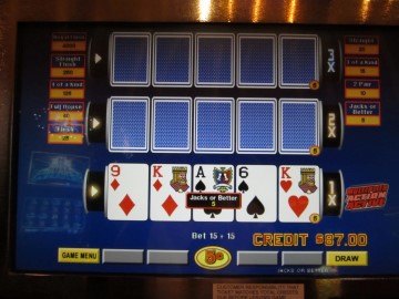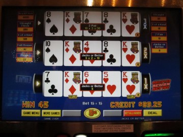 在抽牌中,我拿到了顶手牌,也就是两对,在我玩的游戏中赔率为2倍。加上3倍乘数和5个硬币的下注,顶手牌的赢利是3 × 2 × 5 = 30。