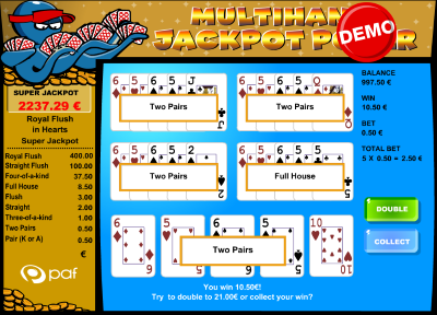 累积奖金扑克是Paf 赌场推出的一种视频扑克游戏。它的赔率表比较特殊,从一对 K 开始,但没有百搭牌。游戏中,如果出现一对 J 或 Q,则无法赢钱,但葫芦、四条和同花顺则可获得高额赔付。此外,如果出现红桃同花顺,还可以获得累积奖金。