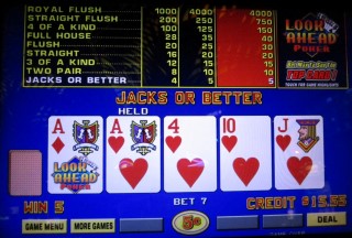 在传统的视频扑克中,这种情况的正确玩法是保留A和J。然而,我知道下一张牌是方块A,所以我选择只保留红桃A。